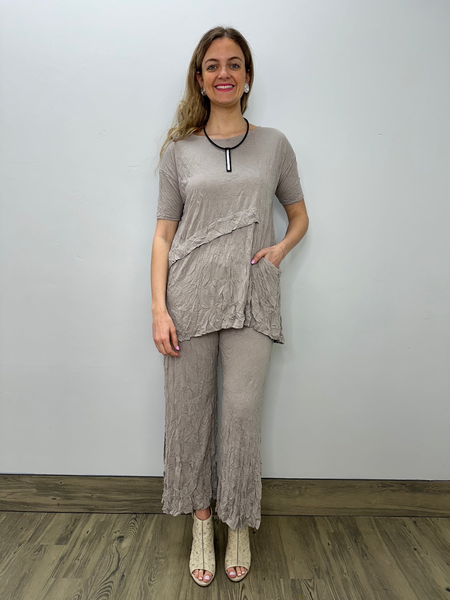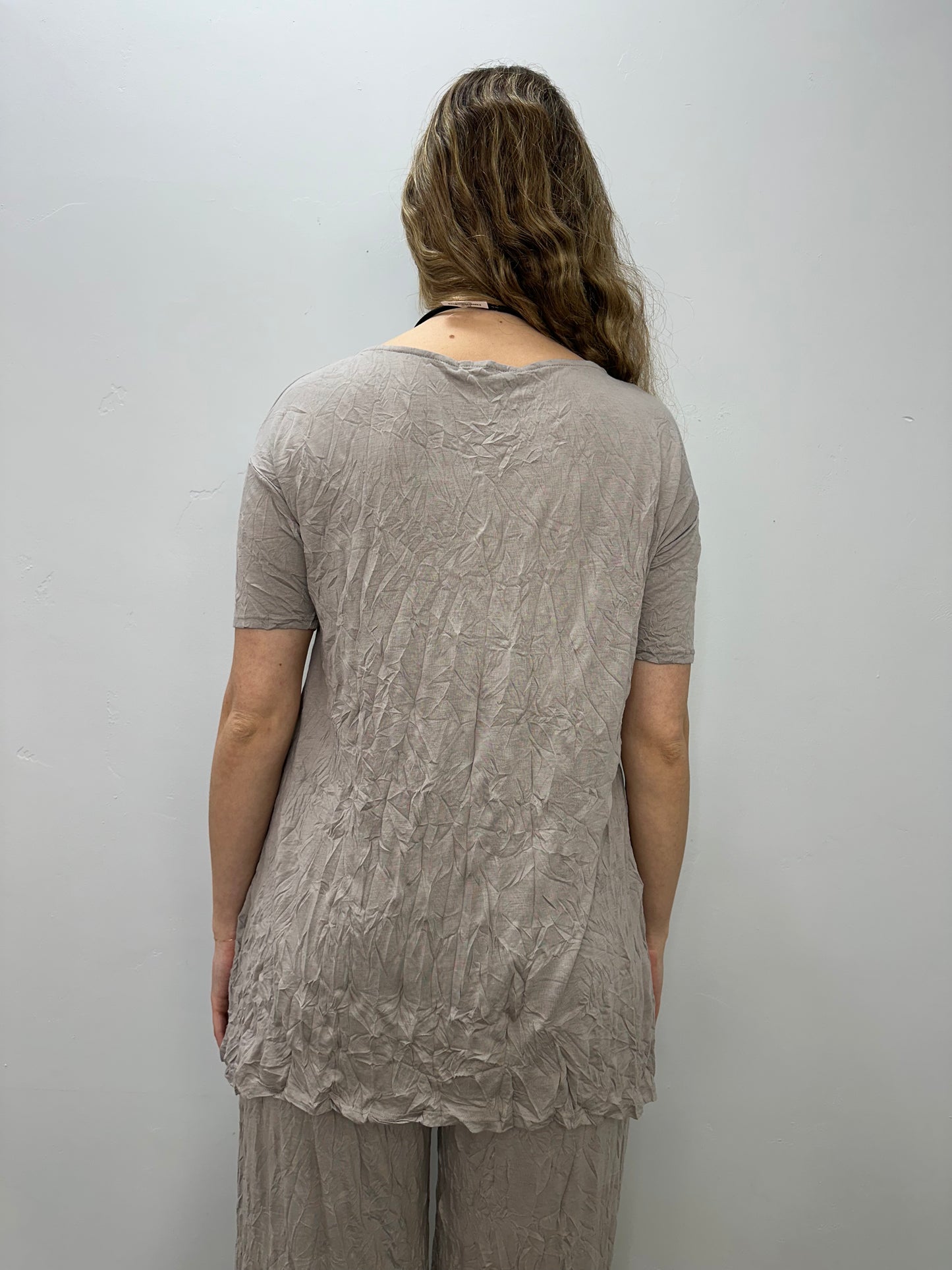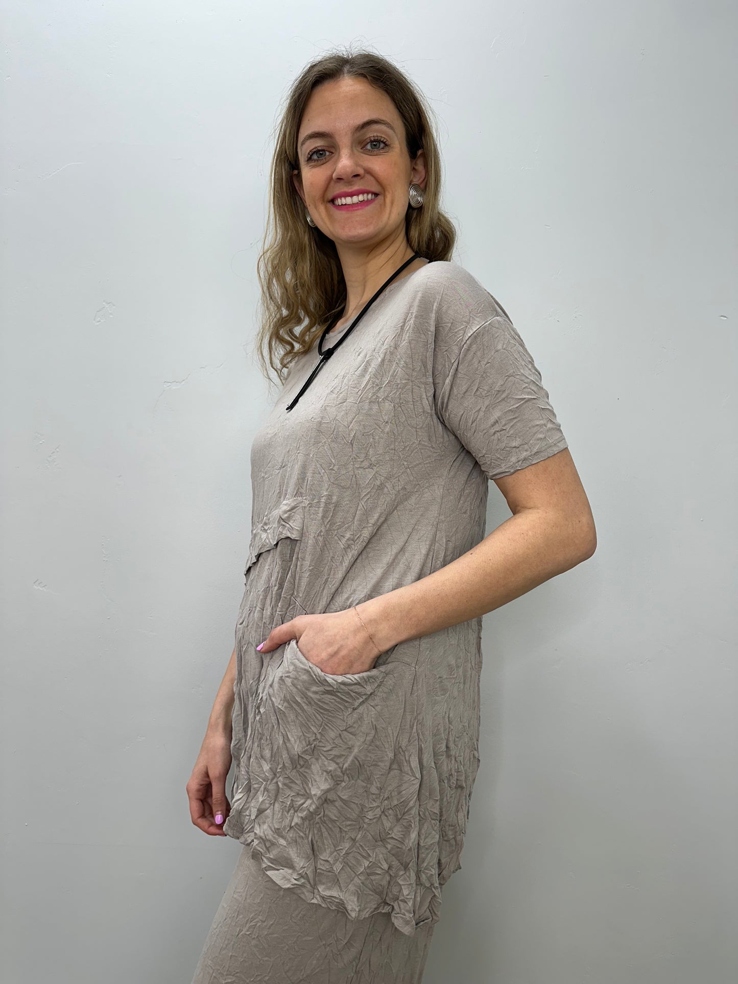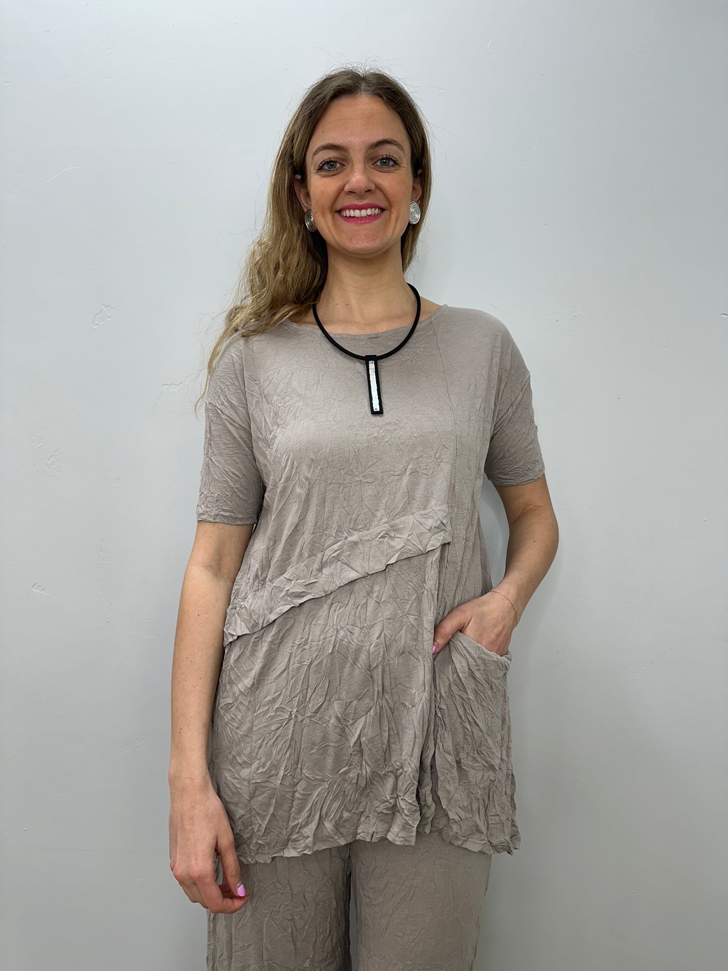 Regular price $90.30Time to get jolly for the short-sleeved Holly Tunic. Carrying a boxy fit and a beautiful mid body cross pleat detail highlights your figure and elevates style. The SharkBite hem perfects this garment to match its in-seam front pocket, only adding to its specialty material of travel friendly recycled crinkle jersey fabric.