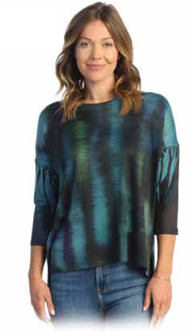 Stay stylish in our Reflections Slinky Knit Tunic! This flattering 3/4 sleeve top features a sleekly cut tunic with a very cool fabric. Its eye-catching teal pattern will have you shining with chic confidence. Get yours now for a look that's sure to turn heads!