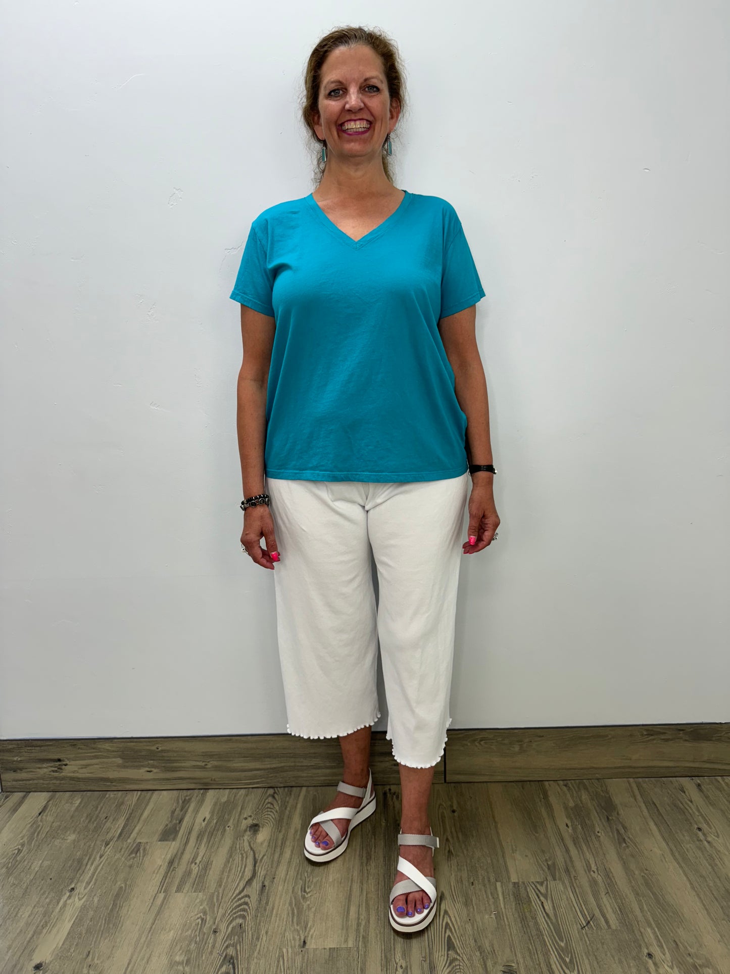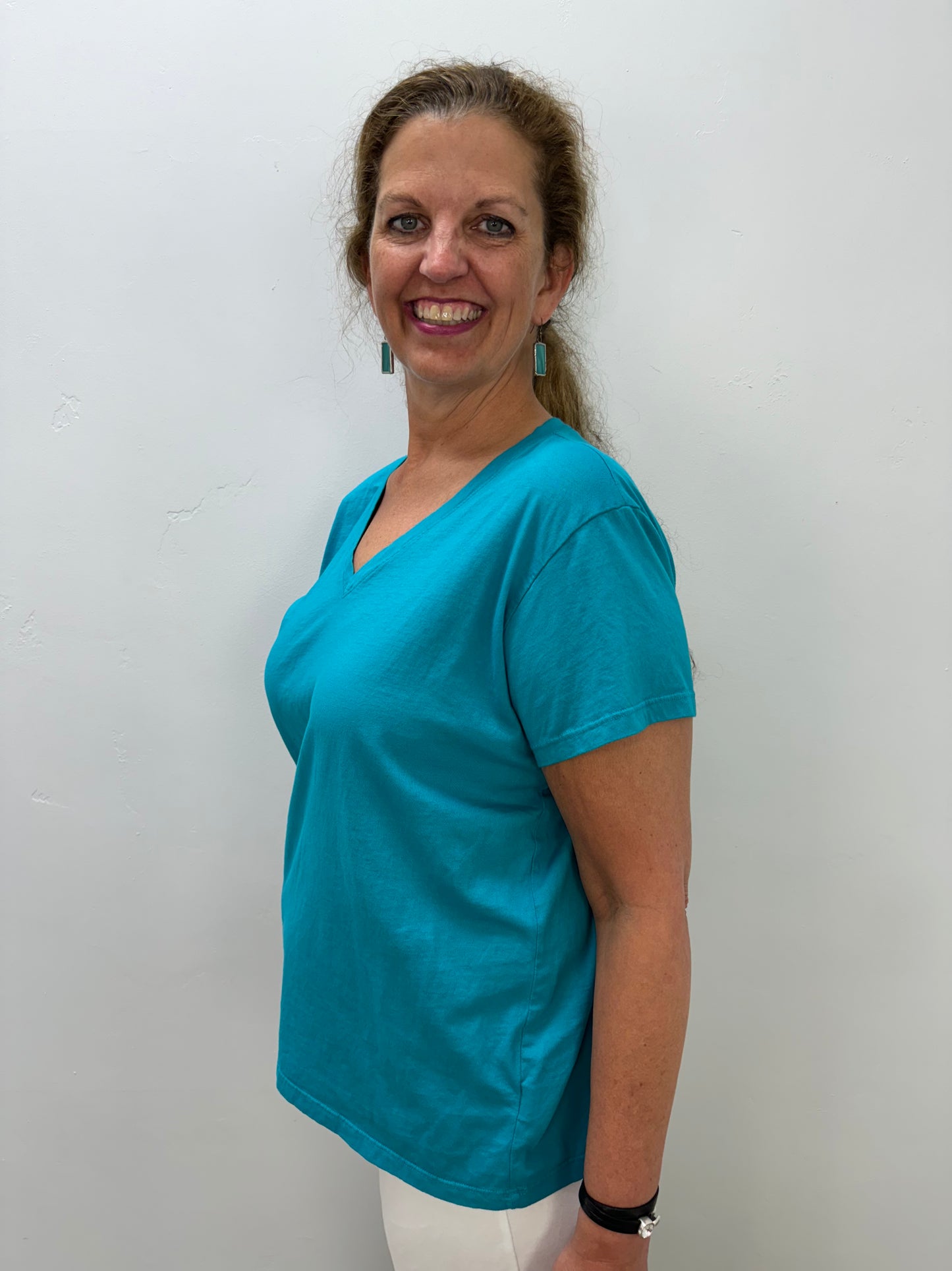 Regular price $47.20Experience ultimate comfort in our Relaxed Tropical Short Sleeve V Neck Top! Made in the USA, this top features a v neck design and a gorgeous teal color. Perfect for a relaxed yet stylish look.
