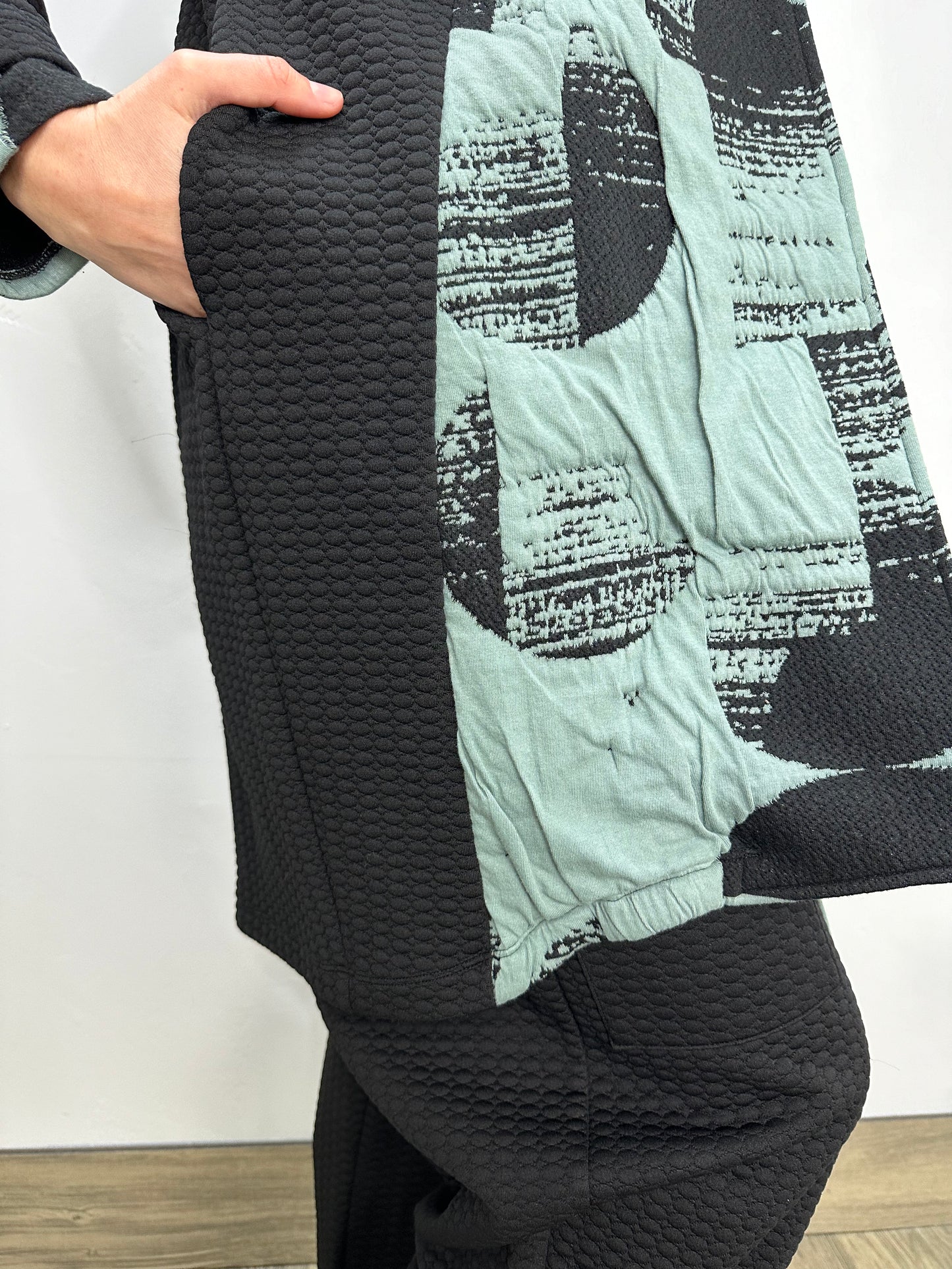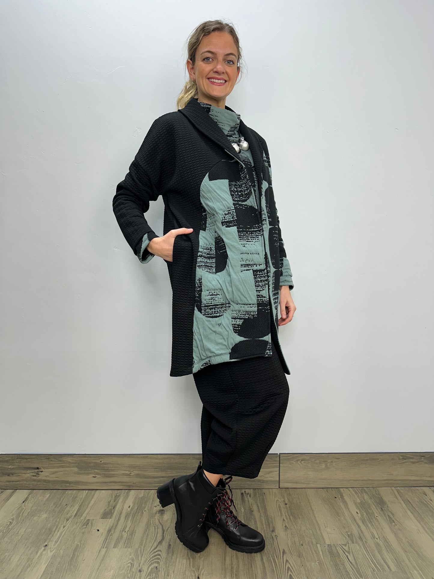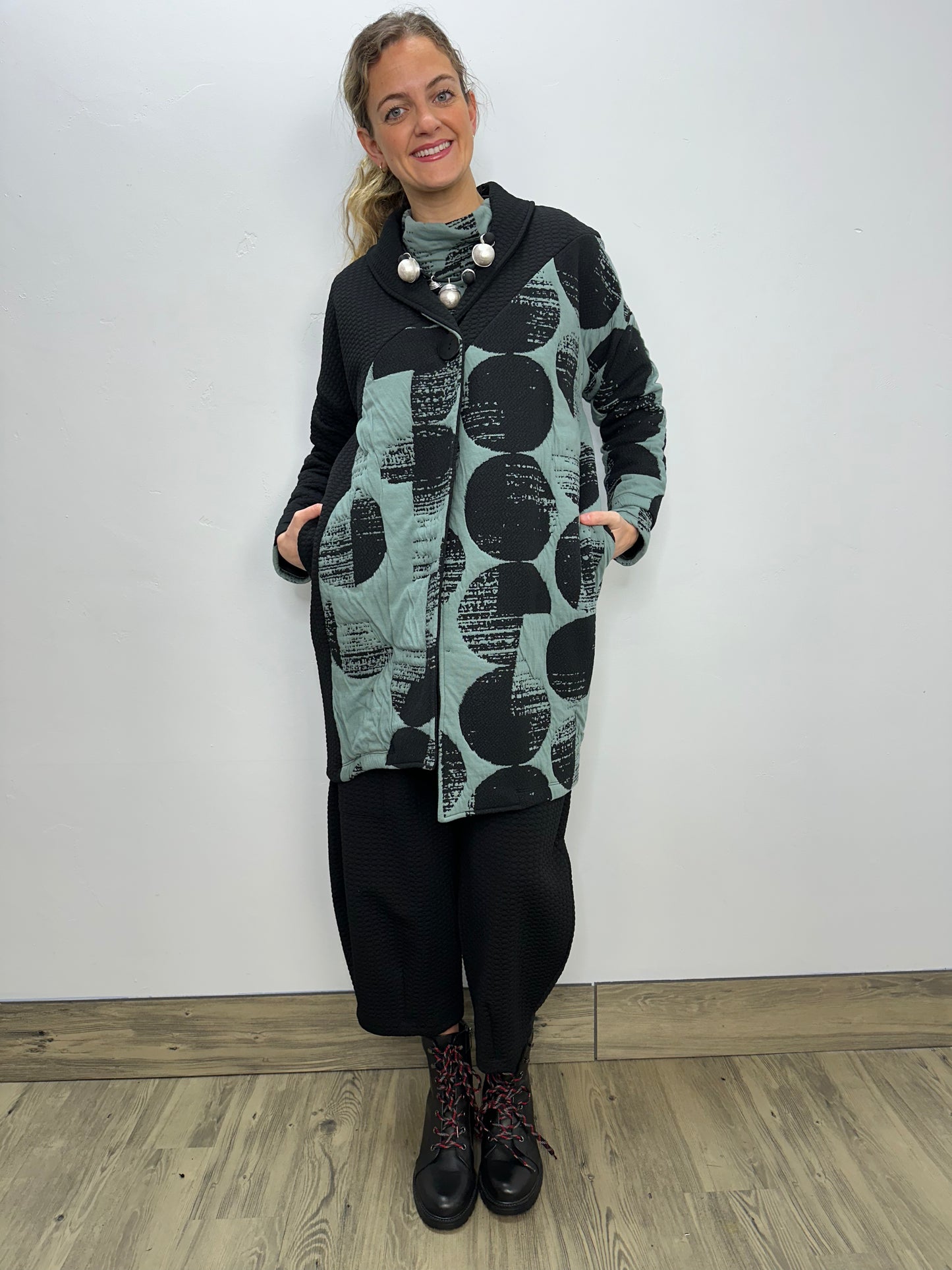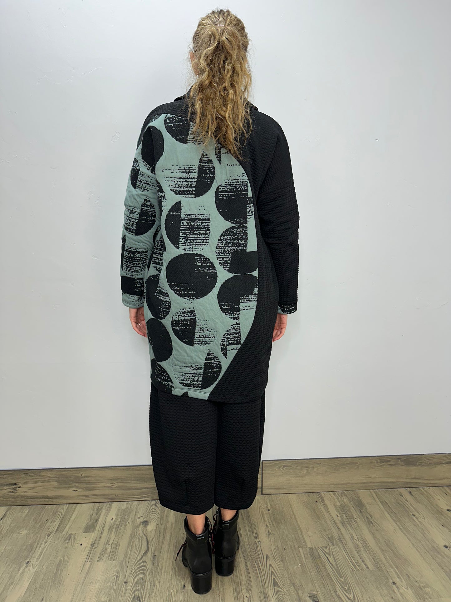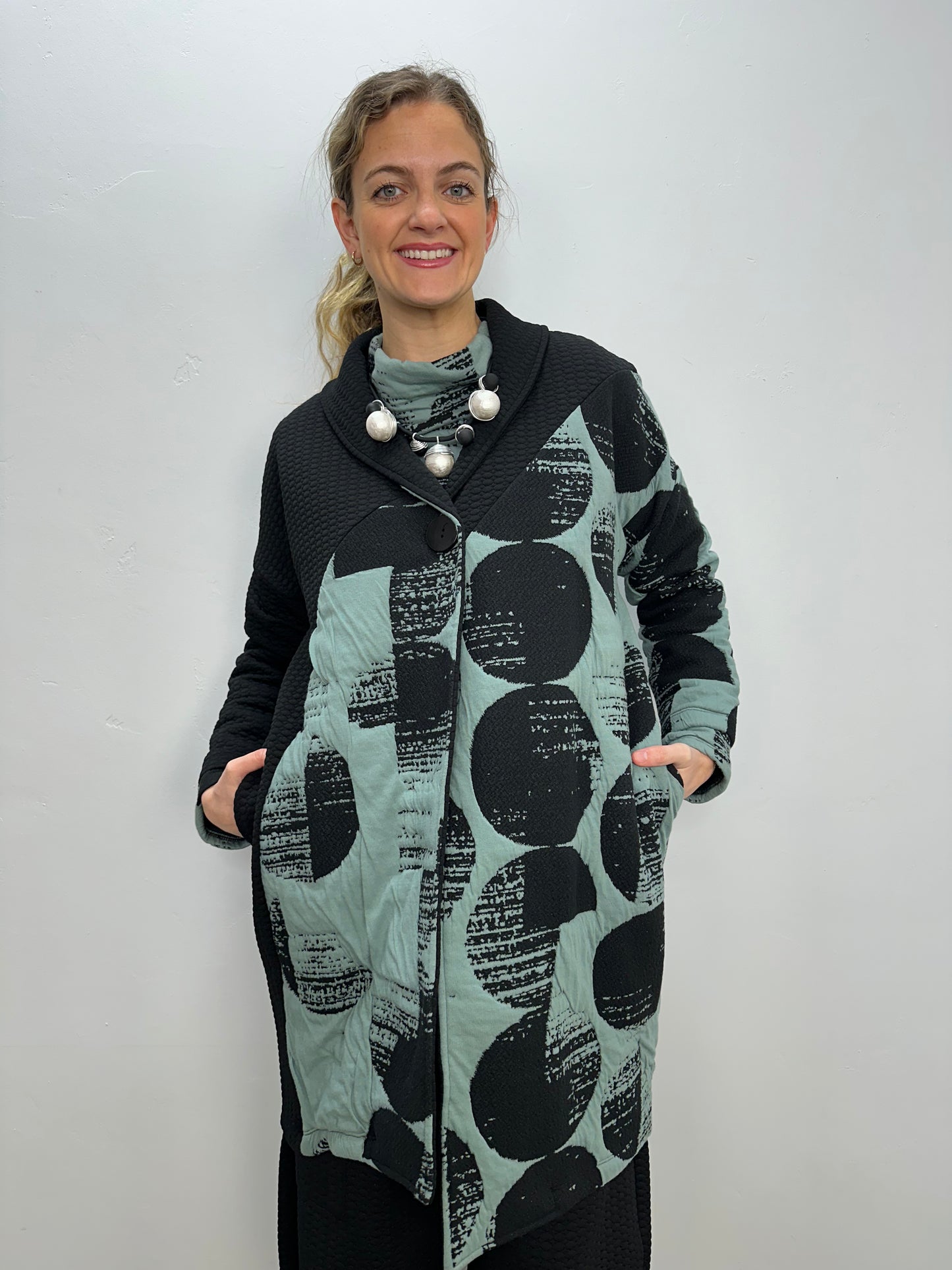 Regular price $195.30The long-sleeved drop shoulder buttoned coat is bound to be your favorite garment of the season. As you stay cozy with side in seam pockets, its intricate design of an asymmetric hem in a boxy fit and shawl collar beautifully marries with the sweeping upper body black dot contrast in our puff jacquard fabric.