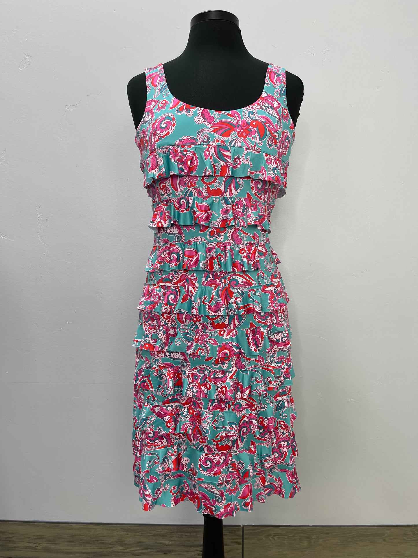 The fun Tango Mango ruffle dress is designed with a flattering close fitting silhouette and is true to size.