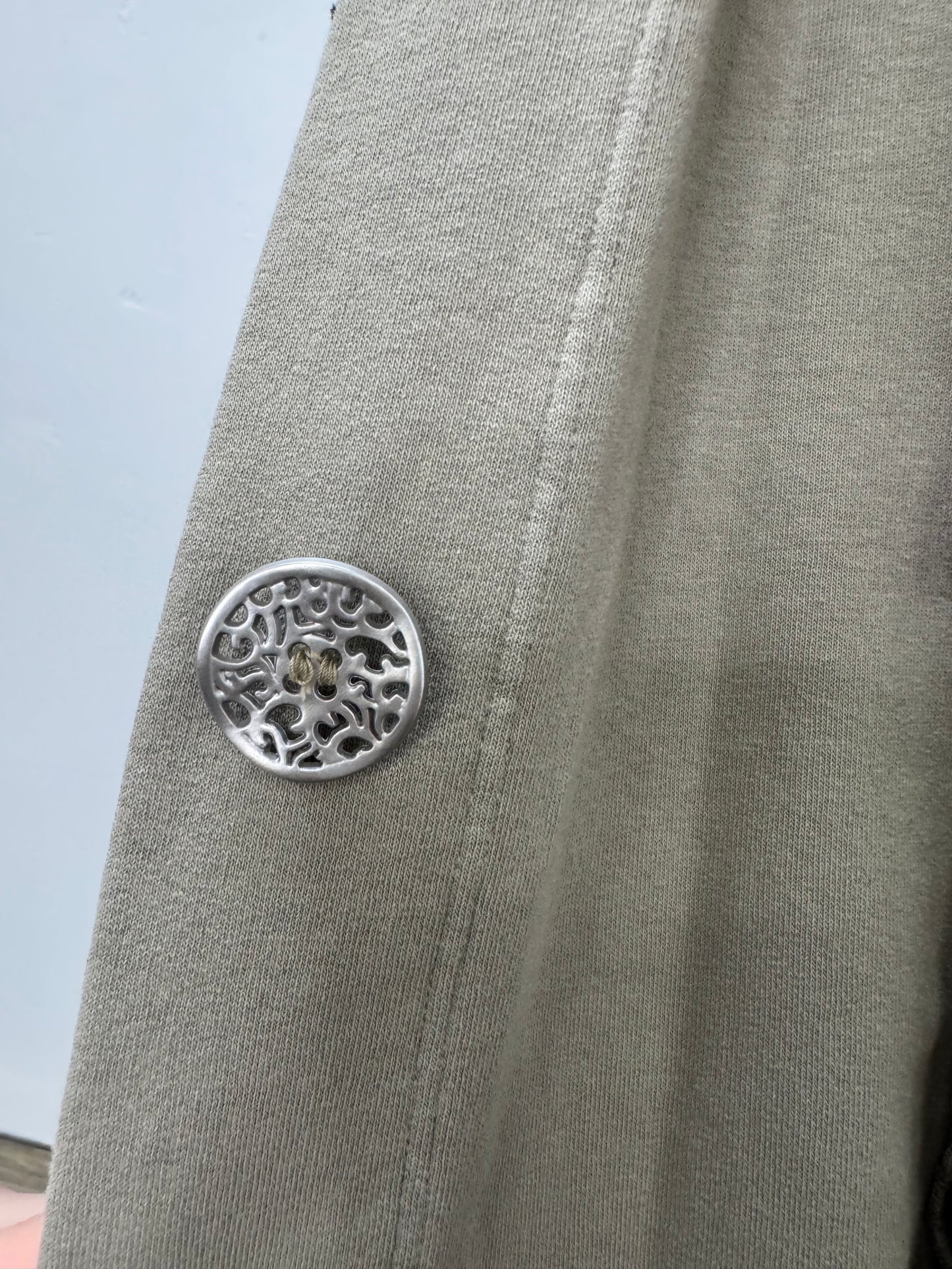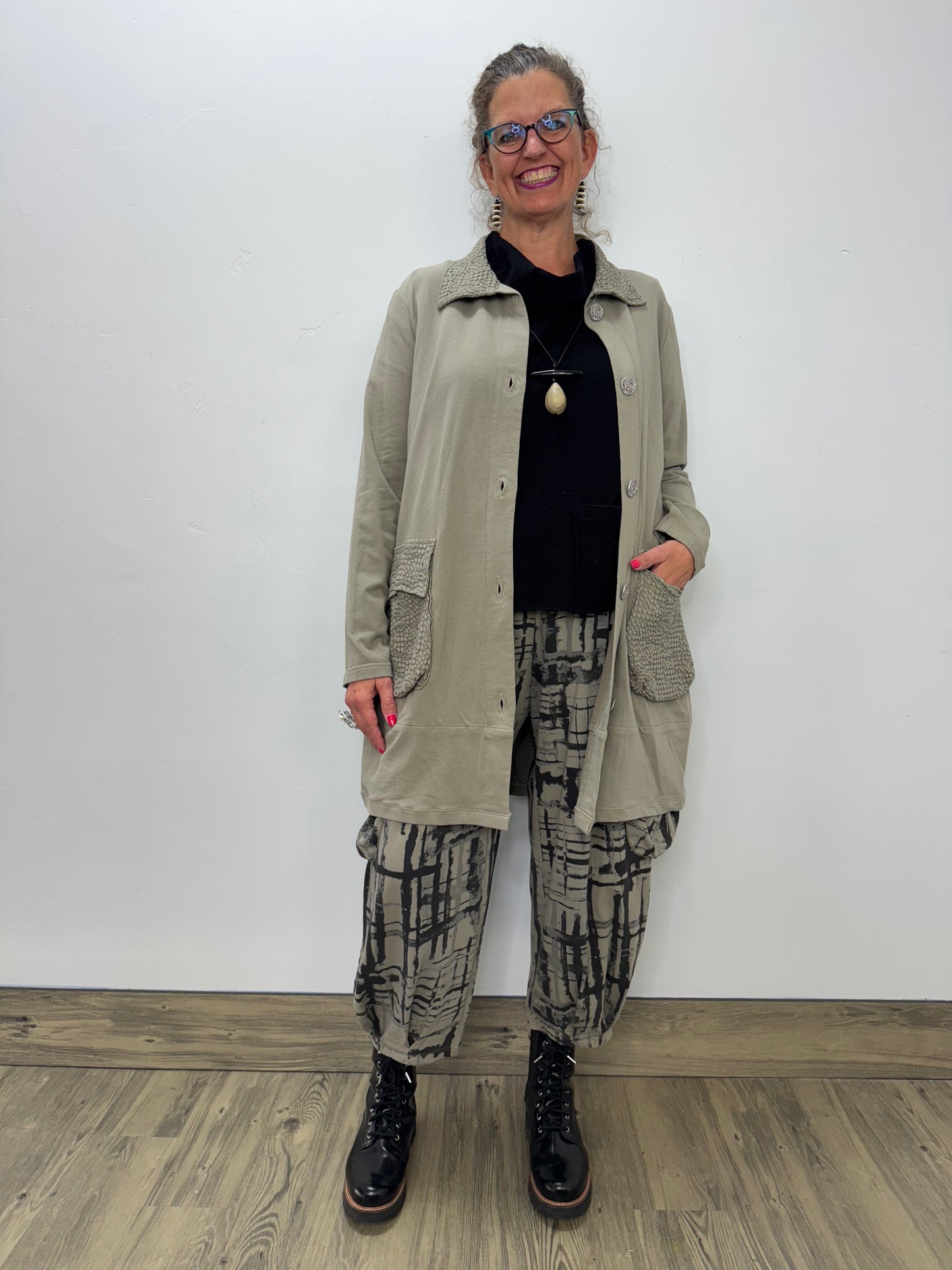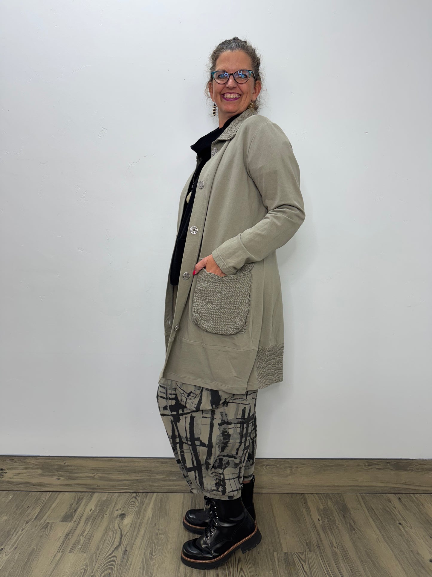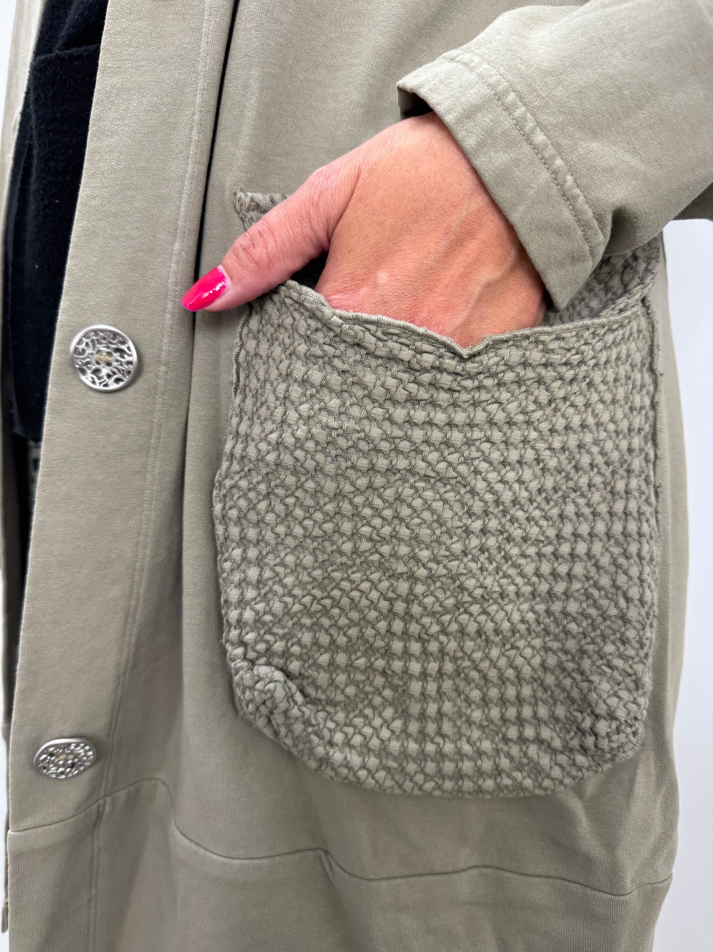 Regular price $132.30Introducing the new and improved Bee Coat! Wrap yourself in style and warmth with our Fenini Vine Grey Green Patch Button Down Coat! Made with luxuriously soft fabric, this coat features 5 metal buttons, two accent pockets, and a matching collar. Keep your essentials close at hand while making a fashion statement.