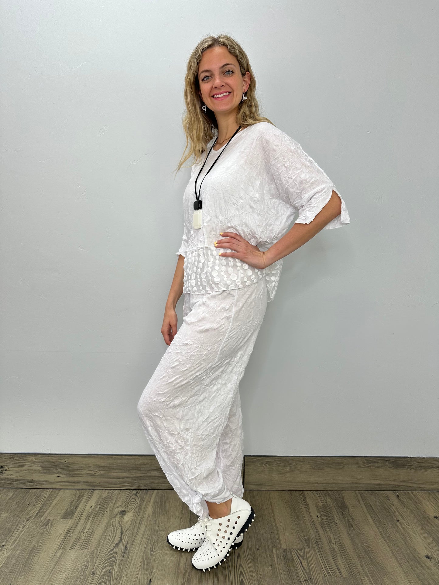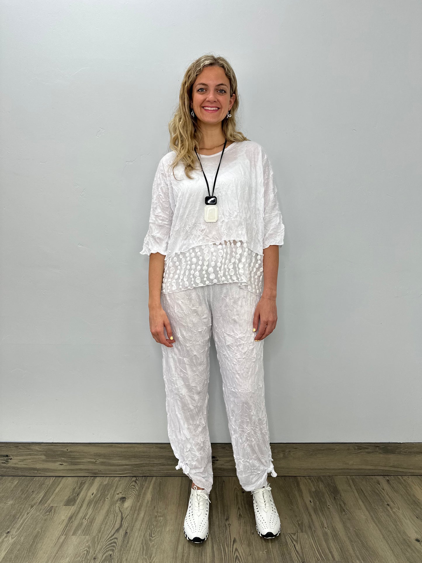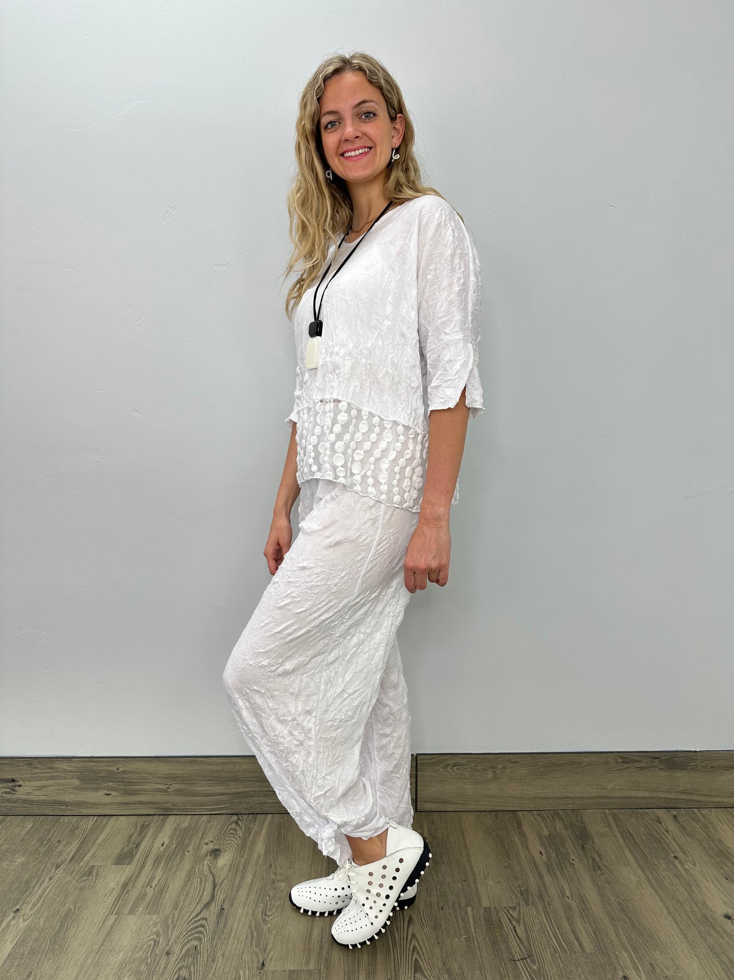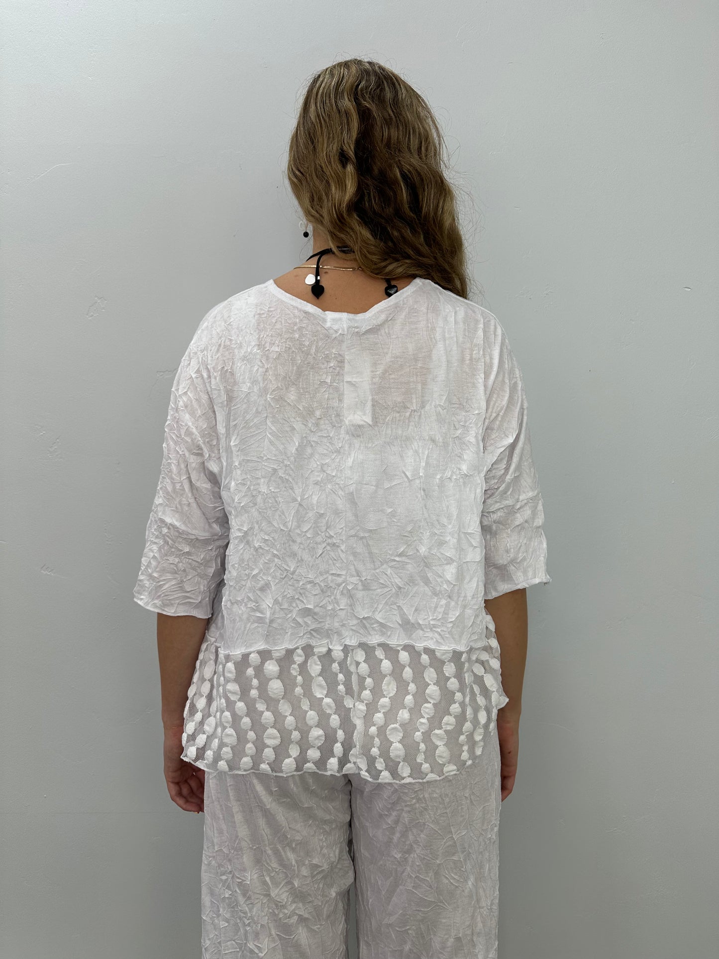 Regular price $77.60Introducing the White Mesh Dots 3/4 Sleeve Tee - the perfect blend of style and comfort. The crinkle fabric adds a unique texture while the 3/4 sleeve and mesh dots panel along the bottom elevate the look. With its flowy and comfortable fit, this tee is a must-have for any wardrobe.