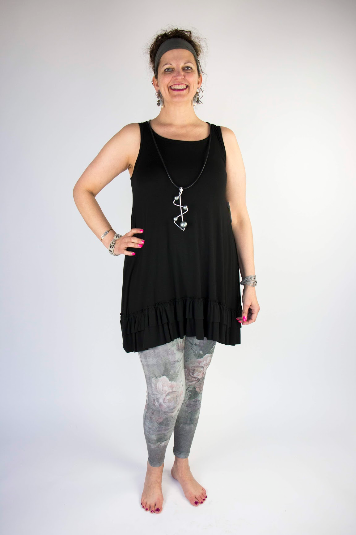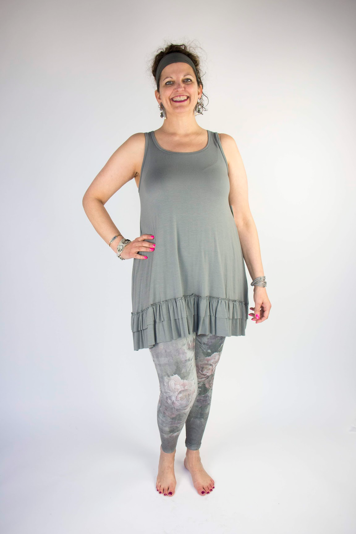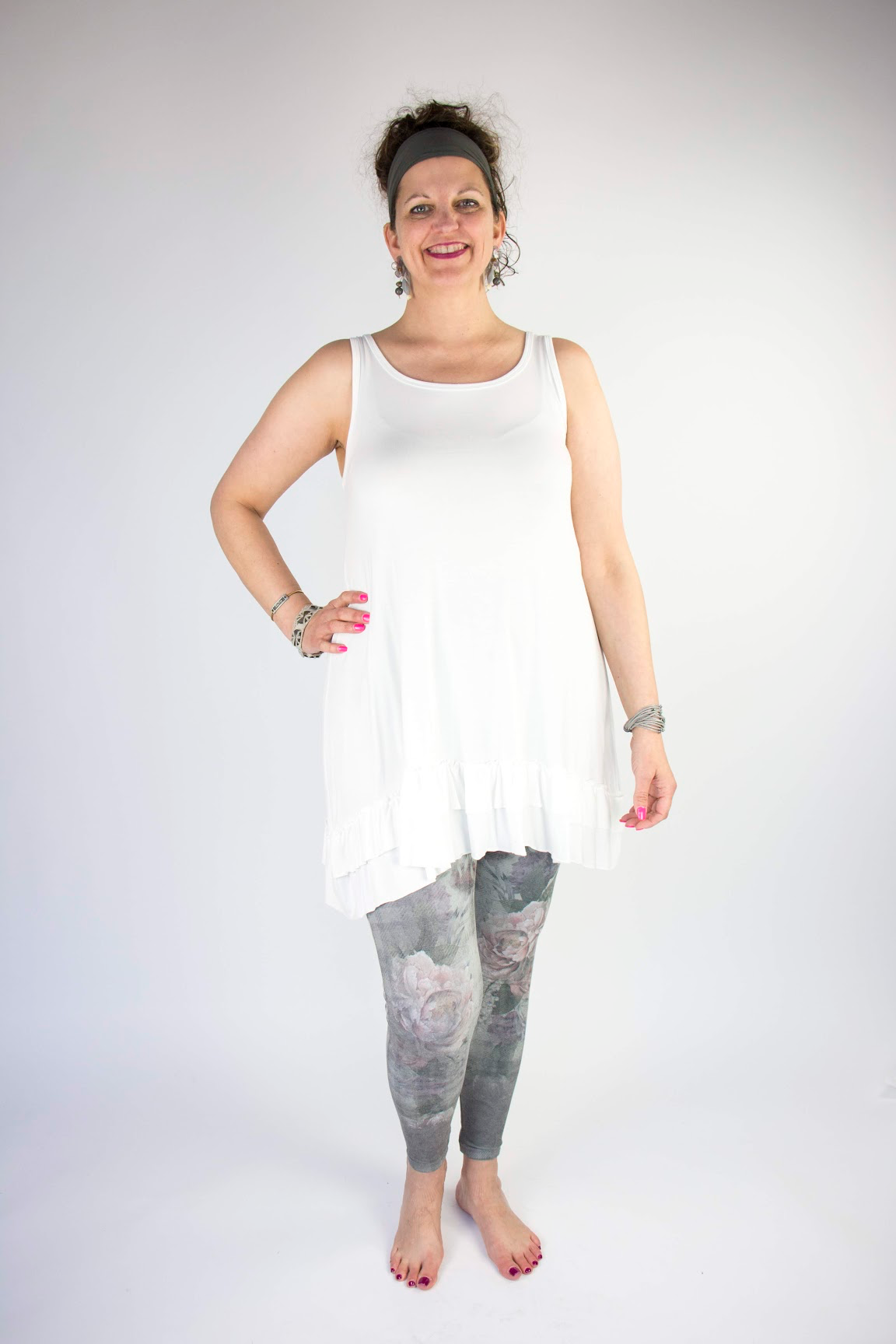 This Twist designed double ruffle hem adds dimension and distinction to your outfit. The soft modal fabric wraps you comfortably regardless of your activity. Add some length to your shorter tops and pair perfectly with our wide selection of printed M. Rena leggings.