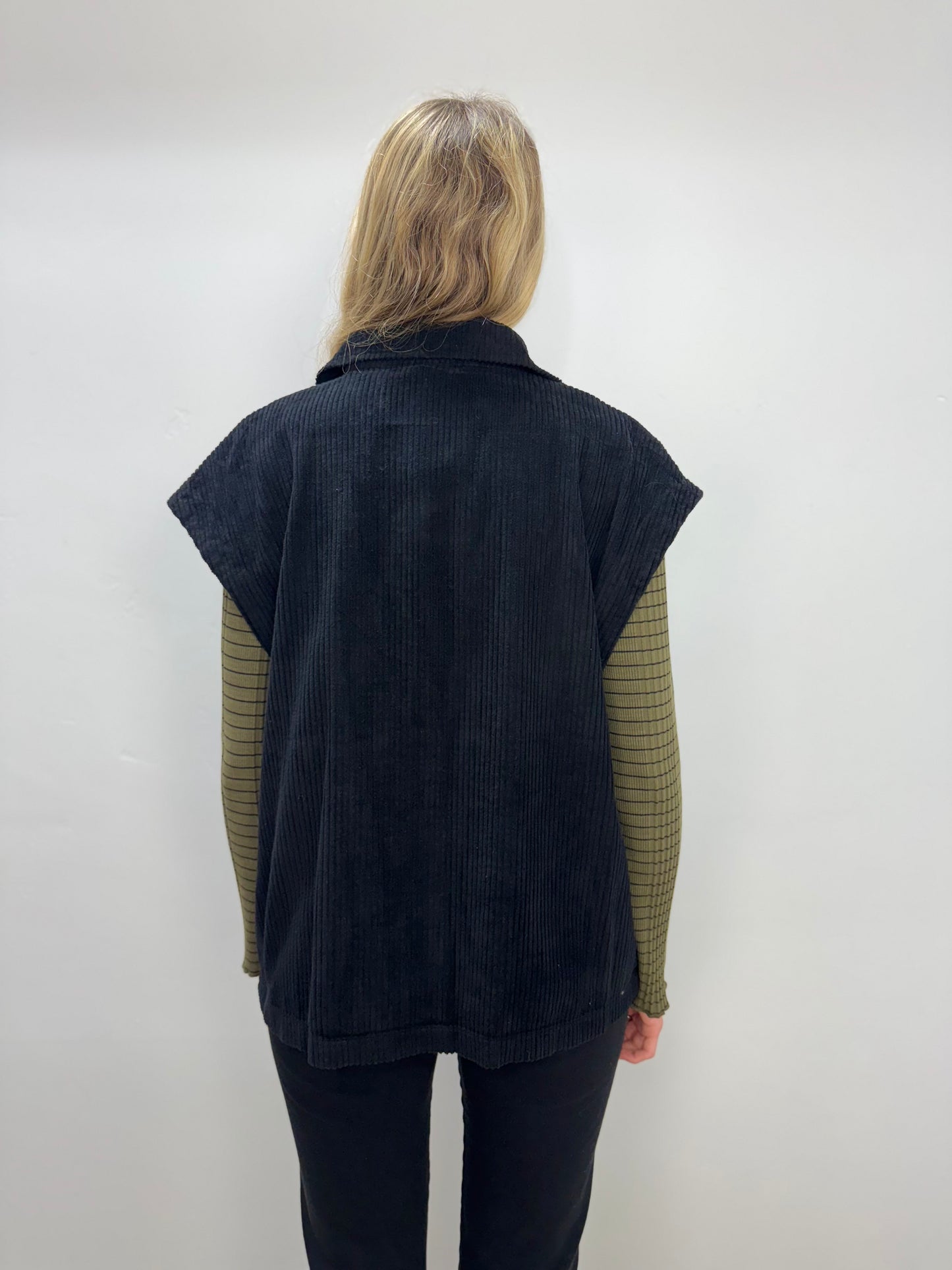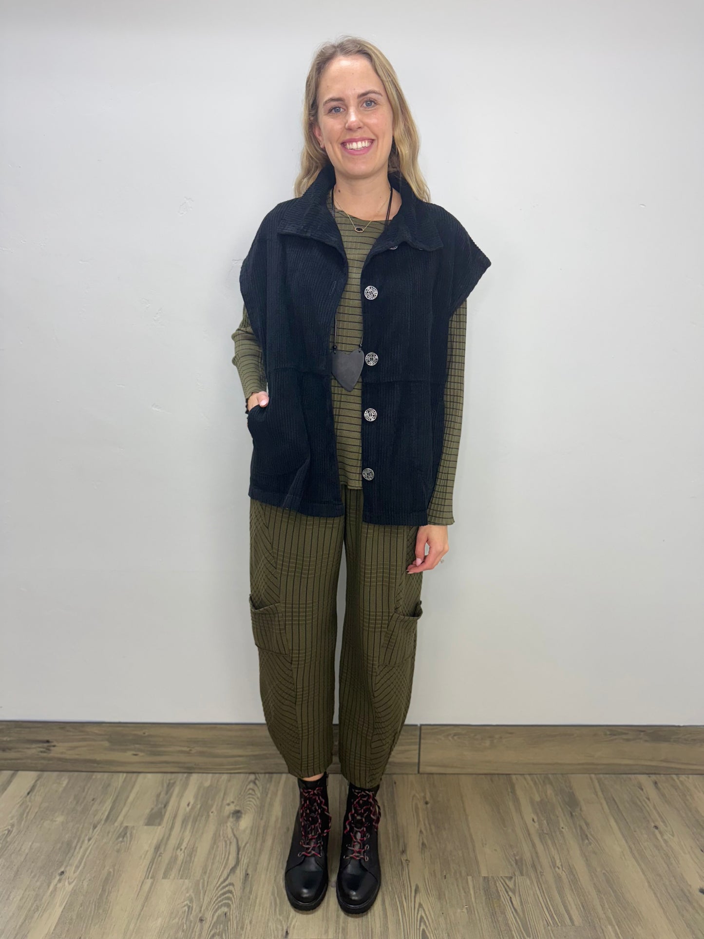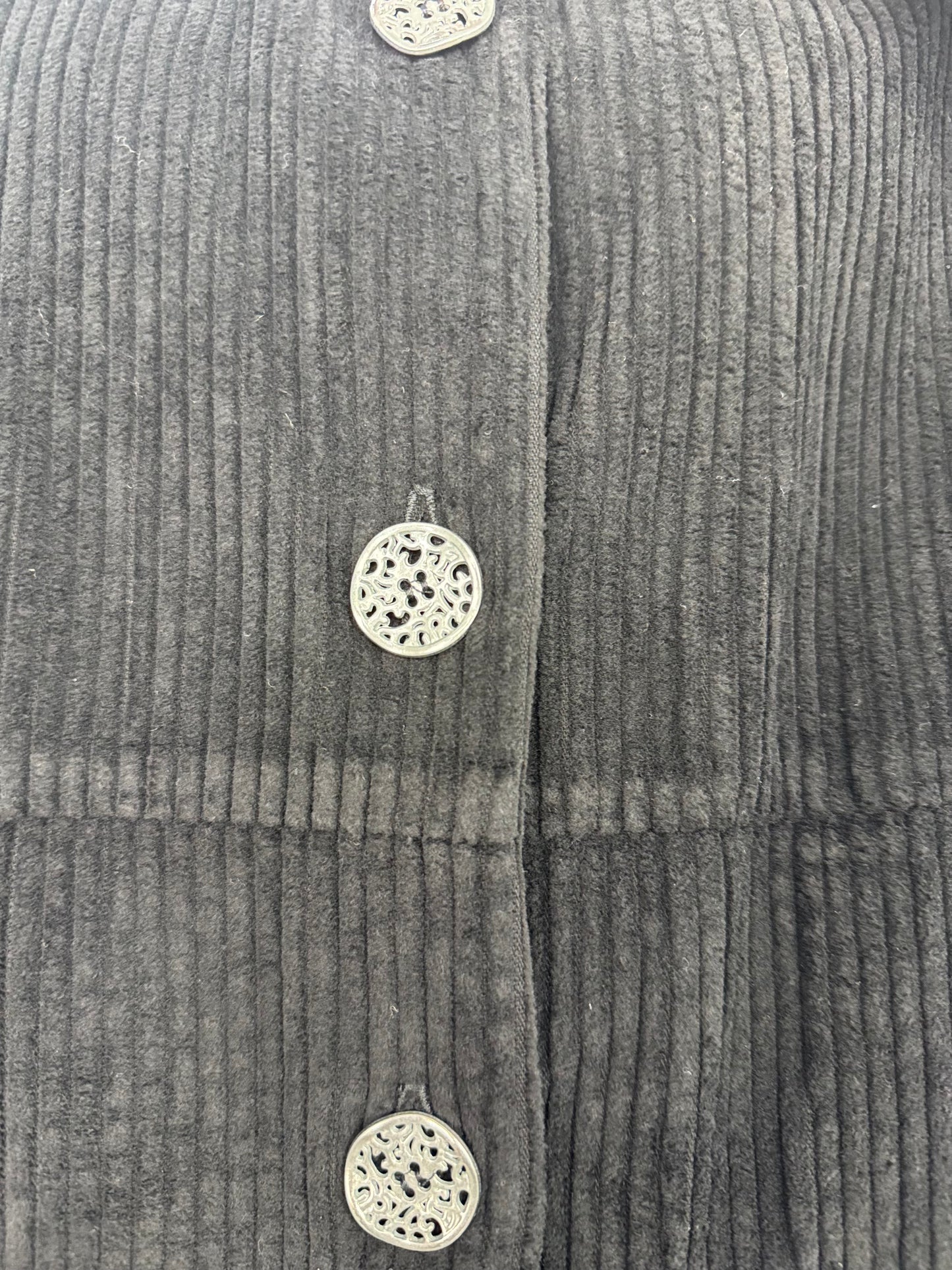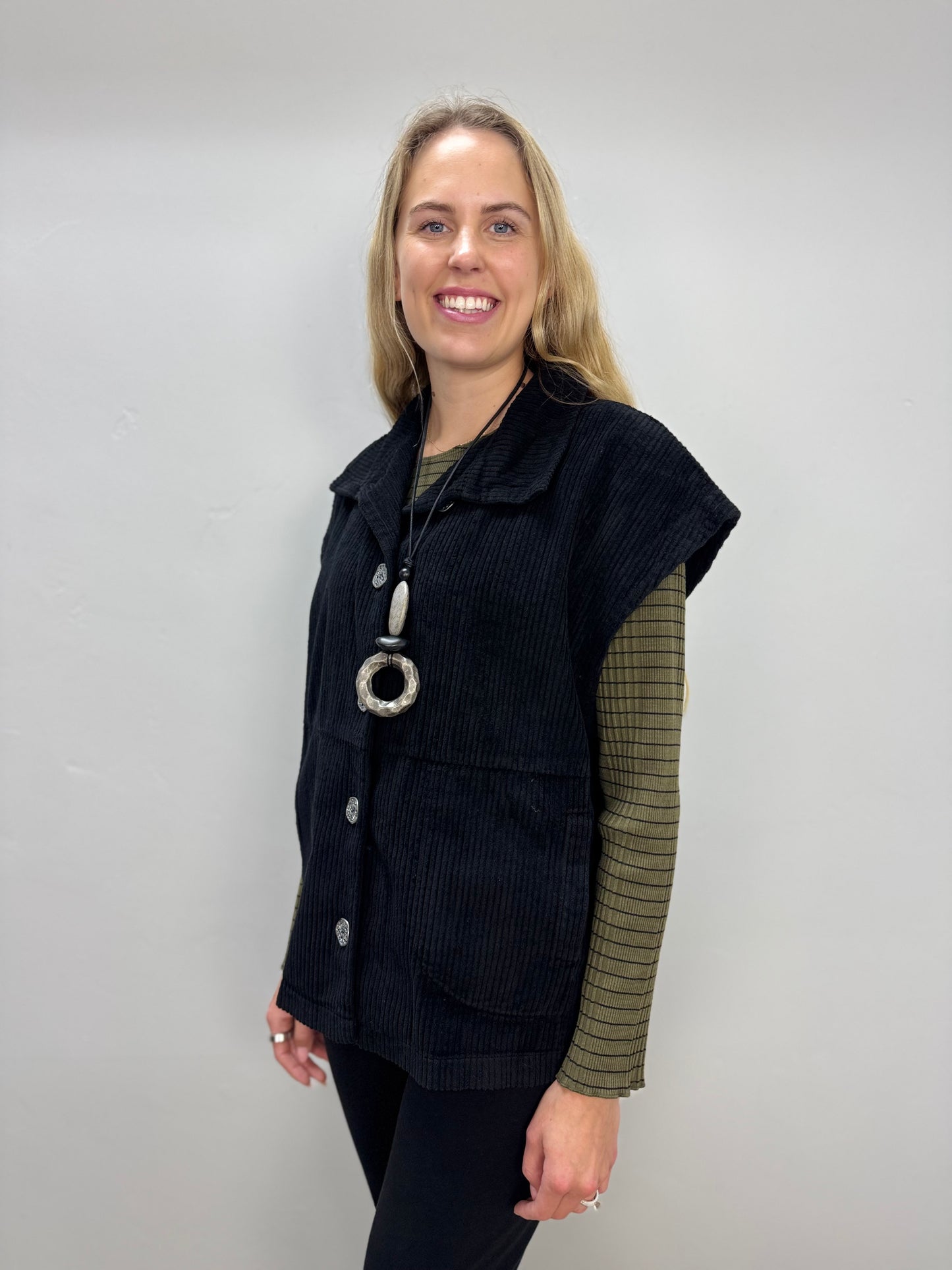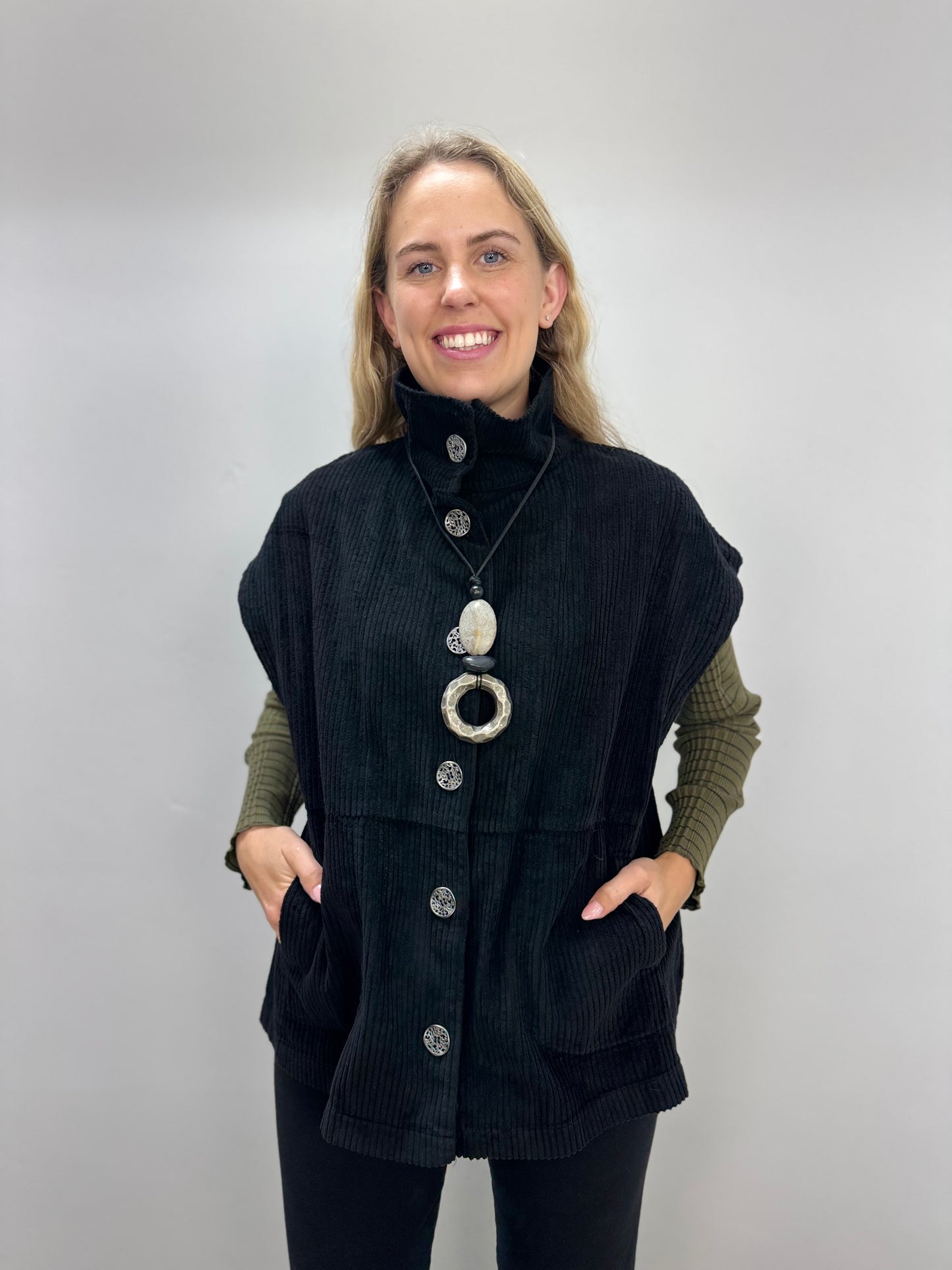 Elevate your layering game with our Black Button Down Corduroy Vest. Featuring two convenient front pockets and secure metal button closures, it combines practicality with timeless style. The button-down design ensures easy wear, while the rich black corduroy adds a classic, versatile touch perfect for any outfit.