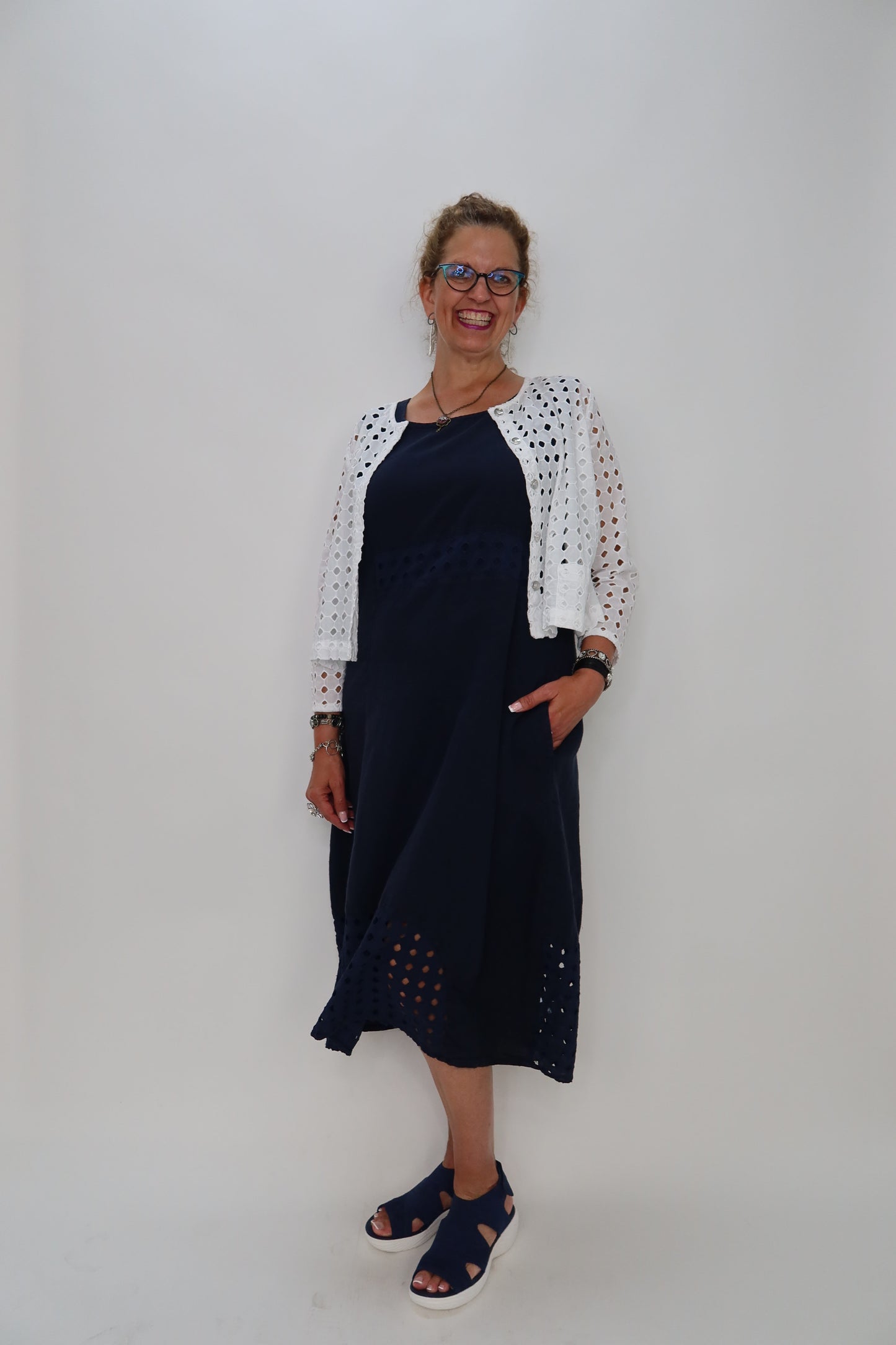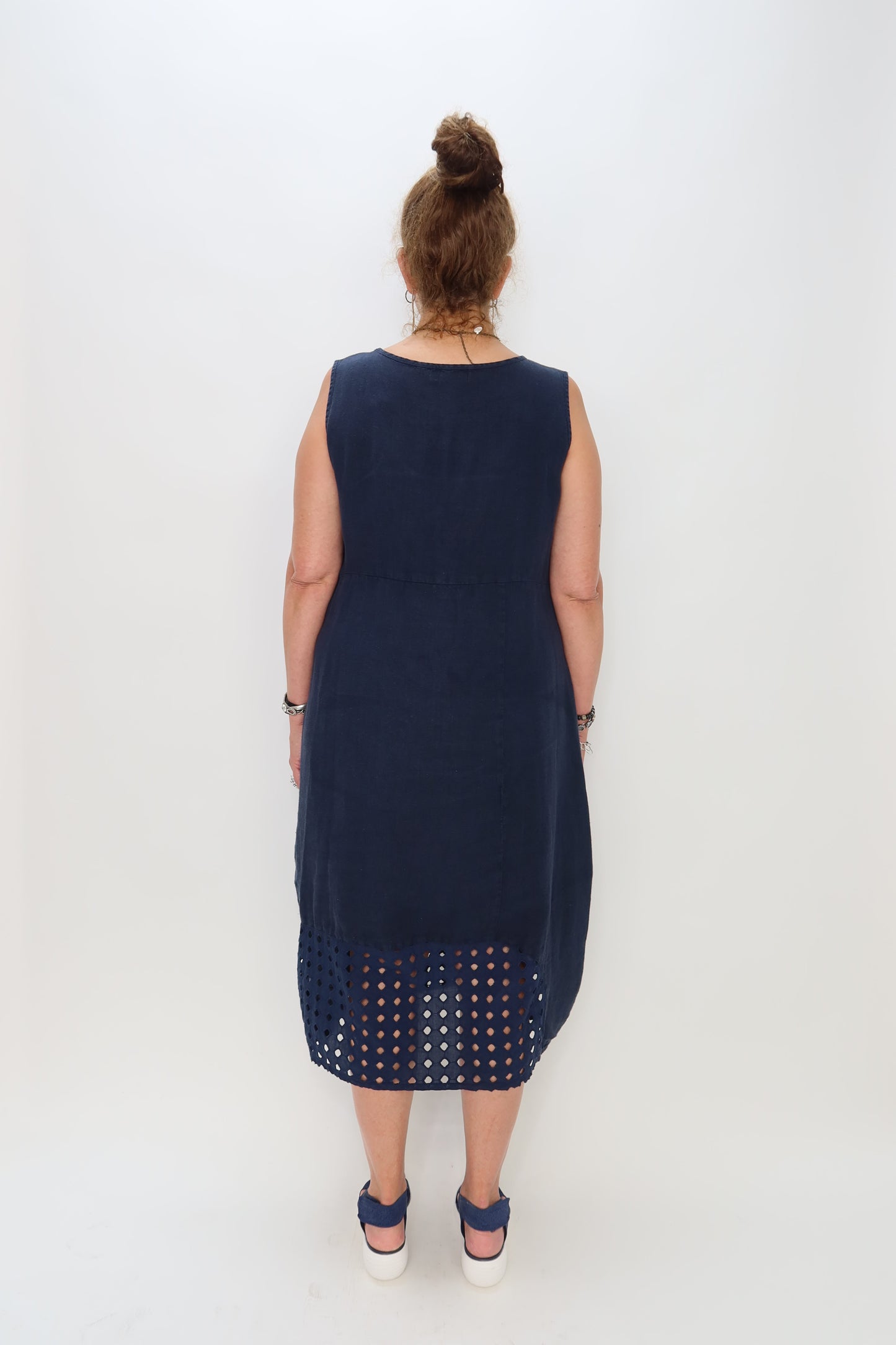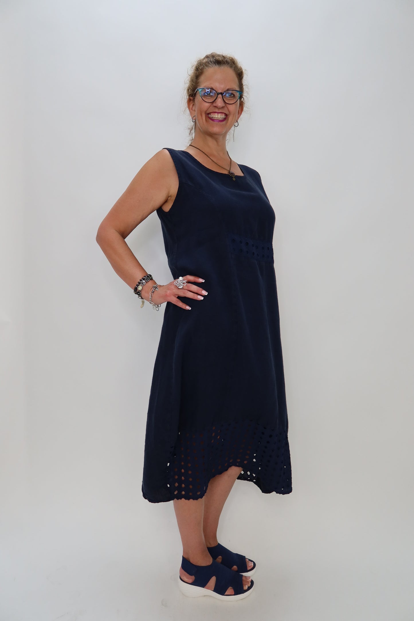 This Ink Navy Sleeveless Linen Eyelet Dress features delicate eyelet detailing across the front and sides, creating a slimming silhouette that flatters your figure. Crafted from 100% breathable linen, it offers lightweight comfort perfect for warm days. Elevate your wardrobe with this effortlessly chic and flattering dress!