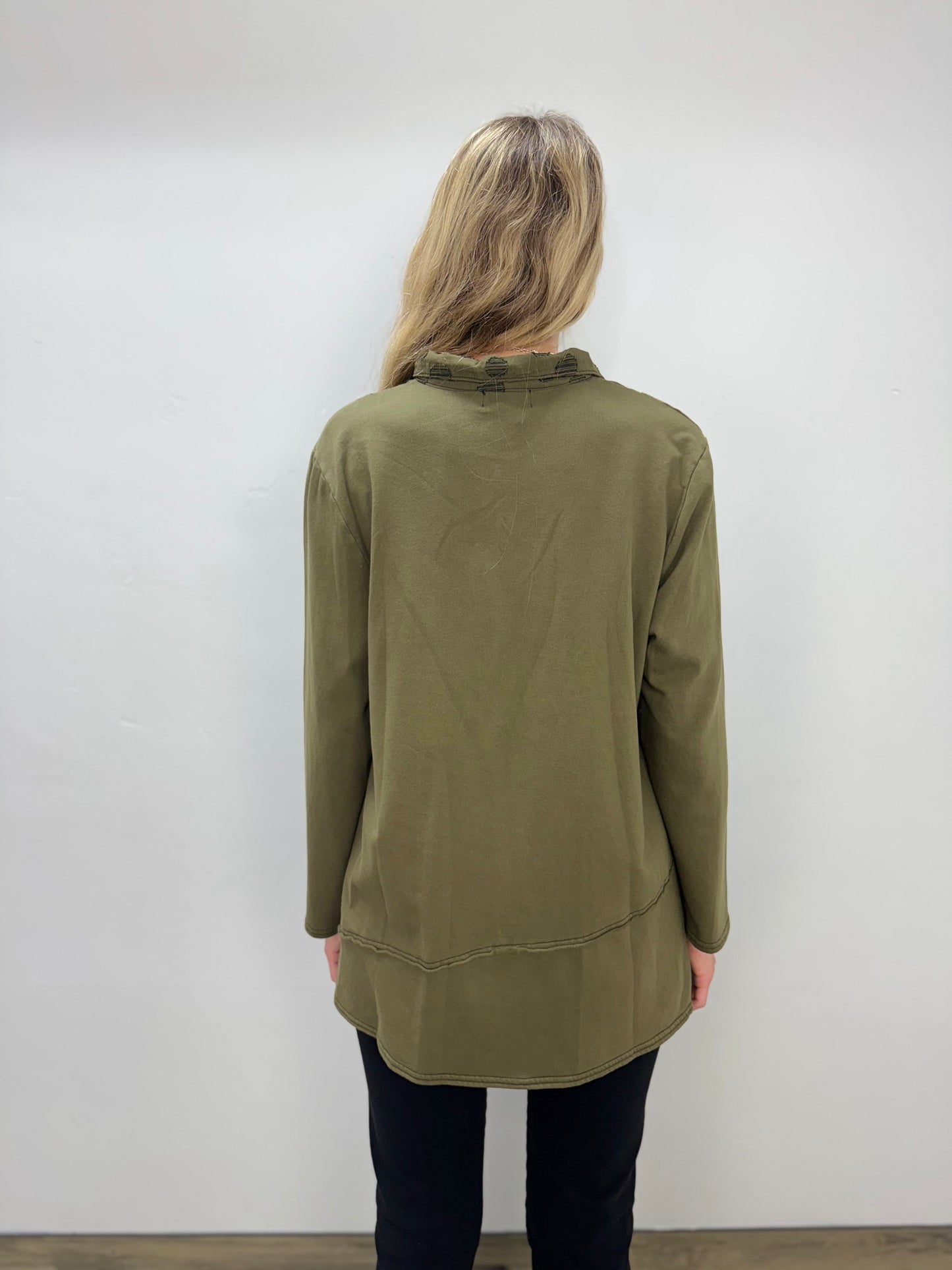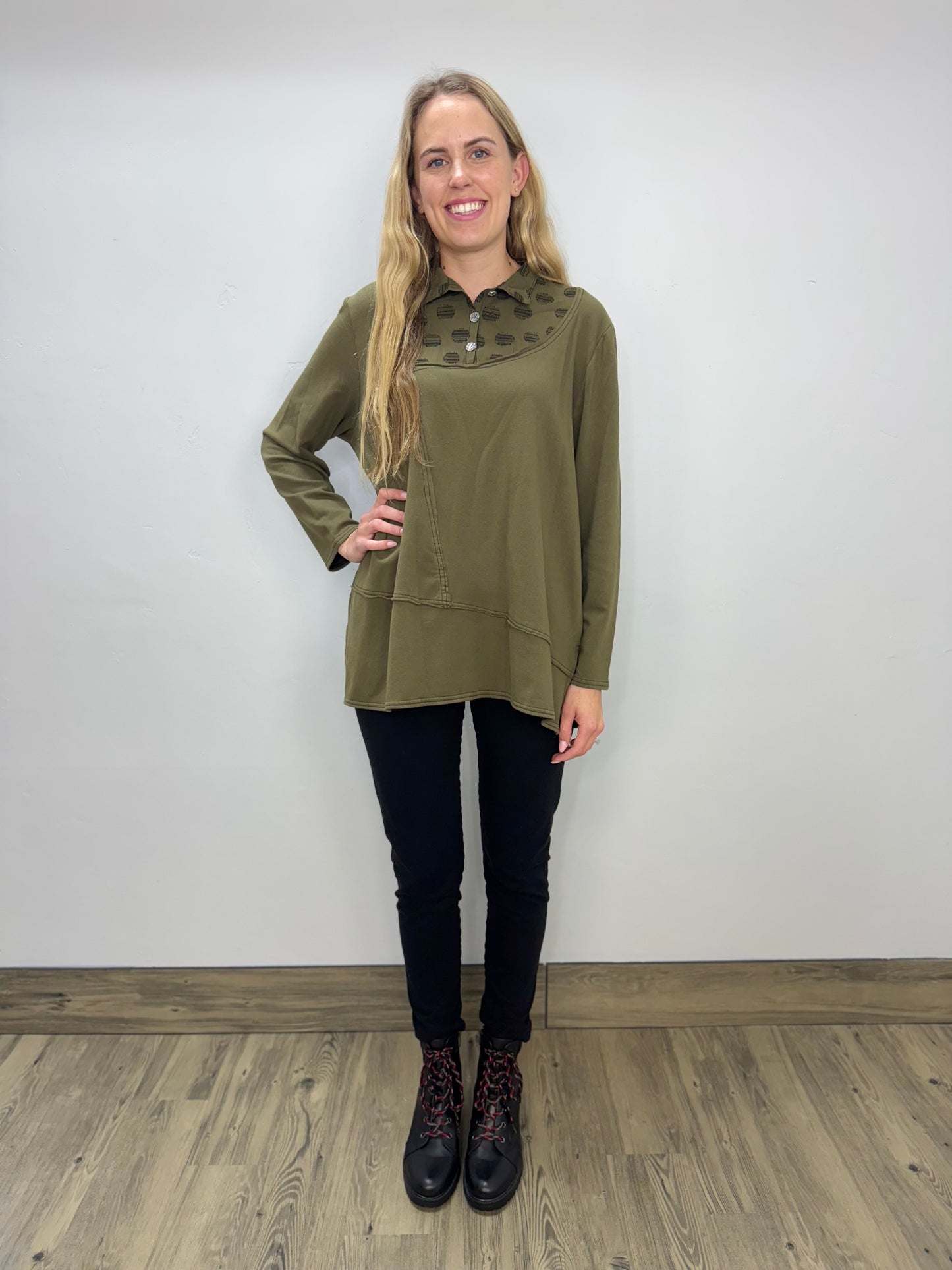 Our Olive Green fleece tunic features flattering asymmetric detailing and a charming polka dot lapel that adds a playful touch. With long sleeves and three buttons on the collar, it offers both style and comfort. Perfectly versatile, it pairs effortlessly with leggings, jeans, or wide-leg pants for a chic, casual look.