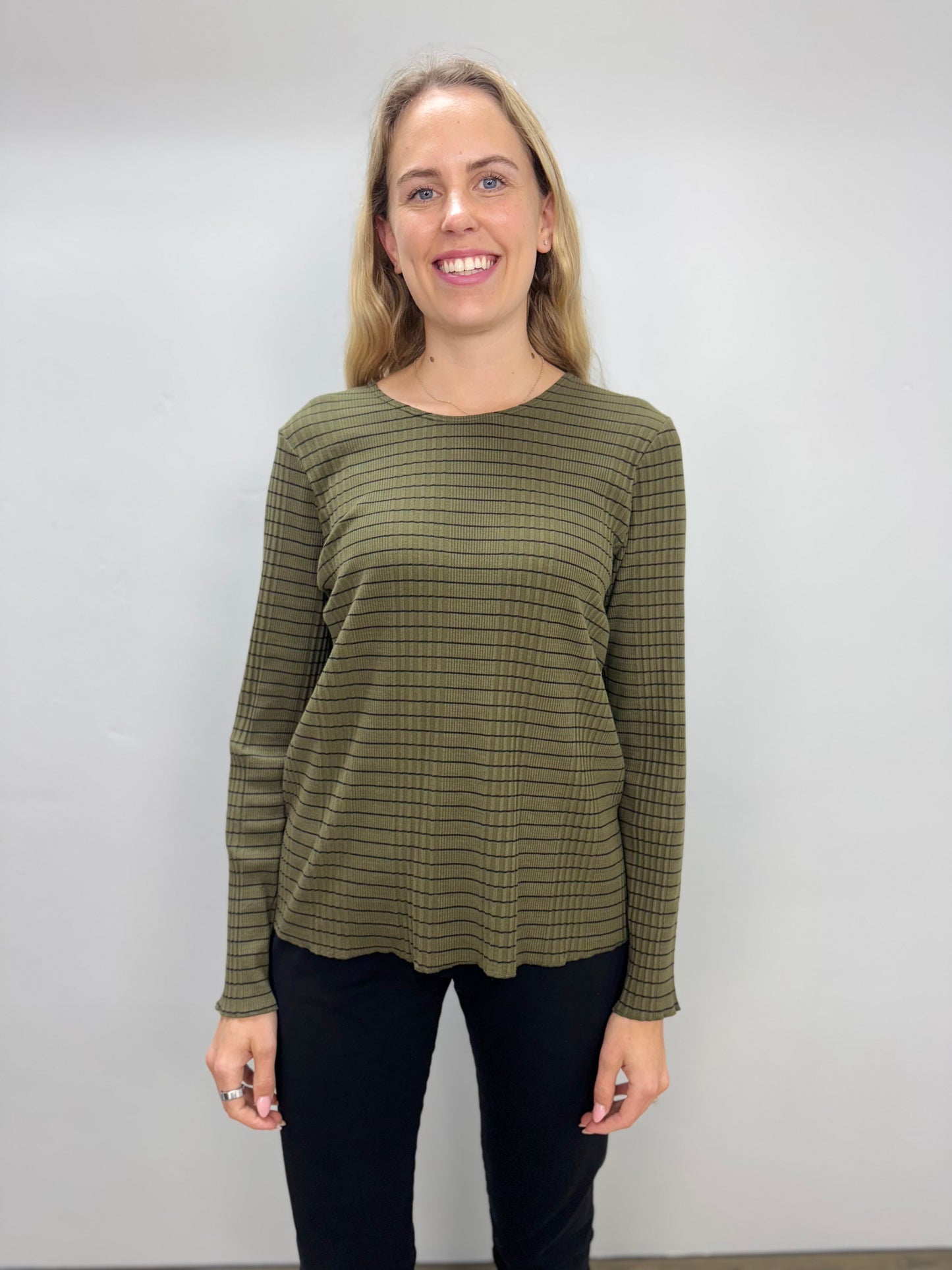Elevate your wardrobe with the Olive Green Stripe Textured Top, featuring a flattering scoop neck and long ribbed sleeves for a comfortable yet stylish fit. The subtle plaid texture combined with a stripe pattern adds a unique dimension to this versatile piece, perfect for layering or wearing on its own. Its rich olive green hue enhances your look with a touch of sophistication, making it an essential addition to any season-ready collection.