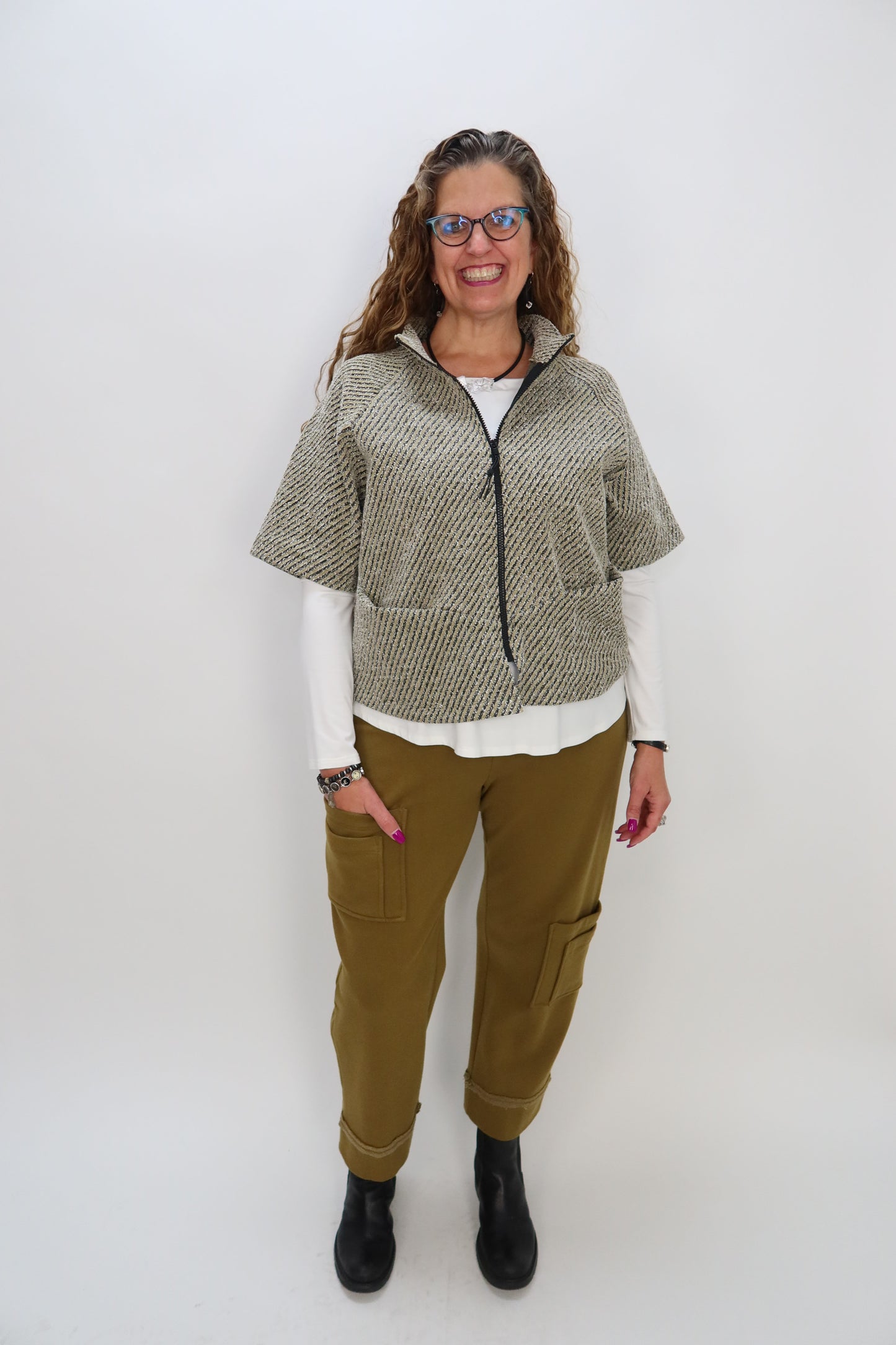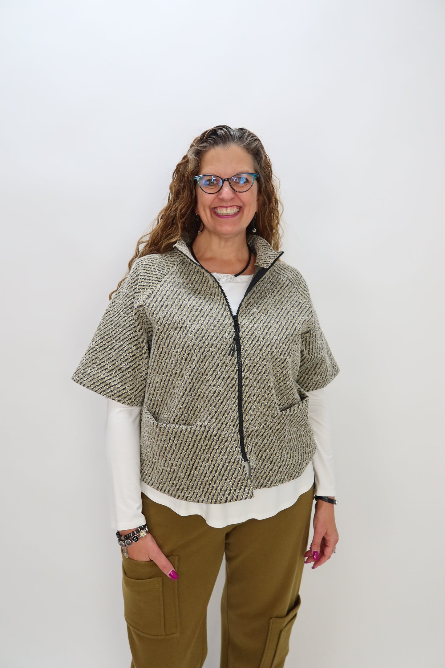 Dark Mustard Stripe French Terry Elbow Sleeve Zipper Jacket