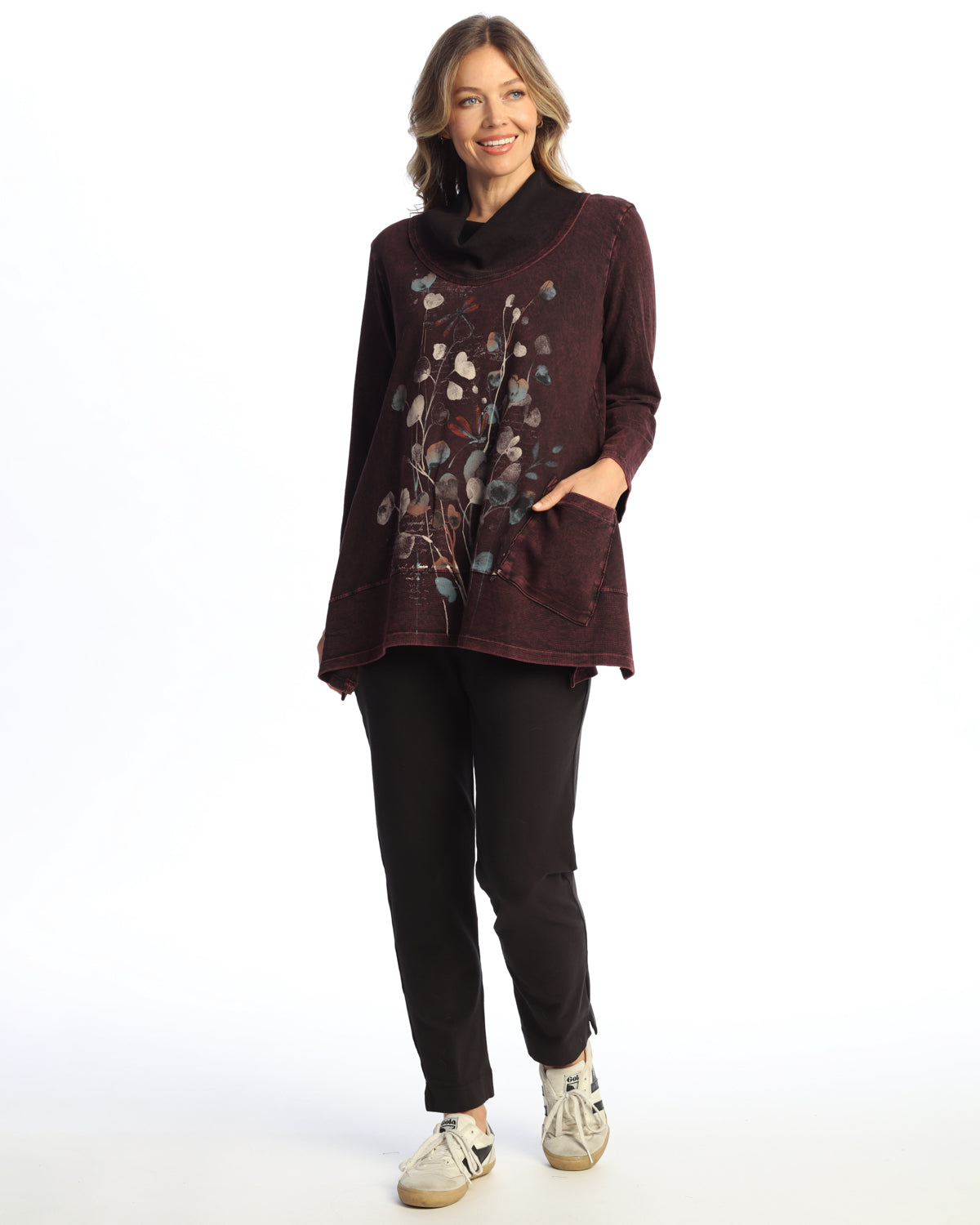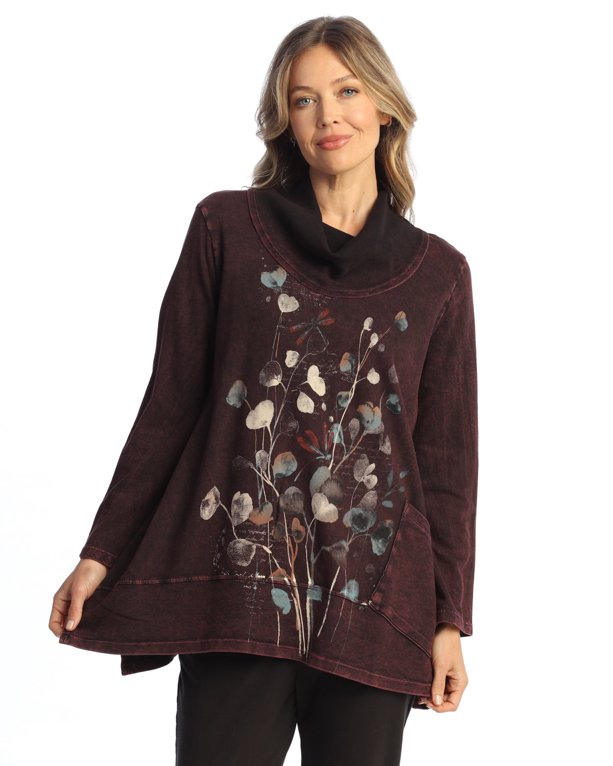 Wine Mineral Washed French Terry Cowl Neck Tunic