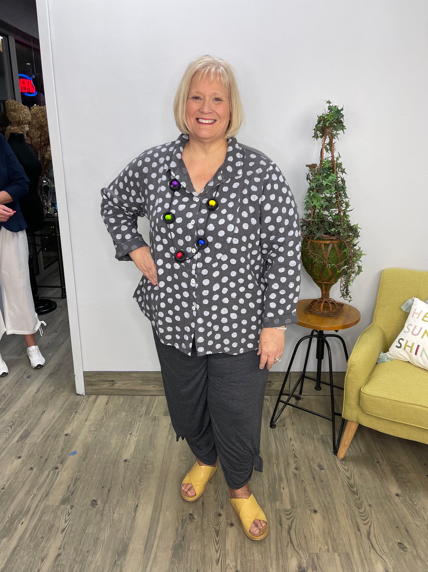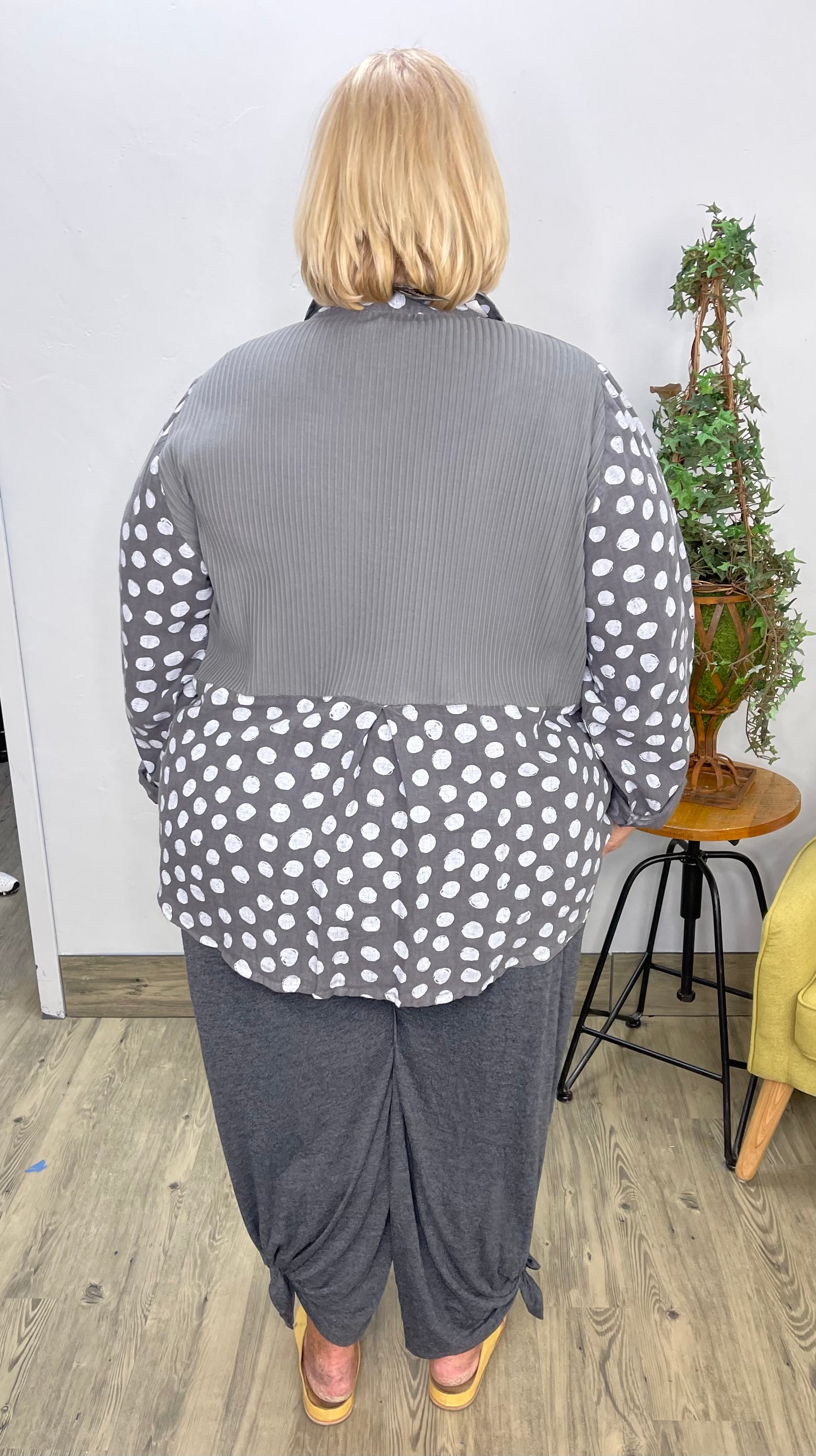 Regular price $104.40Experience comfort and style like never before in this Dusk Gray Ribbed Back Linen Button Down Shirt. Crafted with luxurious, breathable linen, this shirt features a bold polka dot pattern and a ribbed back, perfect for extra movement in the arms and shoulders. Step out in the latest luxurious look and feel confident that you look your best.