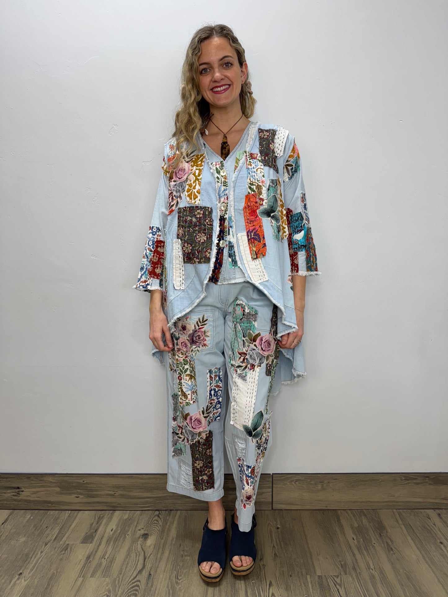 Transform your spring wardrobe with our Floral Patchwork Light Blue Denim Button Up Vest! Ideal for the season, this vest features adorable appliqué detailing throughout the front and back, giving it a one-of-a-kind look. The distressed and vintage denim adds a touch of edginess to any outfit. Elevate your style game with this must-have vest!