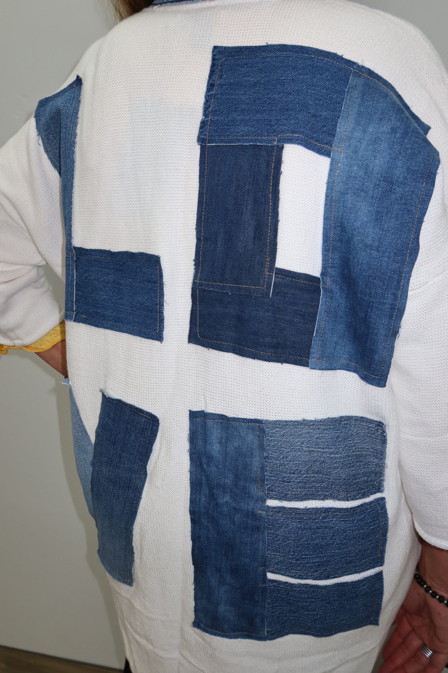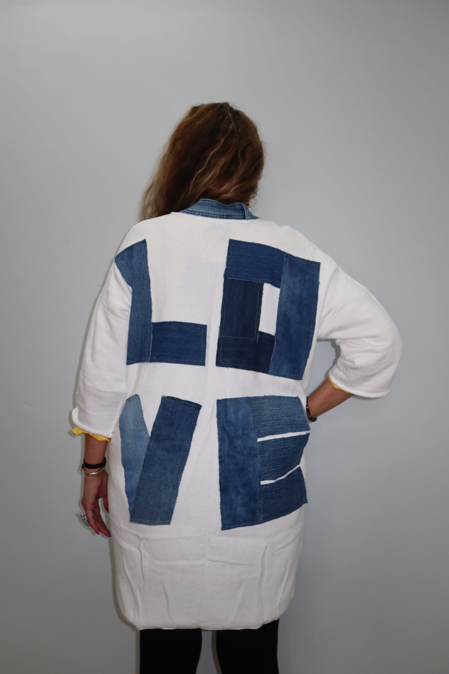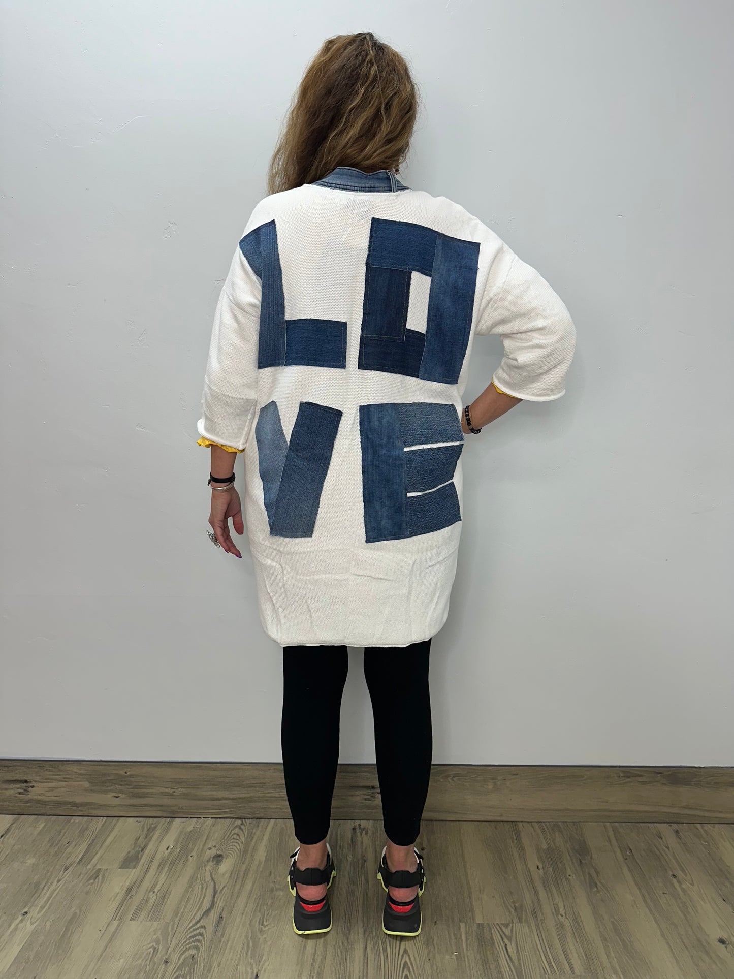 Regular price $132.30Experience the perfect blend of style and sustainability with our Love Recycled Denim Cardigan Jacket. Crafted from beautiful white knit material, this 3/4 sleeve jacket features a love print on the back, made from recycled denim. With two front pockets, it's not just fashionable but functional too. And for those game day vibes, pair it with some green and gold for a winning look!