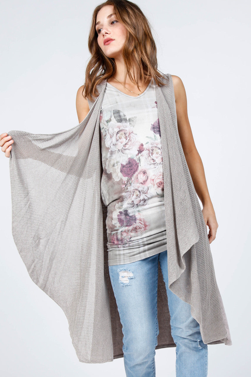 J4528A Mineral Wash Sleeveless Open Front Draped Cardigan w/Contrast Fabric