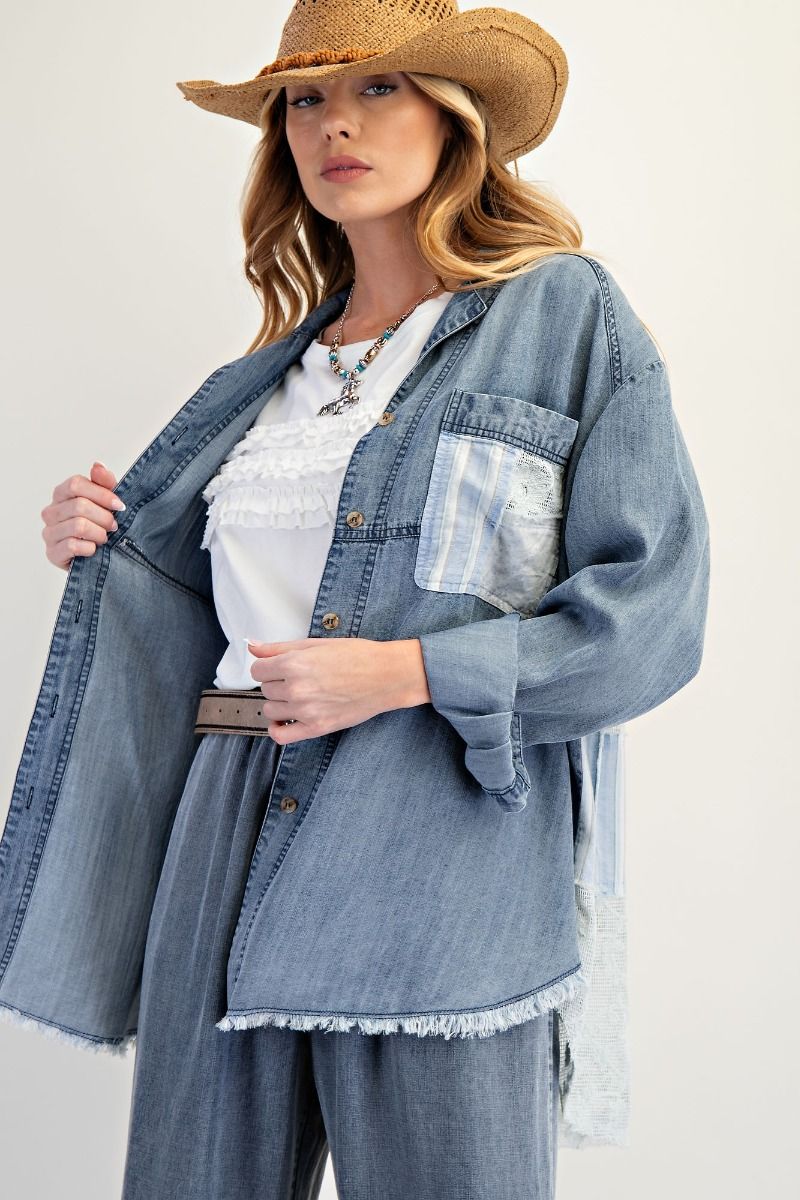This Mix & Match Patchwork Dark Chambray Button Down Shirt features mixed patchwork detailing on the back, adding an eclectic touch to your style. The long sleeves with button cuffs, notched collar neckline, and front chest pocket provide a comfortable and versatile wear. The frayed and rounded hem adds a unique touch, while the relaxed and loose fit allows for easy movement. Upgrade your wardrobe with this trendy and functional shirt!