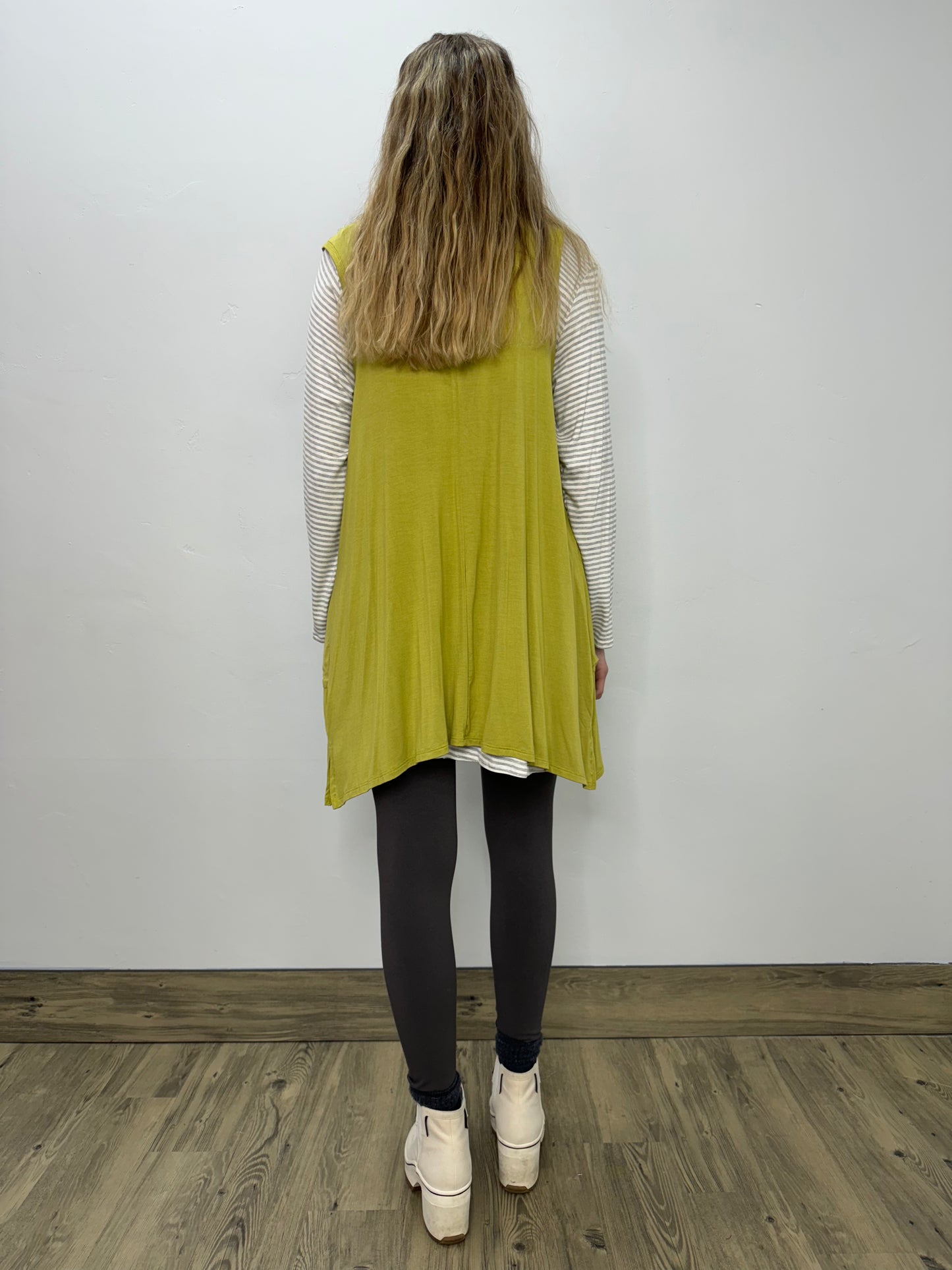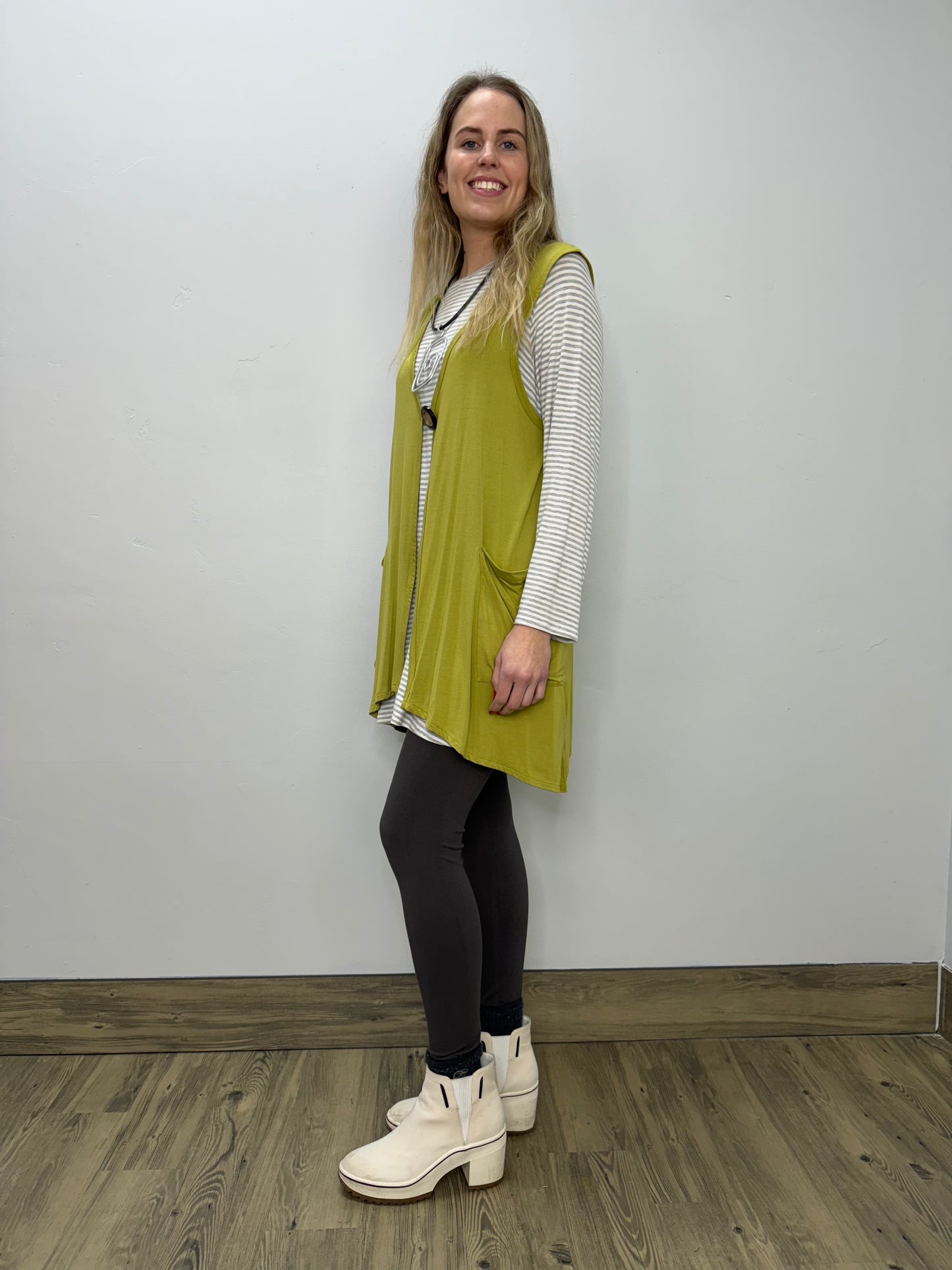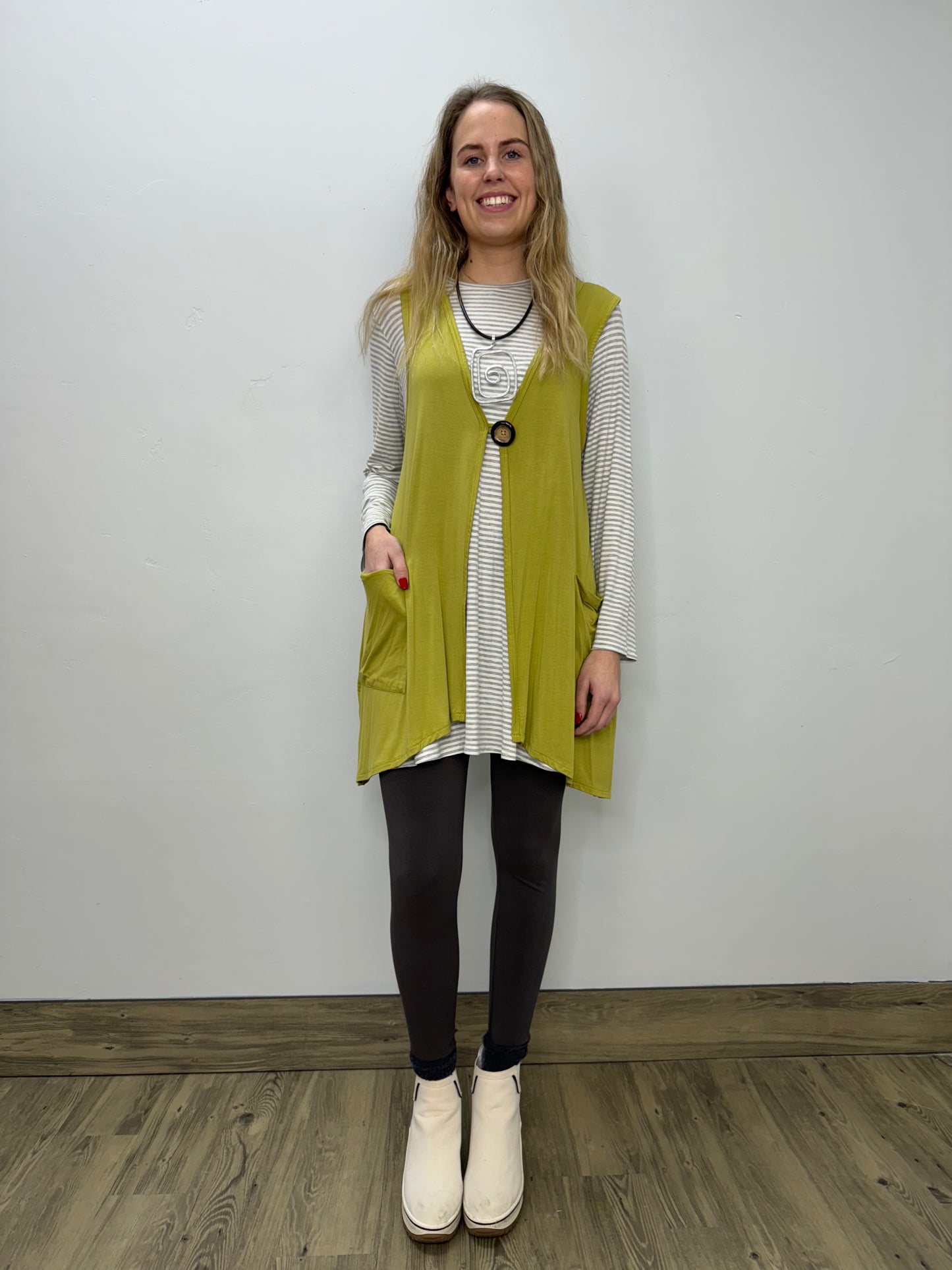 A trendy Twist A-line designed sleeveless cardigan styled vest has a single front button and two pockets on both sides. The cascading hemline allows for added flexibility. This Twist exclusive easily pairs with your favorite extender, leggings, or pants.