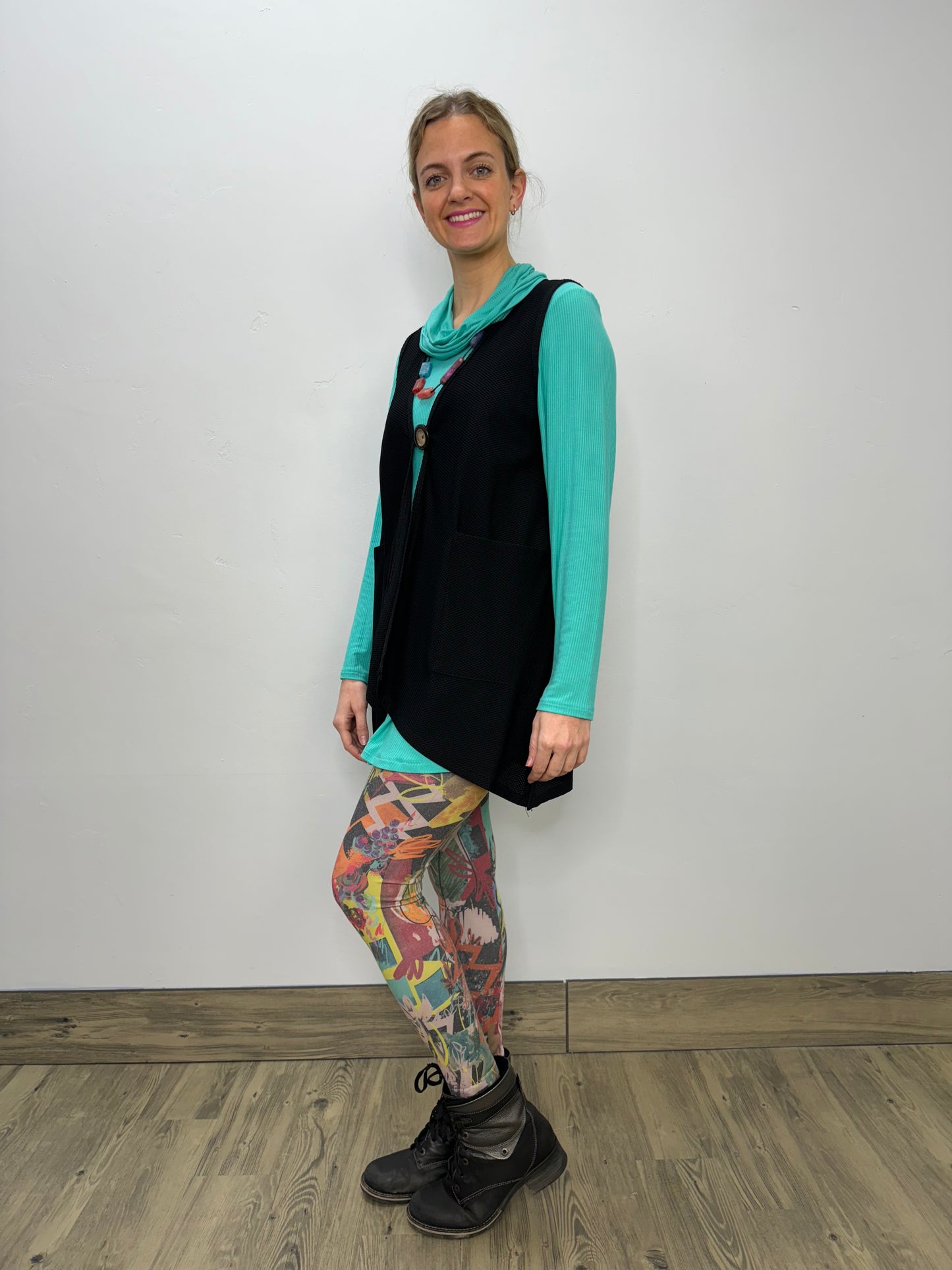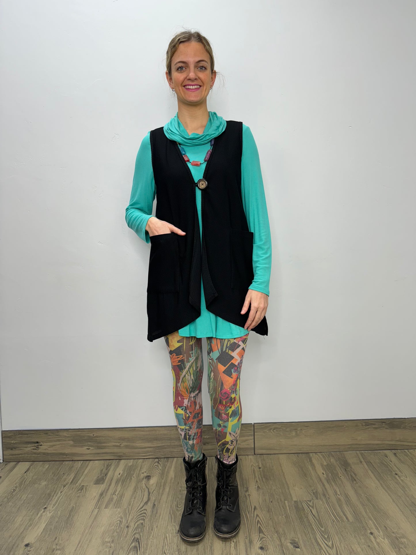 A trendy Twist A-line designed sleeveless cardigan styled vest has a single front button and two pockets on both sides. The cascading hemline allows for added flexibility. This Twist exclusive easily pairs with your favorite extender, leggings, or pants.