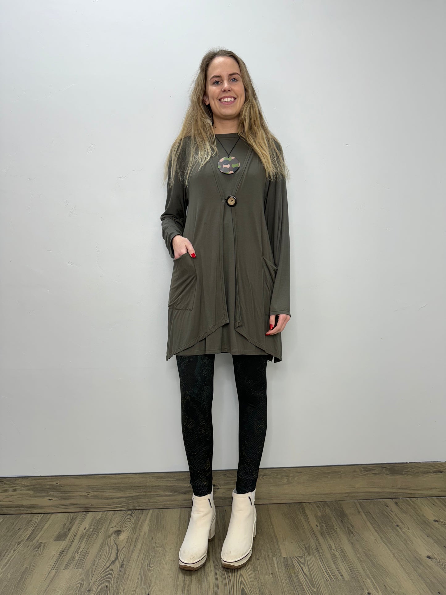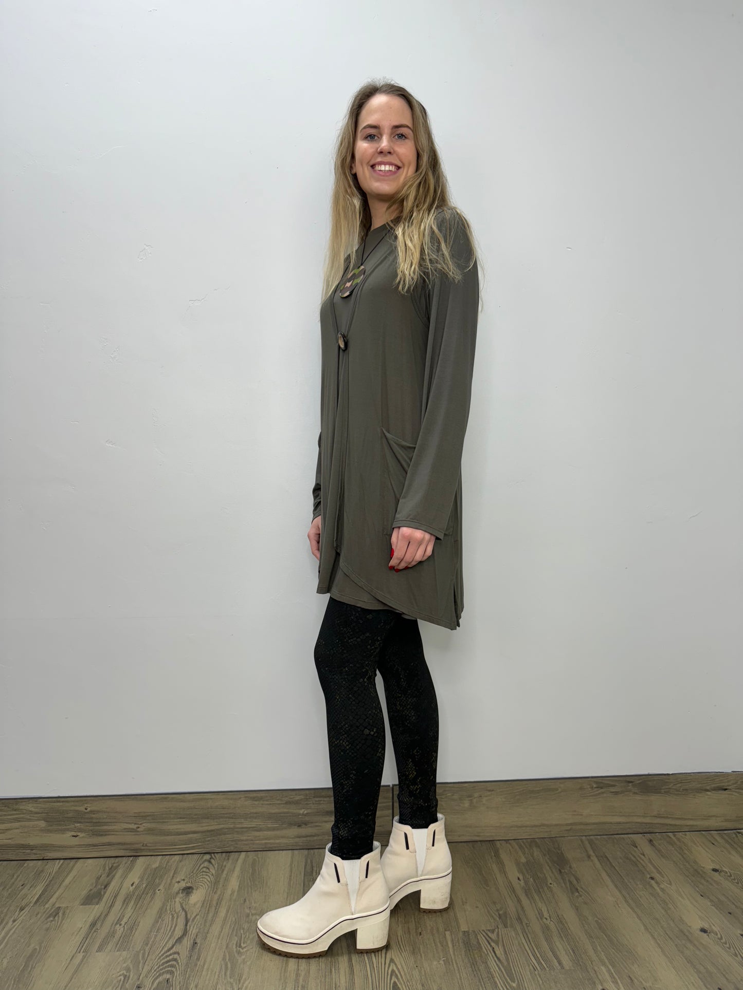 A trendy Twist A-line designed sleeveless cardigan styled vest has a single front button and two pockets on both sides. The cascading hemline allows for added flexibility. This Twist exclusive easily pairs with your favorite extender, leggings, or pants.