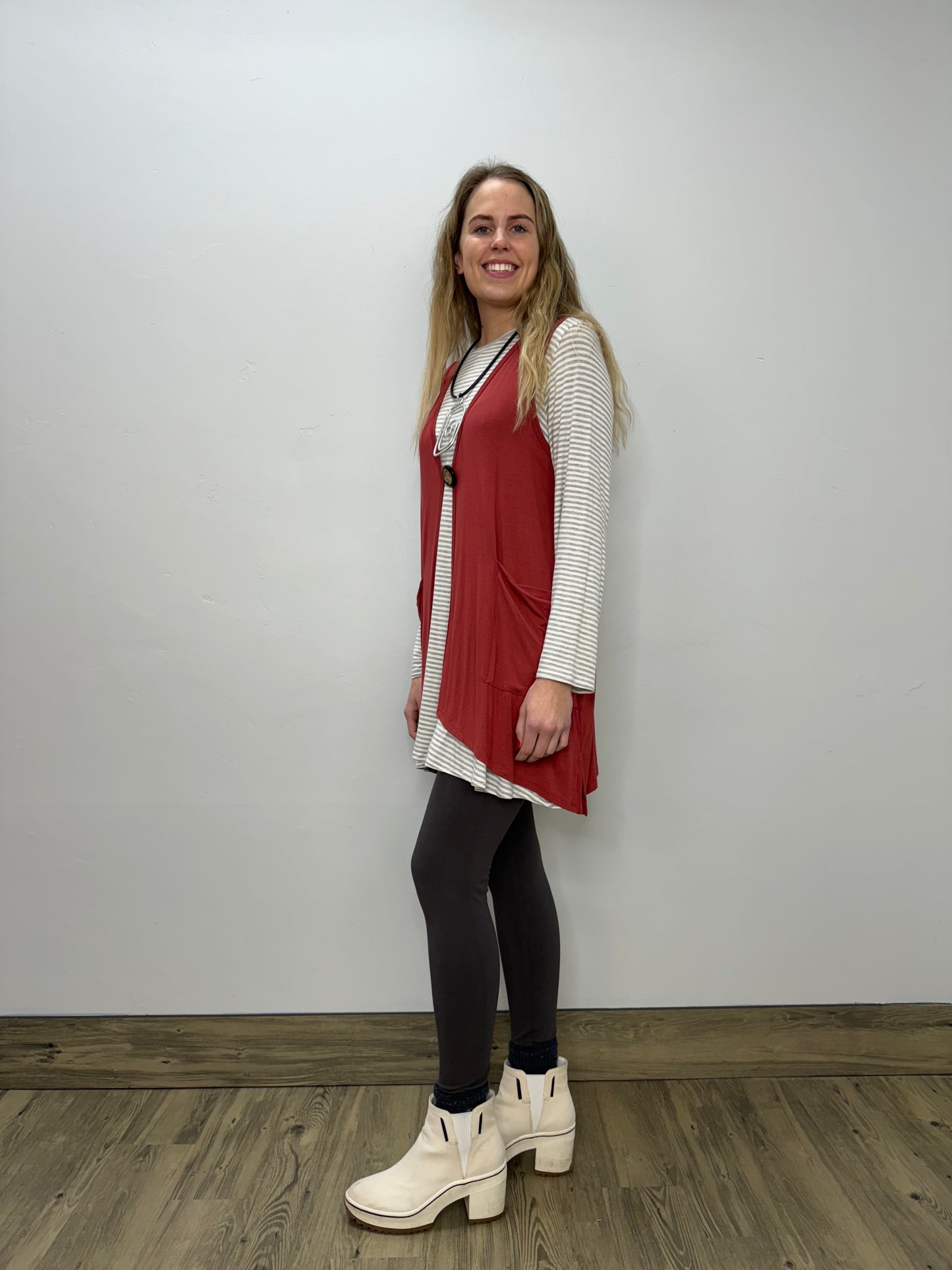 A trendy Twist A-line designed sleeveless cardigan styled vest has a single front button and two pockets on both sides. The cascading hemline allows for added flexibility. This Twist exclusive easily pairs with your favorite extender, leggings, or pants.