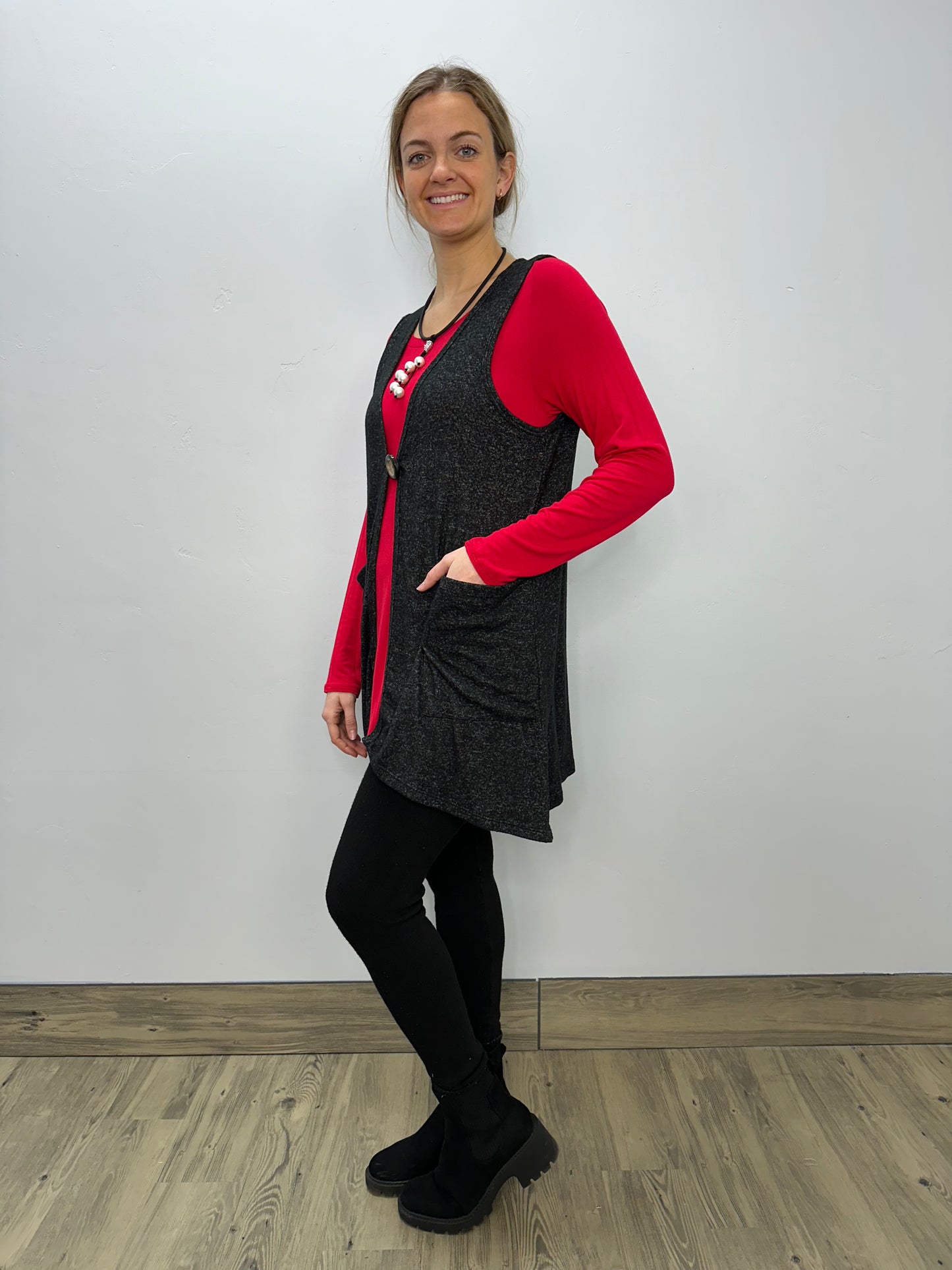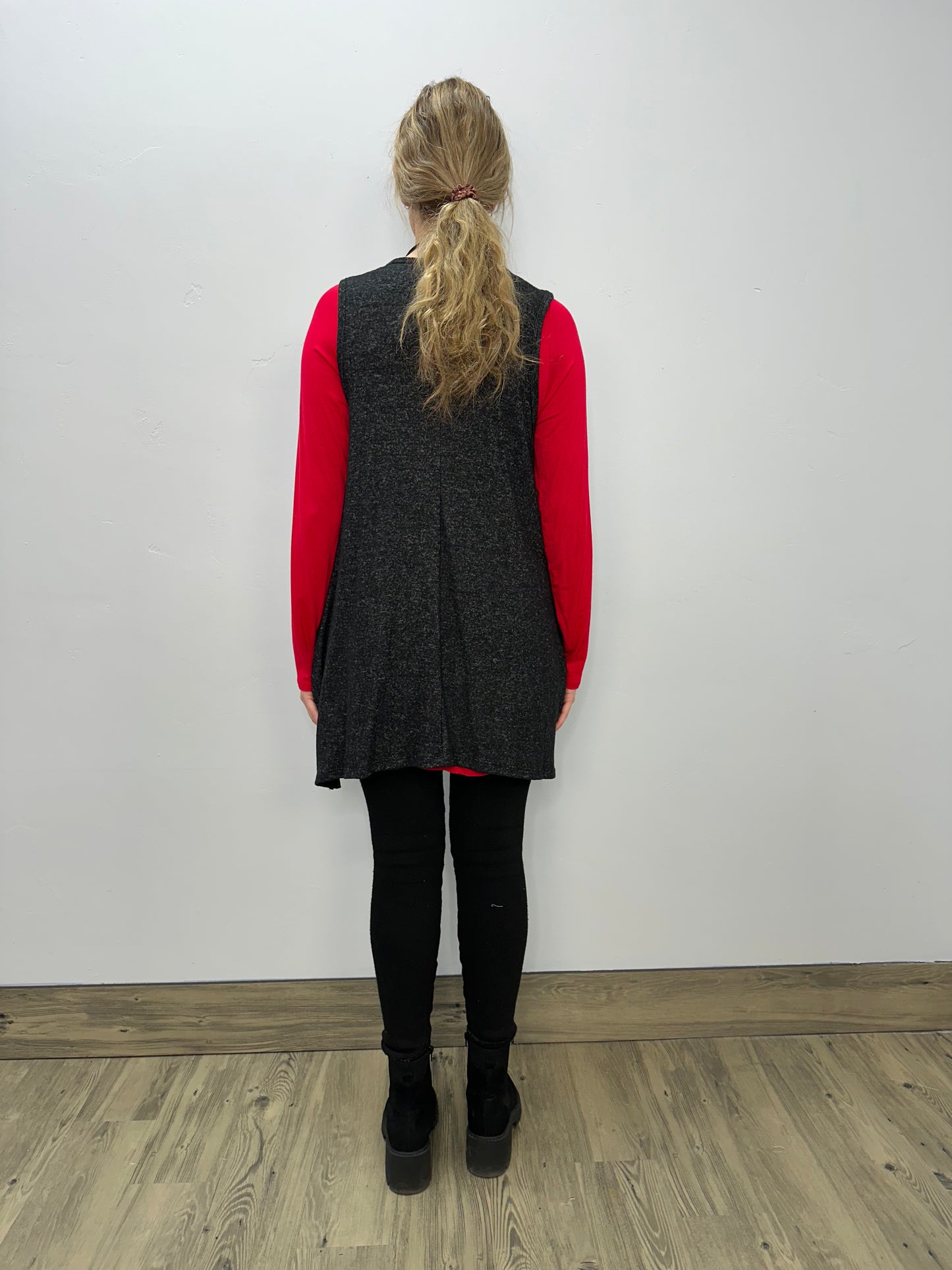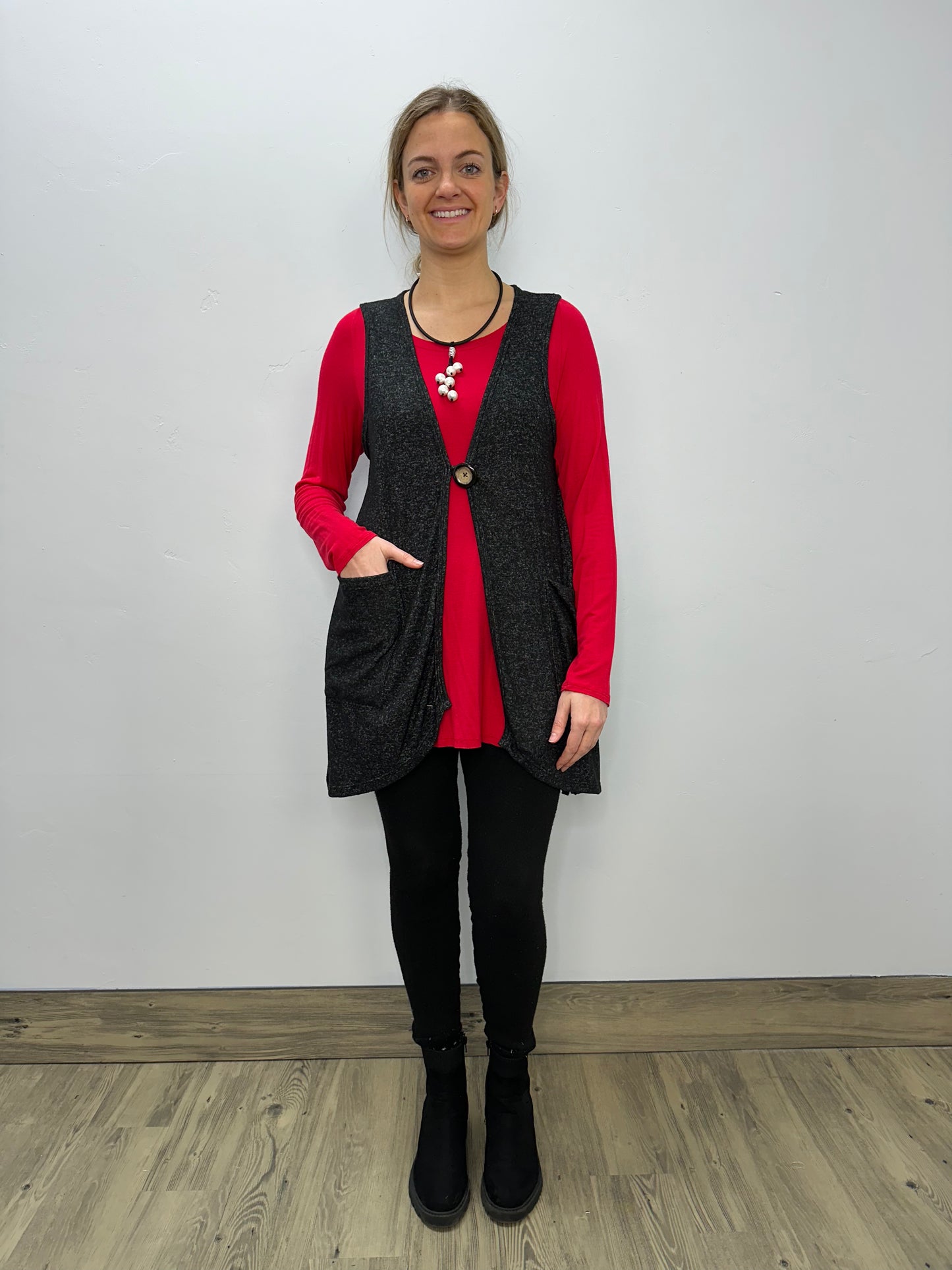 A trendy Twist A-line designed sleeveless cardigan styled vest has a single front button and two pockets on both sides. The cascading hemline allows for added flexibility. This Twist exclusive easily pairs with your favorite extender, leggings, or pants.