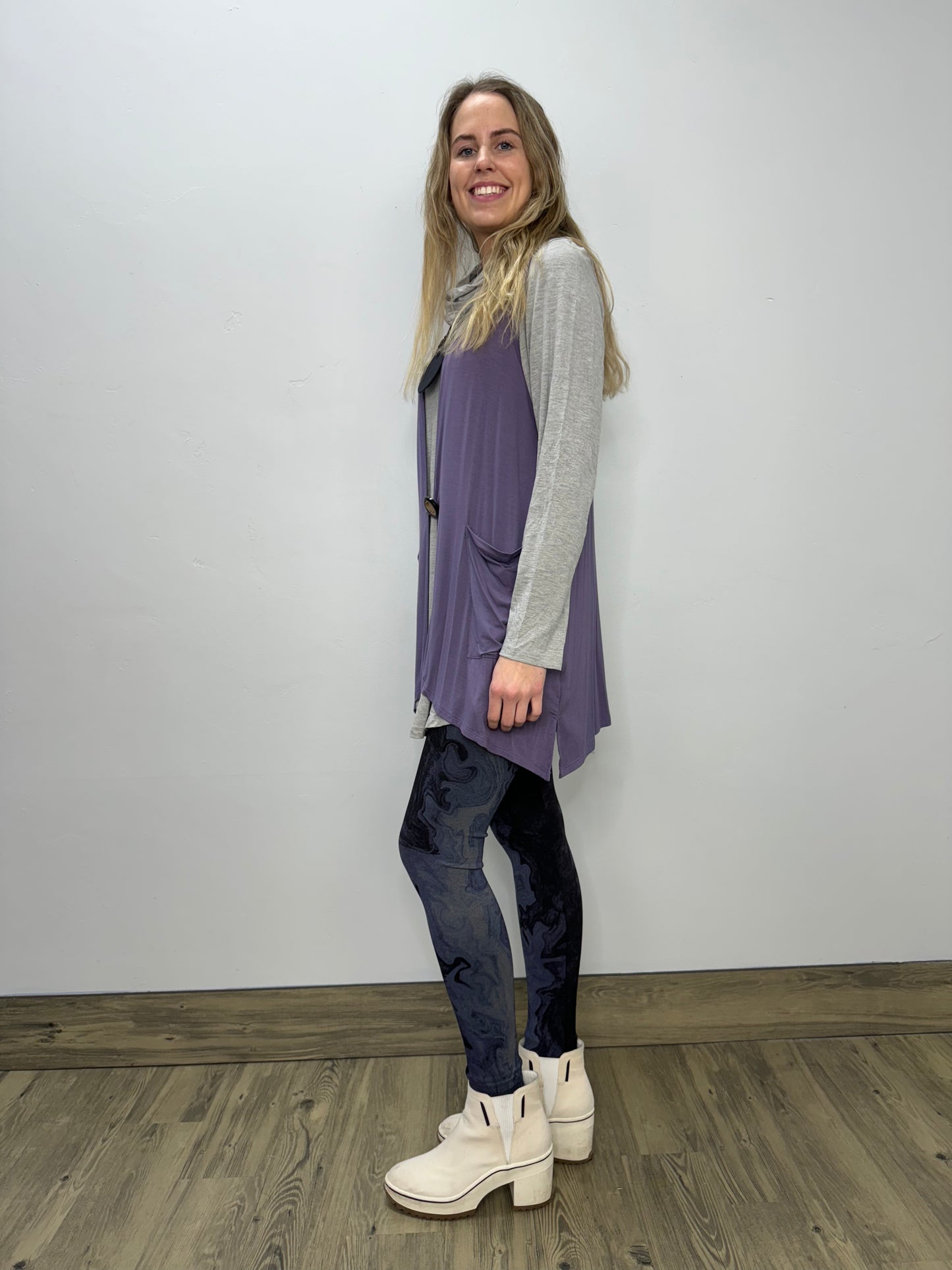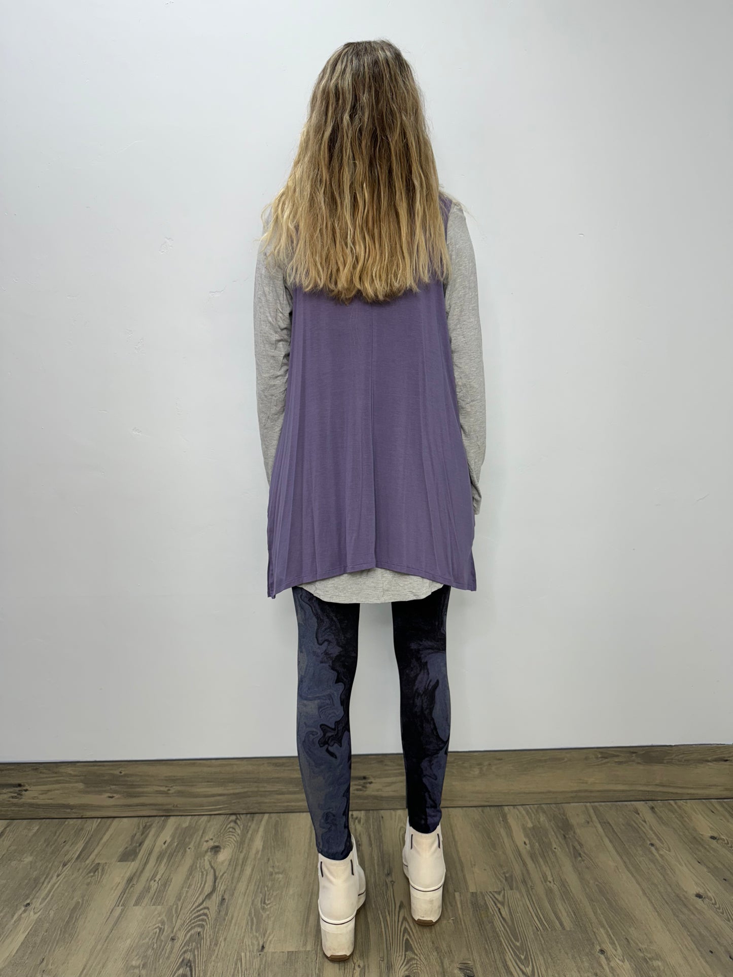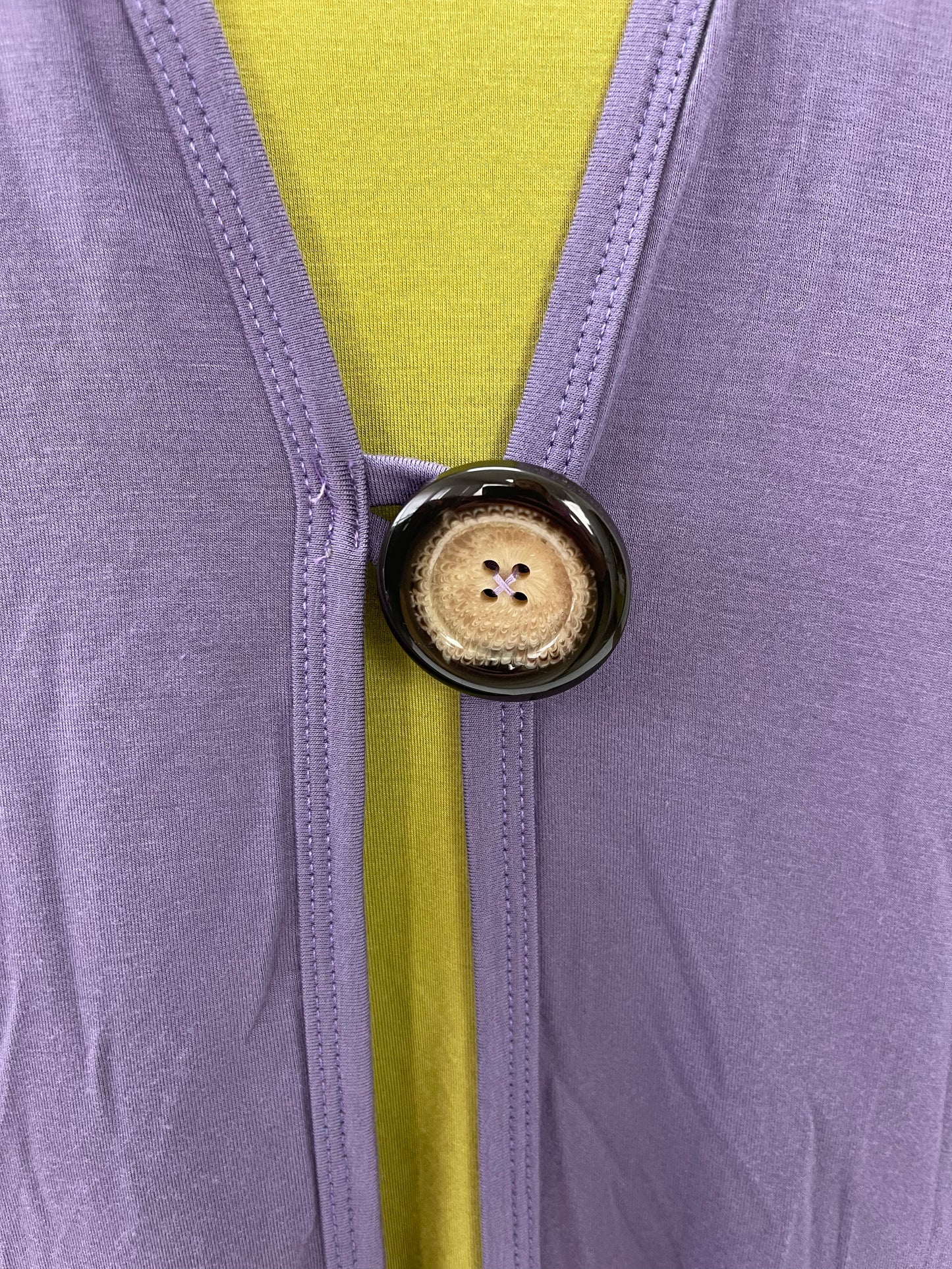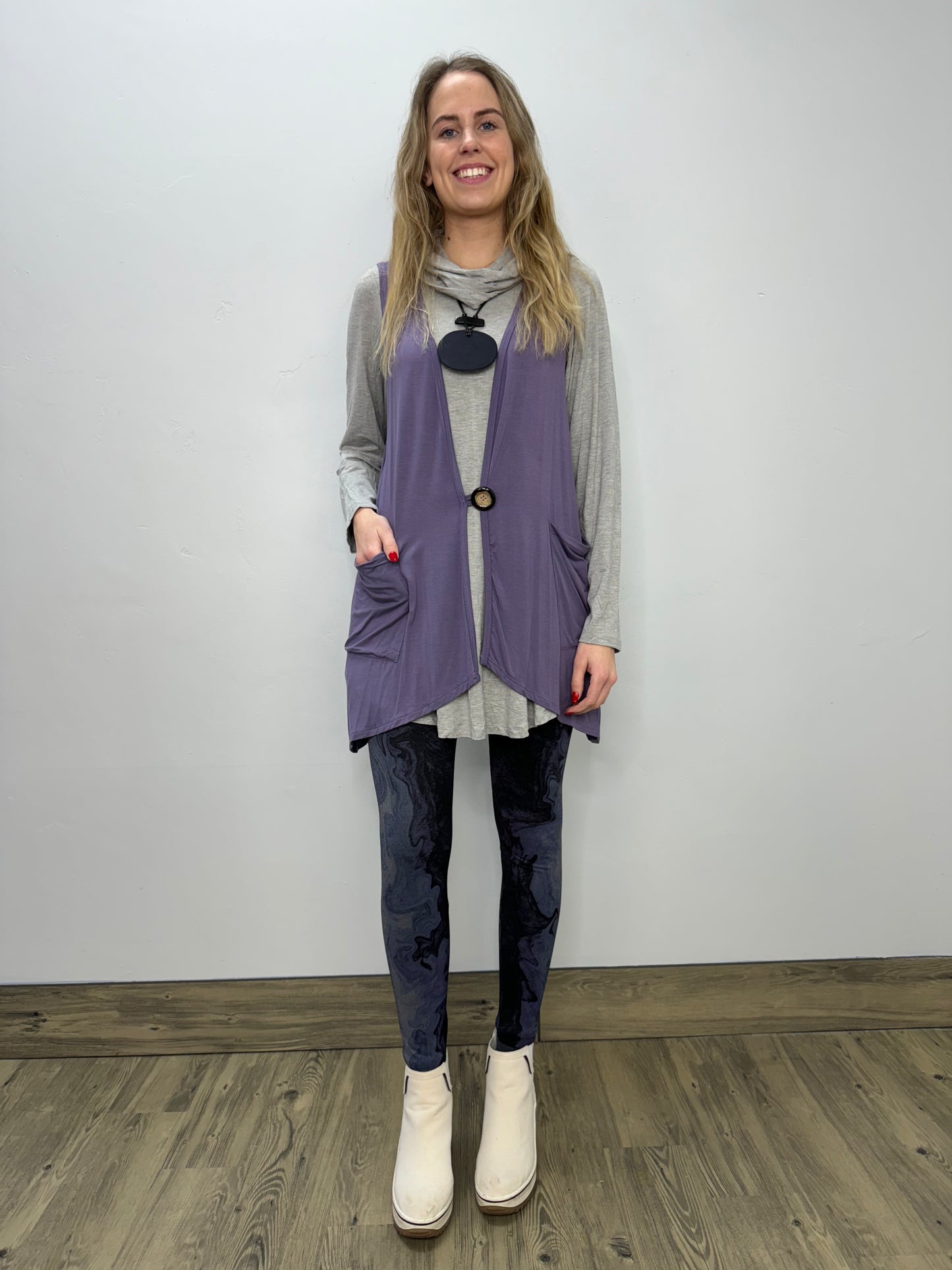 A trendy Twist A-line designed sleeveless cardigan styled vest has a single front button and two pockets on both sides. The cascading hemline allows for added flexibility. This Twist exclusive easily pairs with your favorite extender, leggings, or pants.