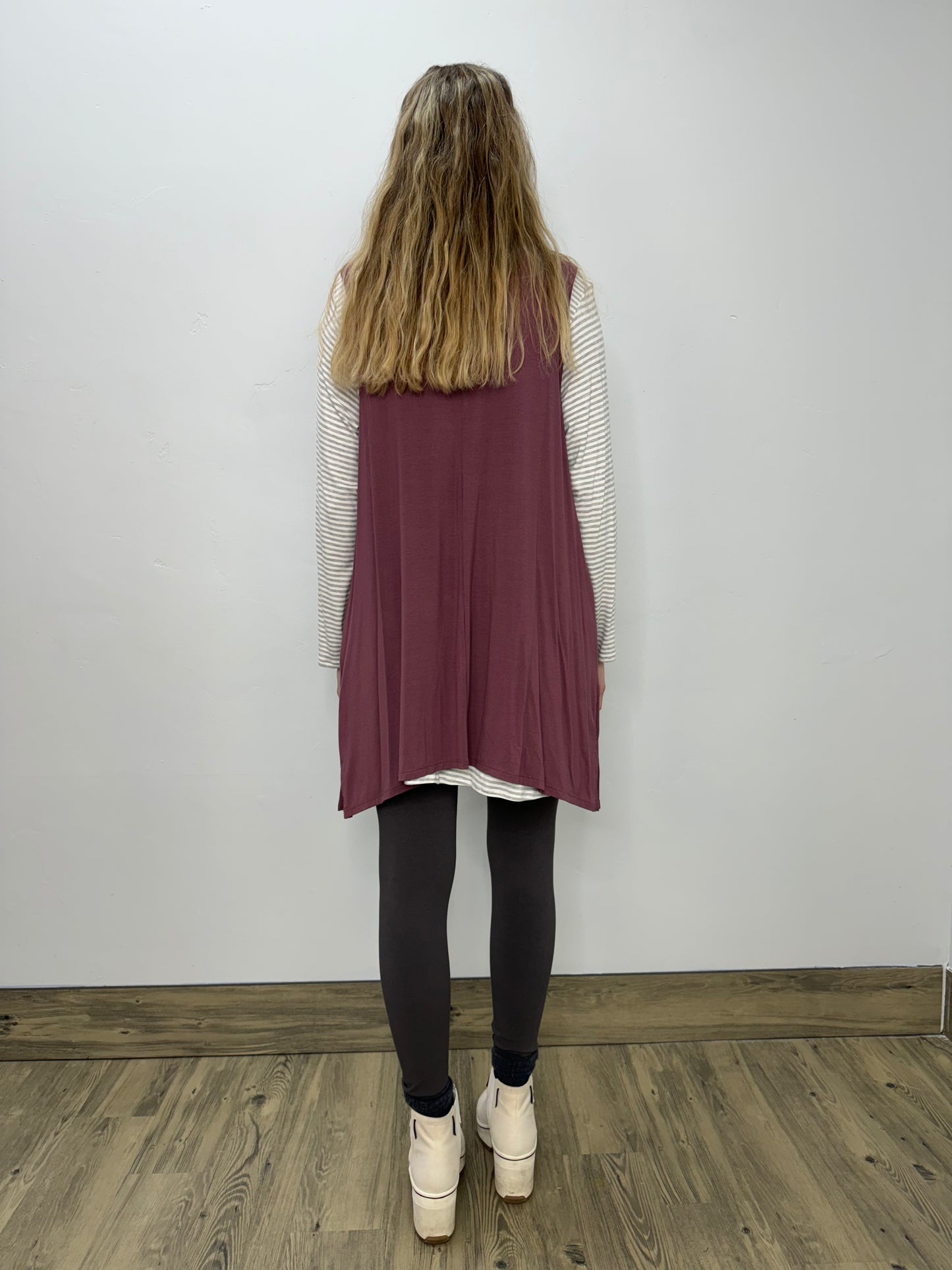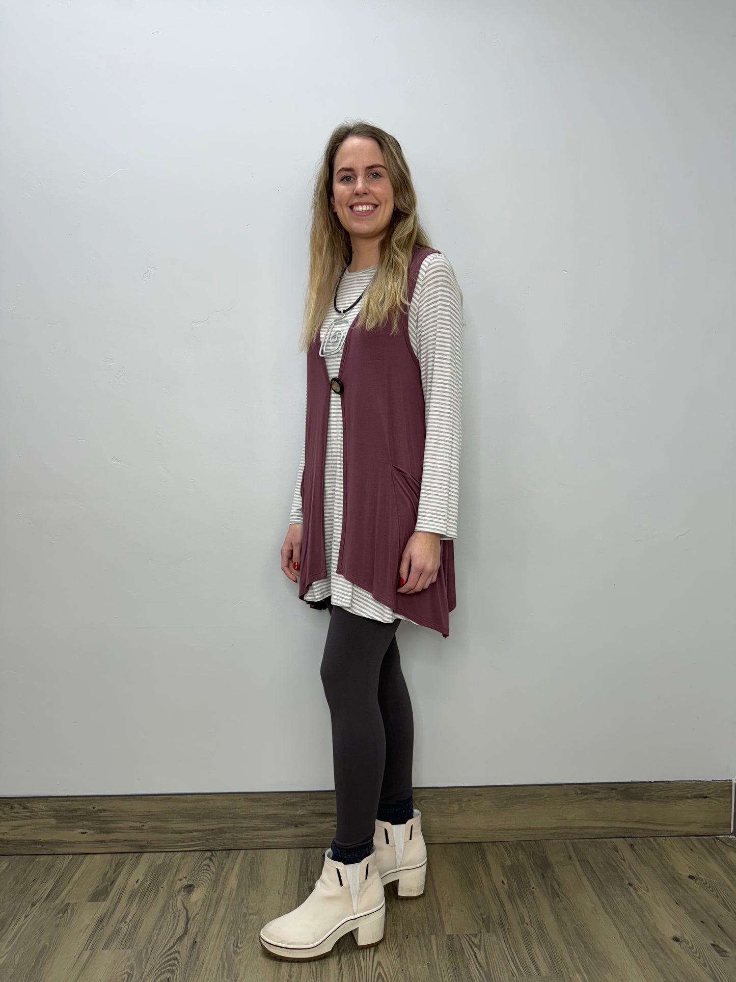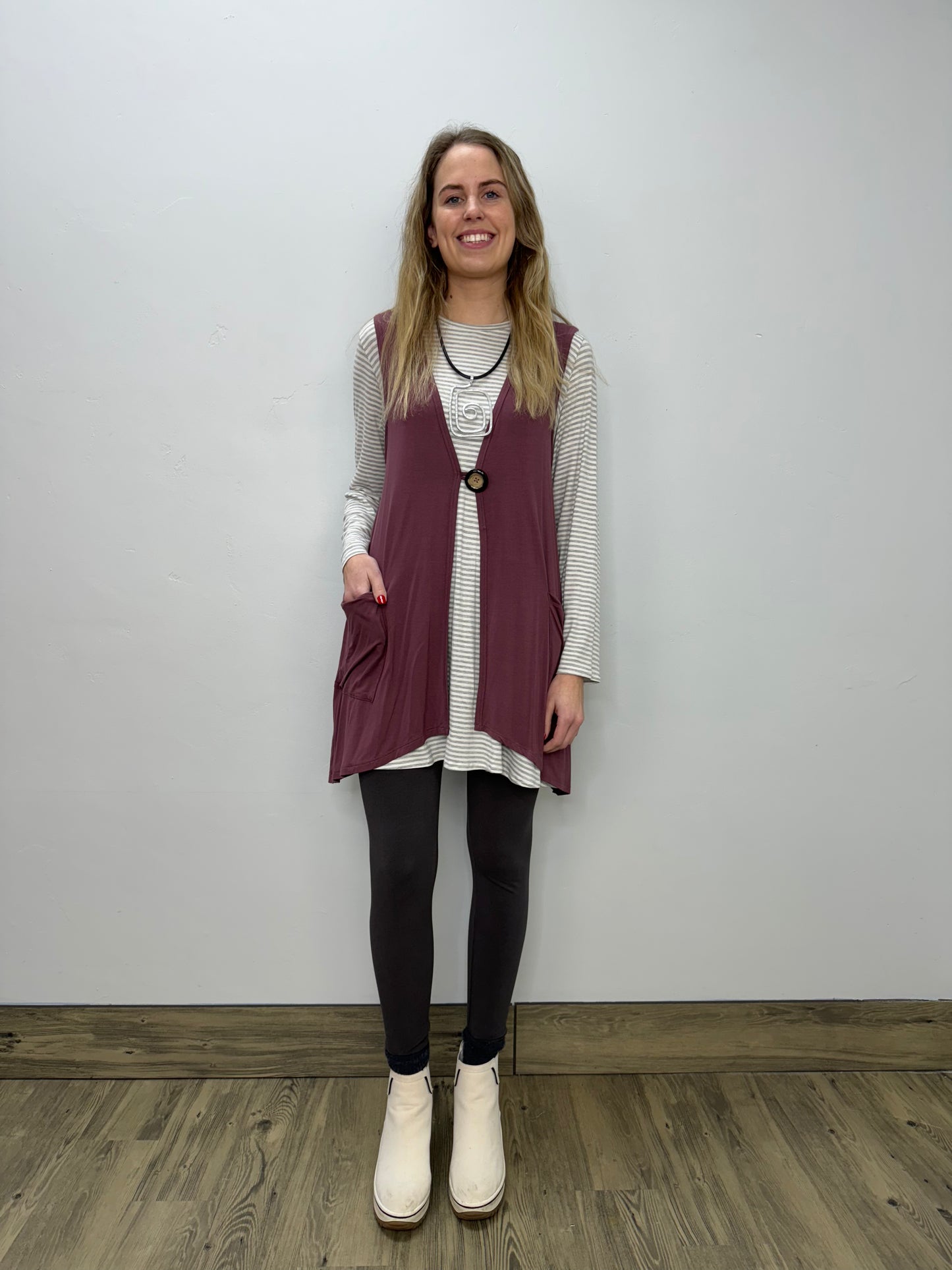 A trendy Twist A-line designed sleeveless cardigan styled vest has a single front button and two pockets on both sides. The cascading hemline allows for added flexibility. This Twist exclusive easily pairs with your favorite extender, leggings, or pants.