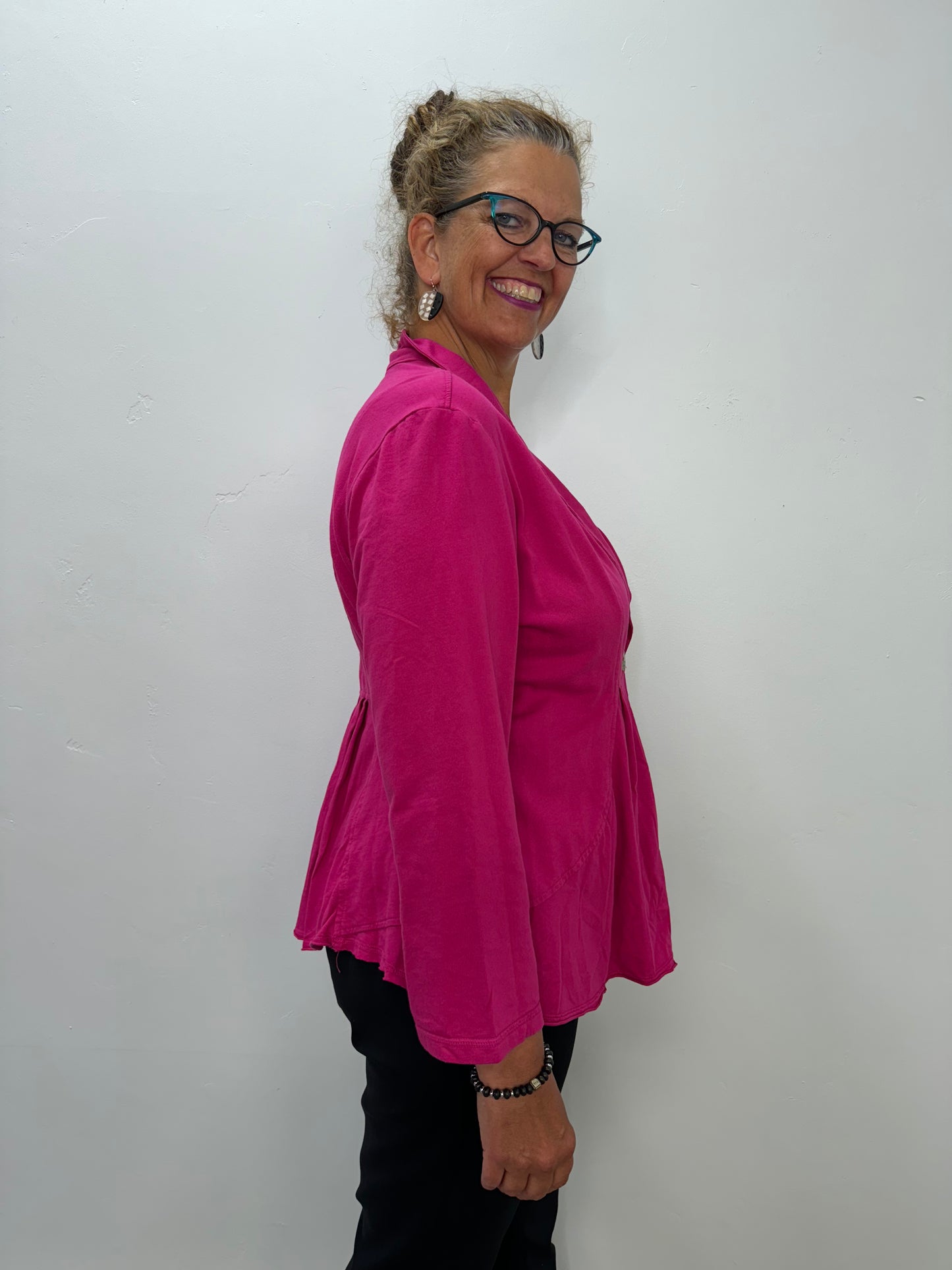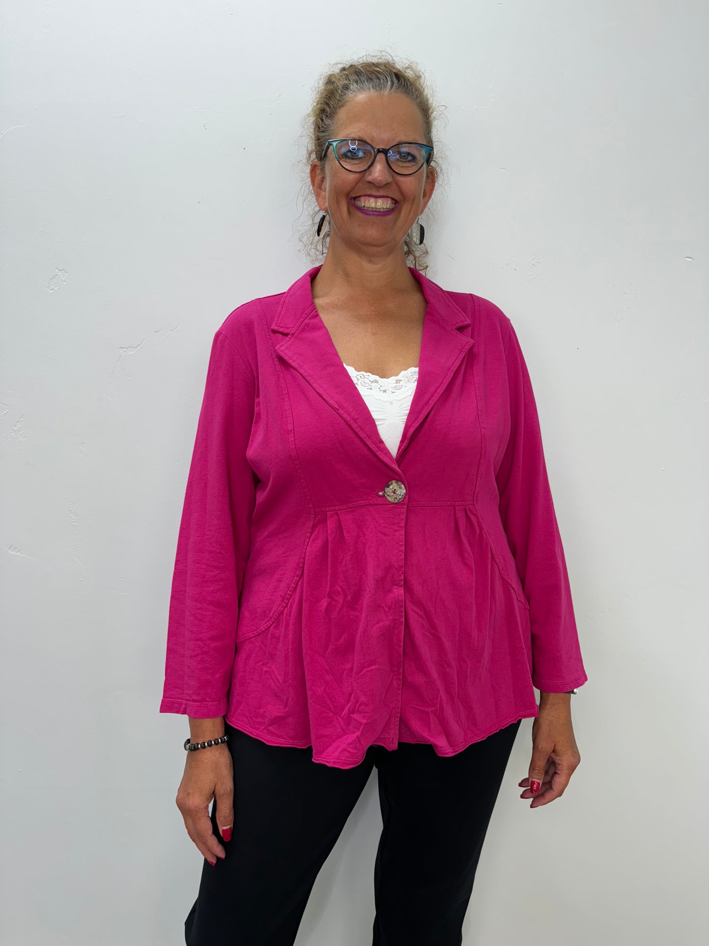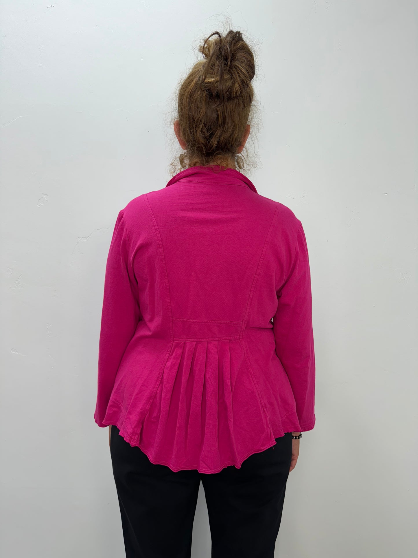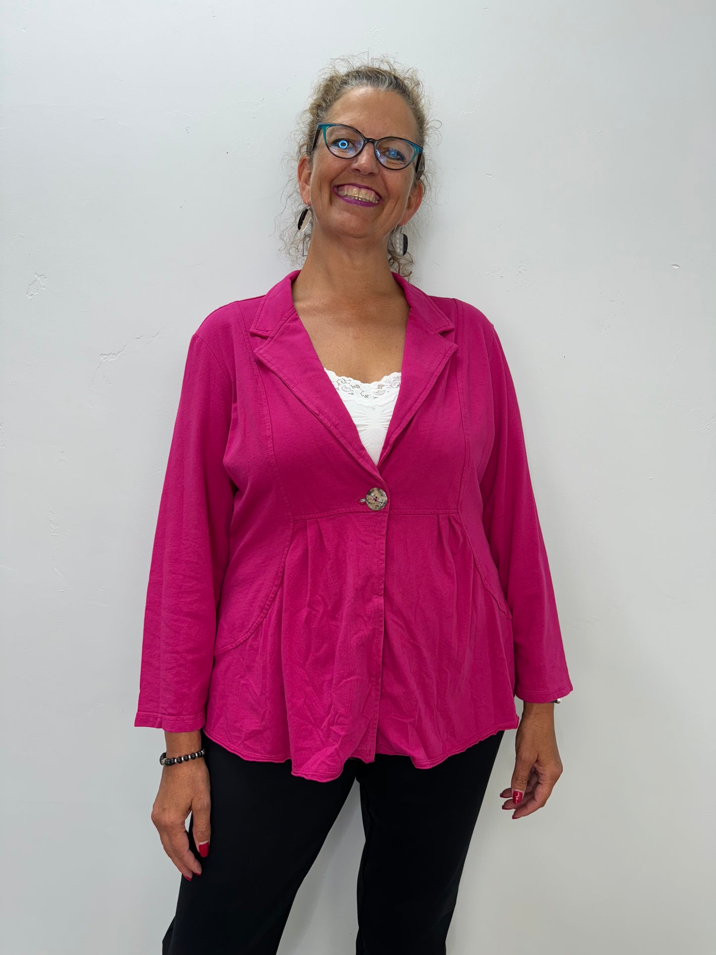 Regular price $76.30Add a pop of color to your wardrobe with our Raspberry Pink Collared Jacket. The crisp 100% cotton fabric will keep you looking sophisticated, while the back pleats and front button add a cute touch. Elevate any outfit with this versatile and stylish jacket!