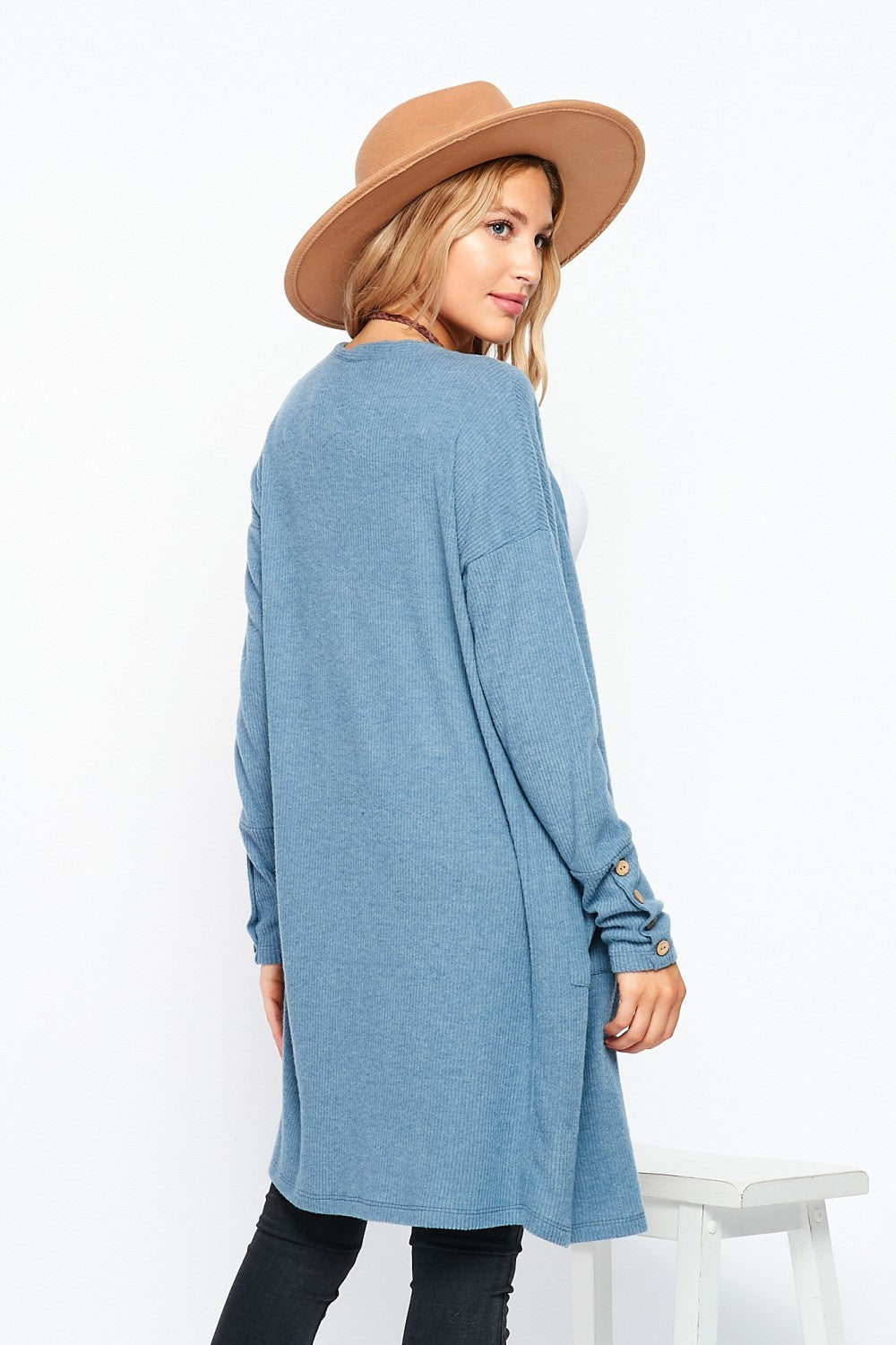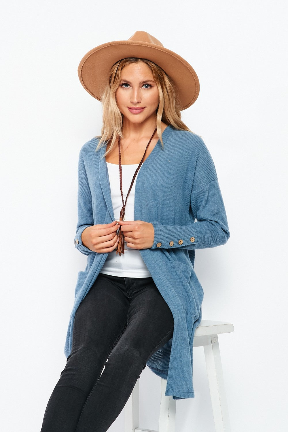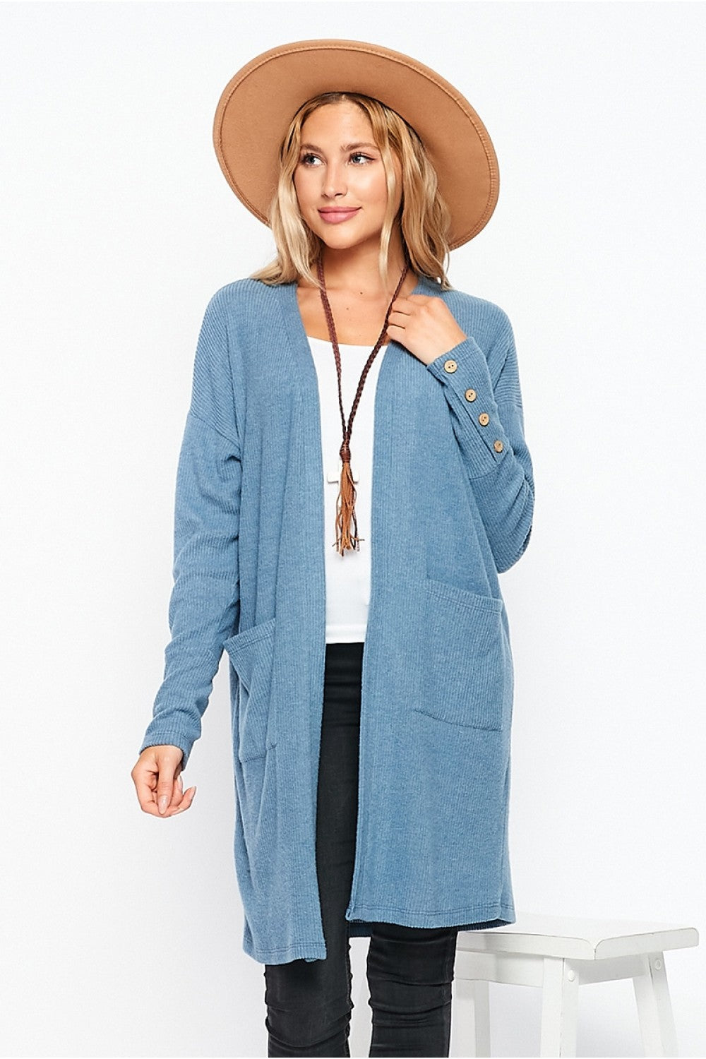 Regular price $39.50HoneyMe ultra soft ribbed open cardi with pockets and button detail at sleeve cuffs.
