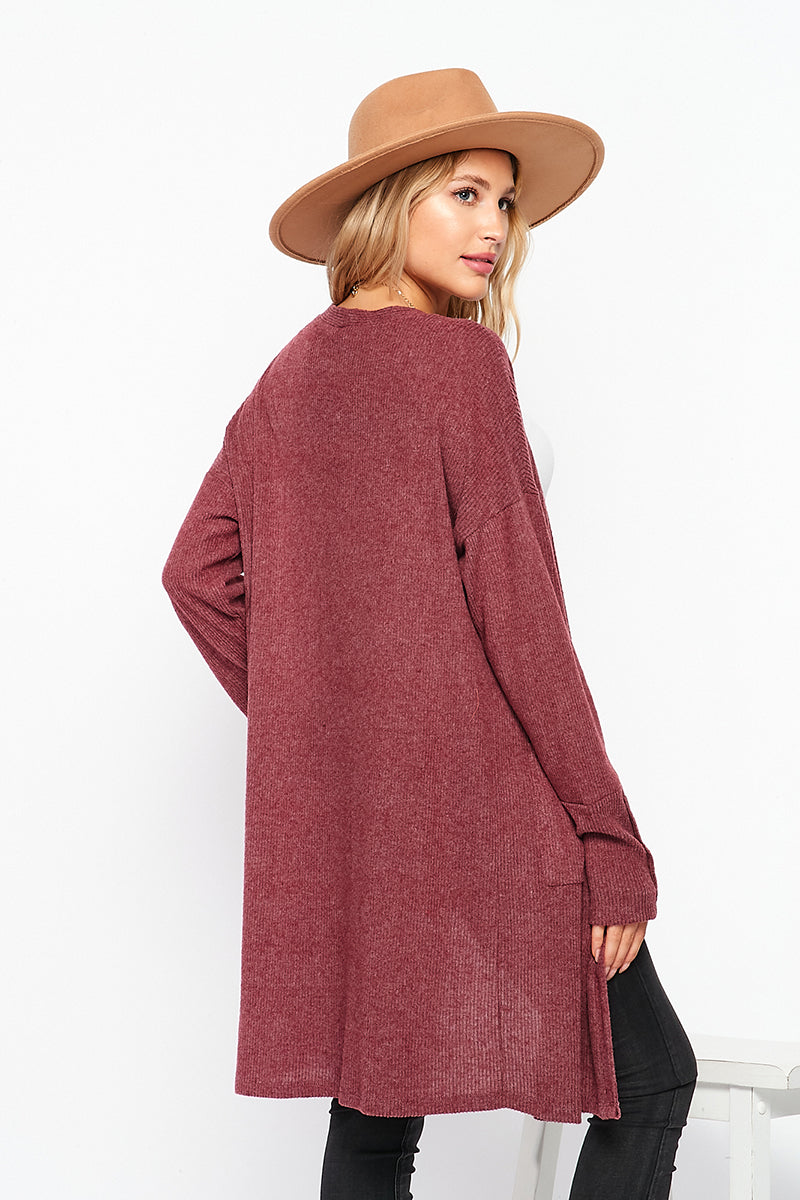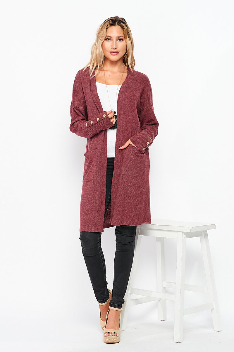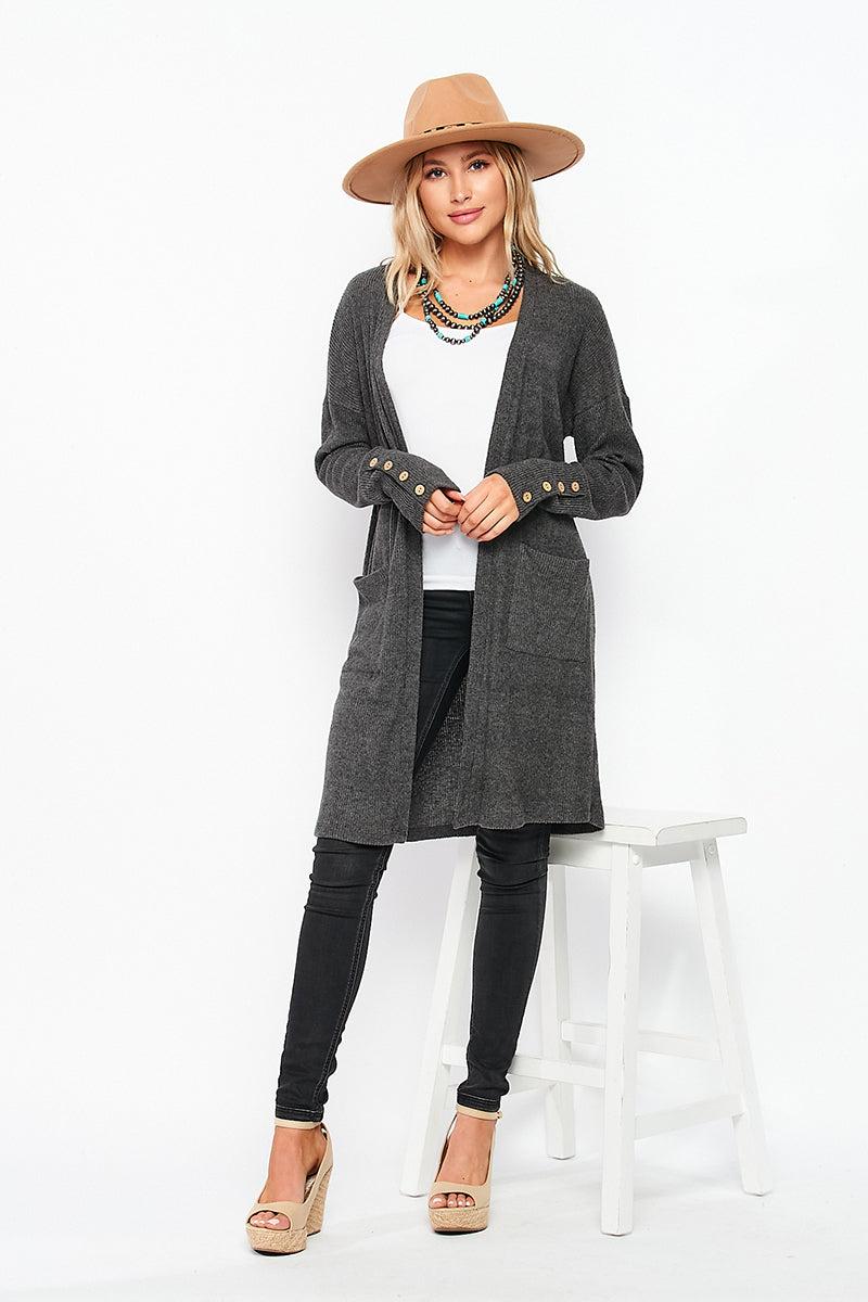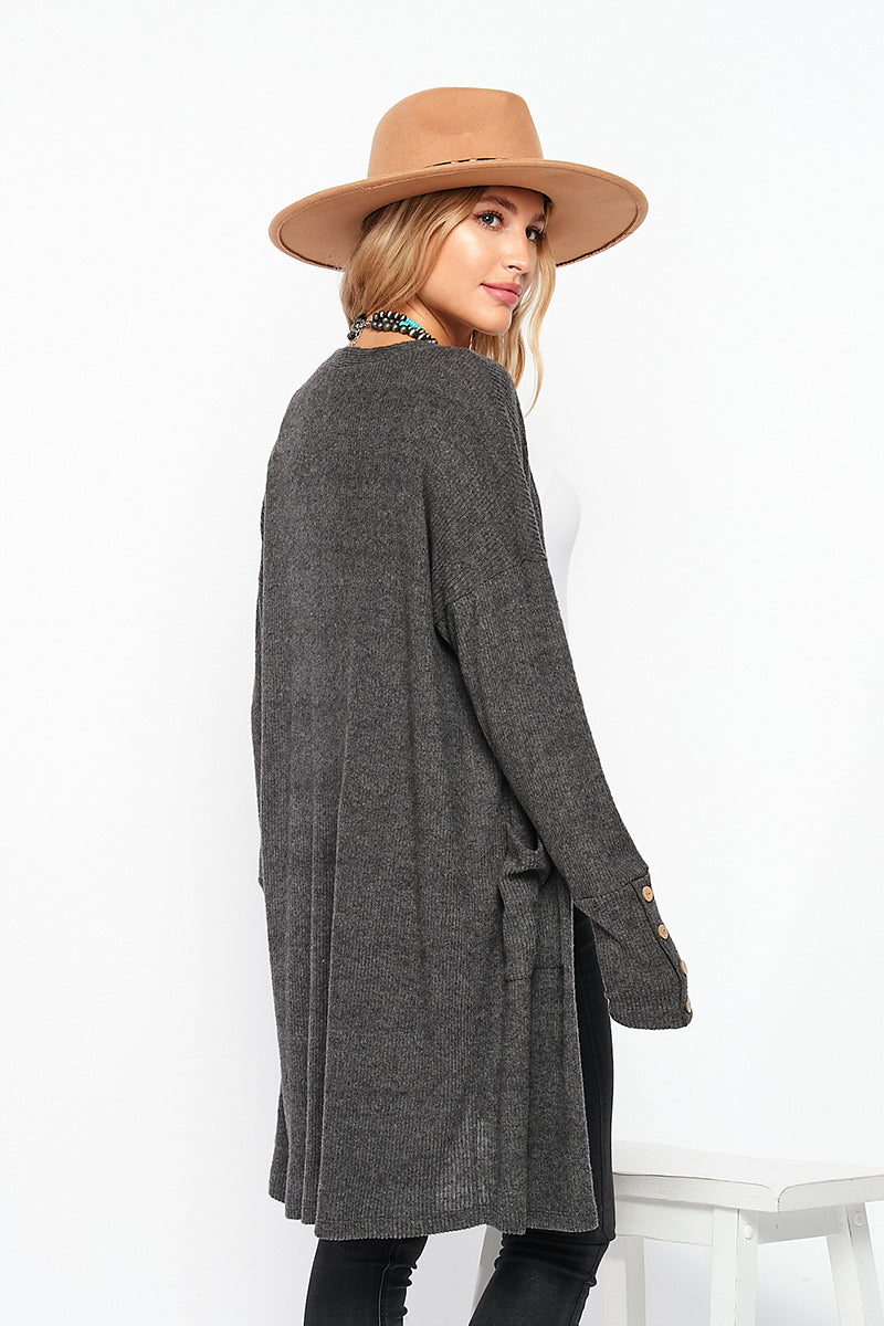 Regular price $39.50HoneyMe ultra soft ribbed open cardi with pockets and button detail at sleeve cuffs.