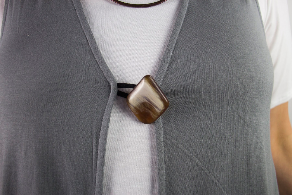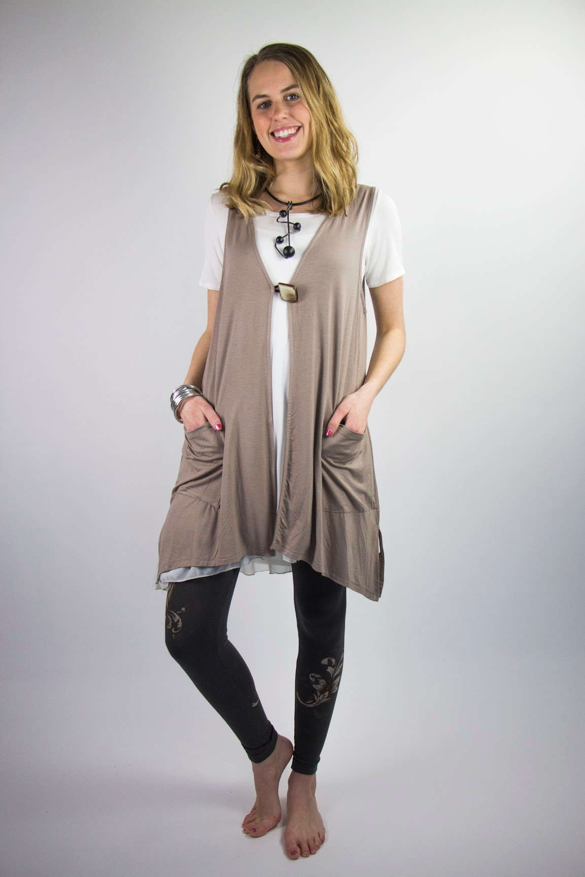 A trendy Twist A-line designed sleeveless cardigan styled vest has a single front button and a large pocket on both sides. The asymmetrical hemline allows for added flexibility. This Twist exclusive easily pairs with your favorite extender, leggings, or pants.