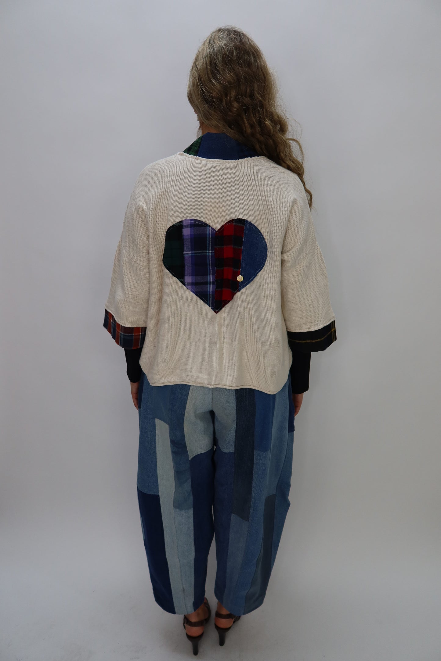 Upcycled Flannel Cream Purple Accent Heart Knit Cardigan One Size