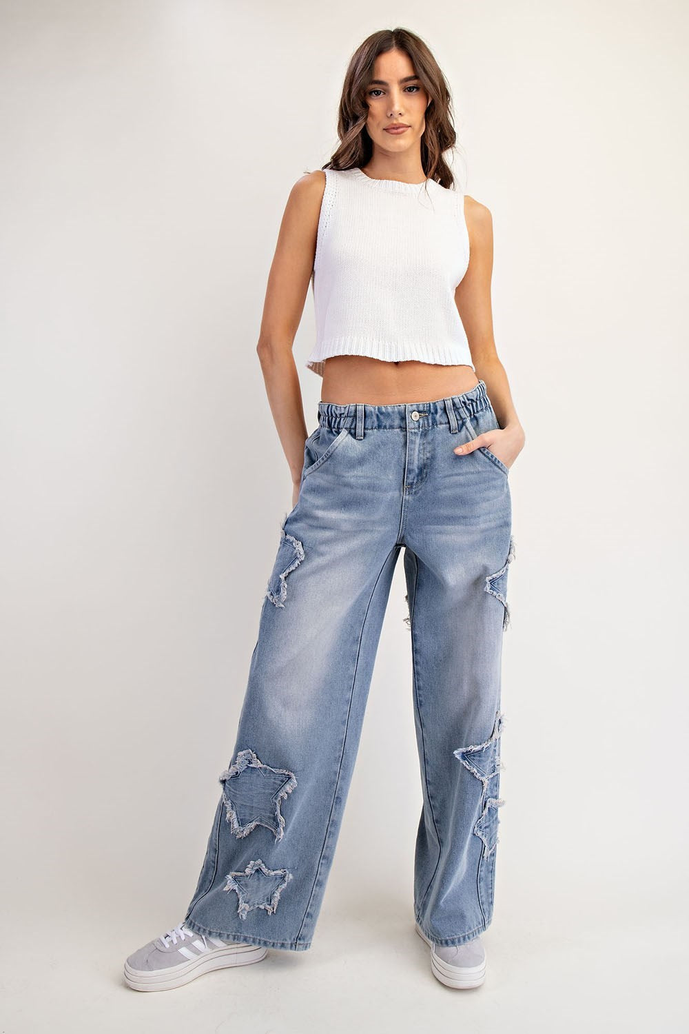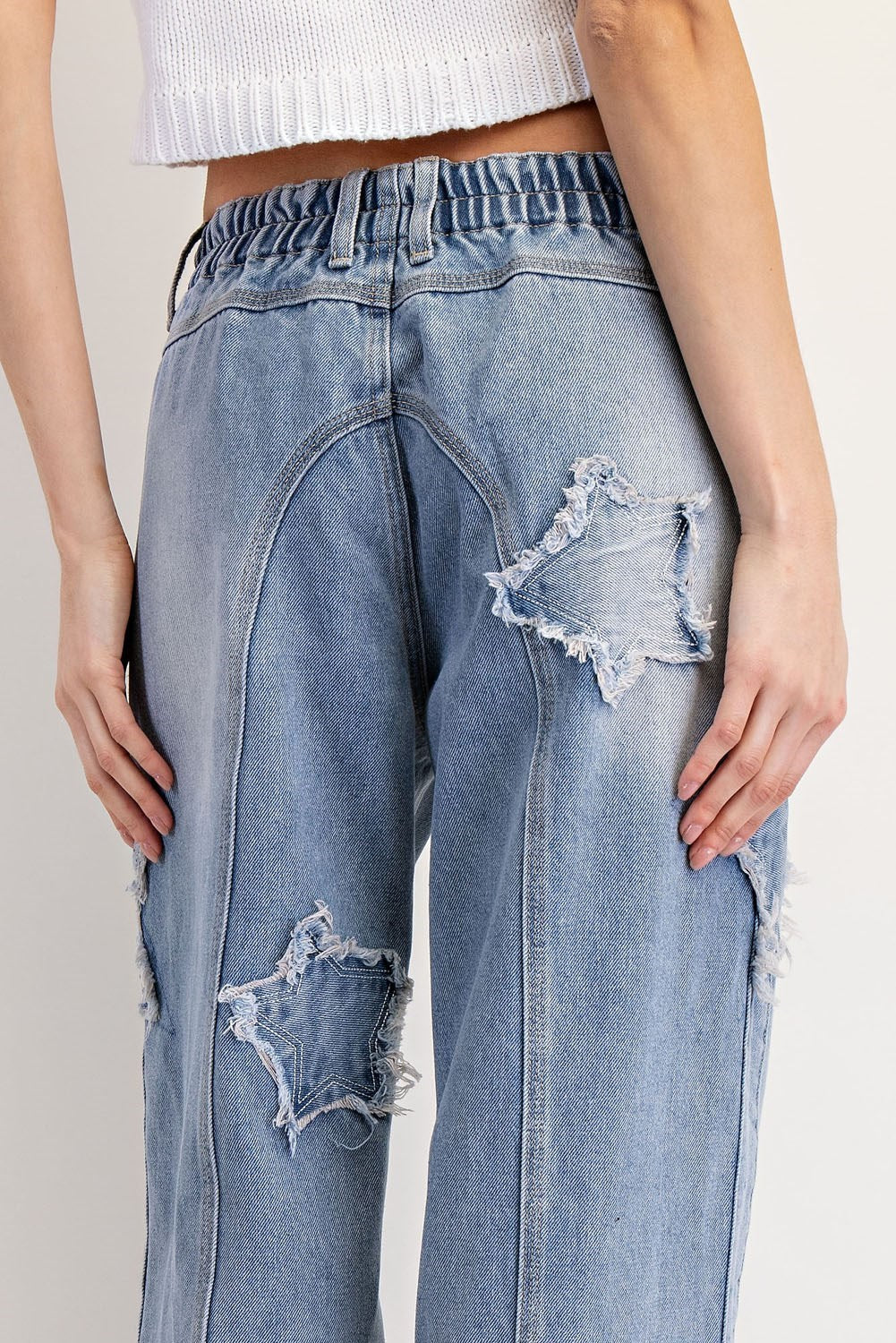 Transform your outfit with these distressed star-patched jeans! The elastic waistband offers comfortable wear, while the bold frayed star details add a unique and trendy touch. Classic five-pocket styling and added seams provide a detailed and stylish look. Elevate your style game with these frayed jeans.