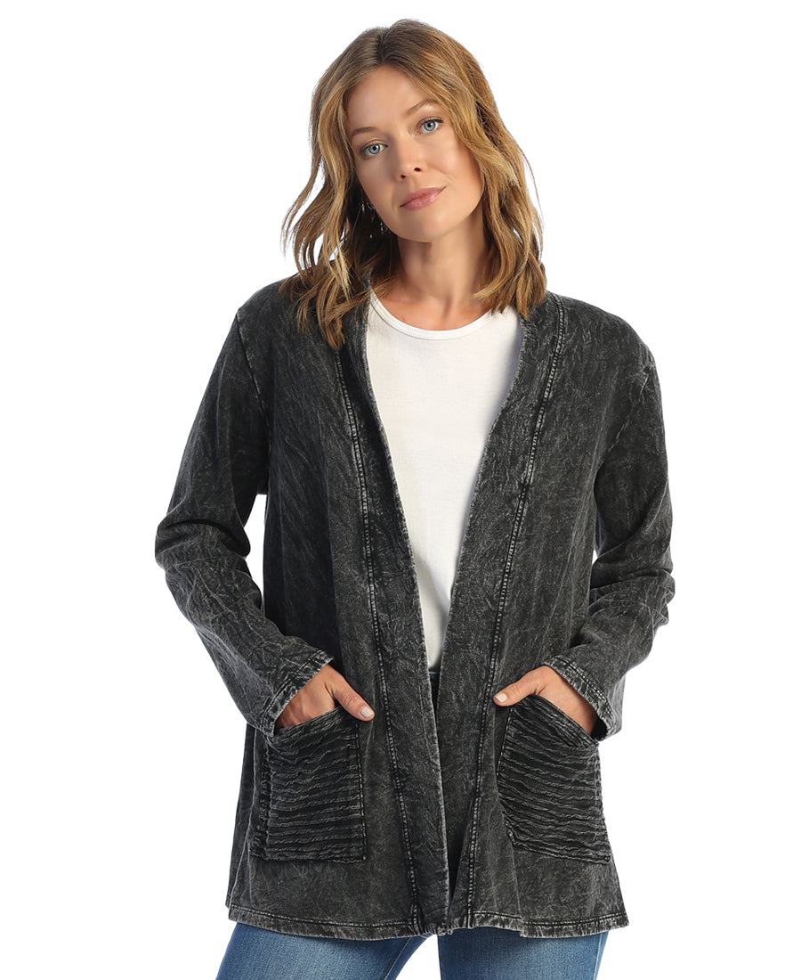 Black Mineral Washed 100% Cotton Fleece Open Cardigan With Contrast Patch Pockets