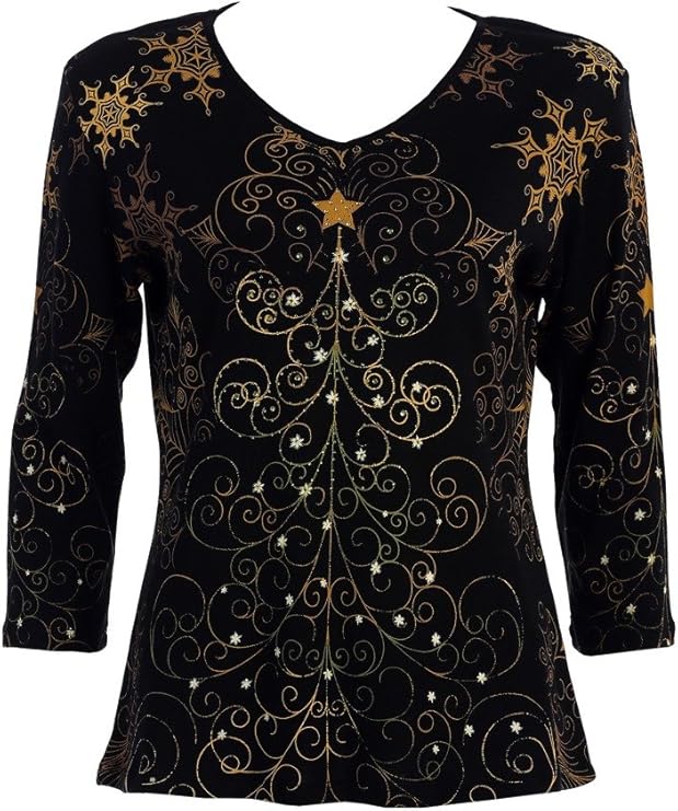 Get ready for the holiday season with our Christmas Star 3/4 Sleeve Cotton Top! This black v-neck top features a stunning gold whimsical Christmas tree with a shining star. Made with 100% cotton, it's perfect for petite ladies looking for both comfort and style. Bring some festive cheer to your wardrobe with this must-have top!