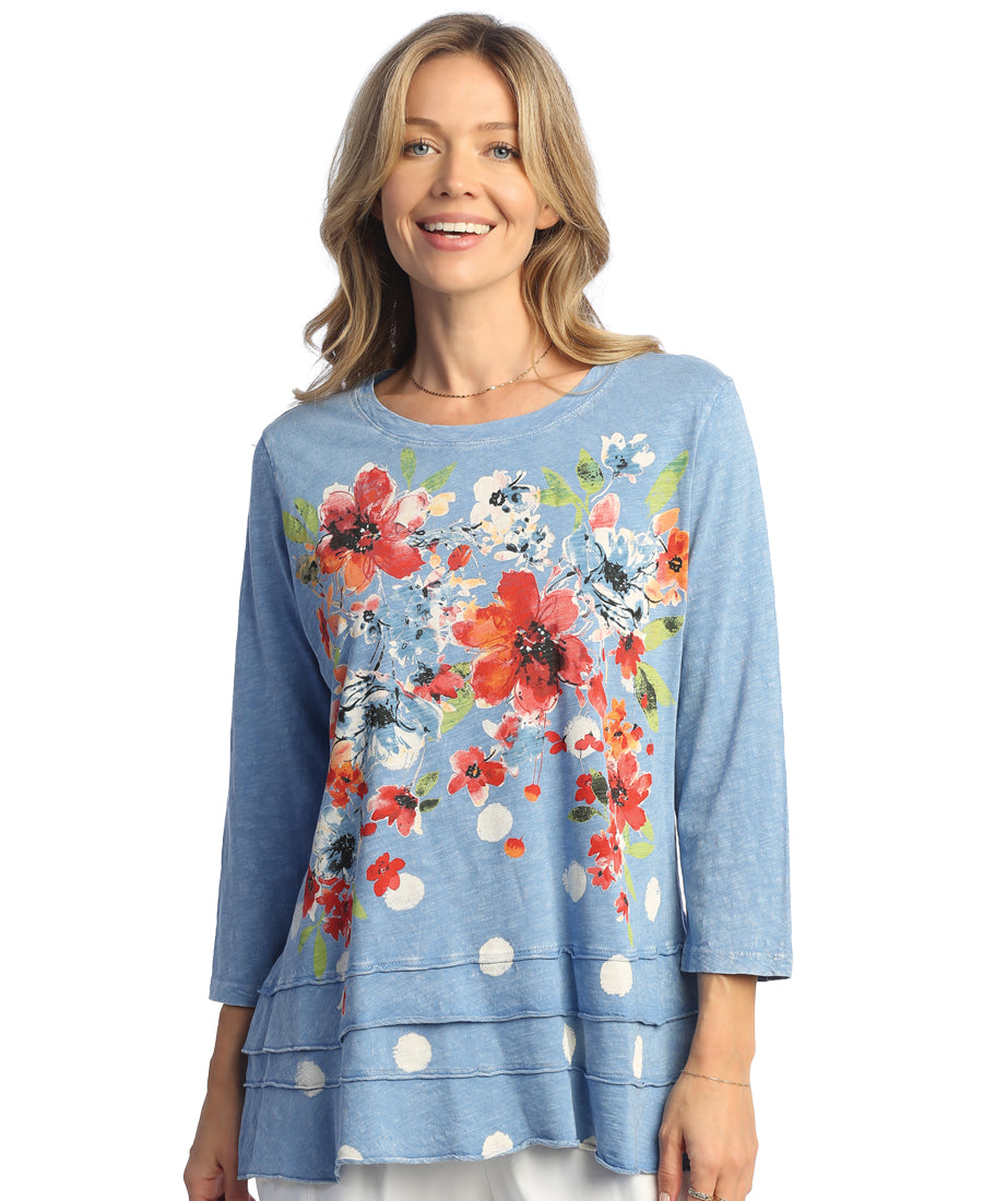 This Cornflower Mineral Washed 100% Cotton Slub Layered Tunic is perfect for warm weather fashion. The 3/4 sleeve and tiered ruffle at the bottom provide an effortless, breezy look, and the 100% cotton feel provides all day comfort. Looking for a unique statement piece with a subtle floral design? This is the tunic for you!