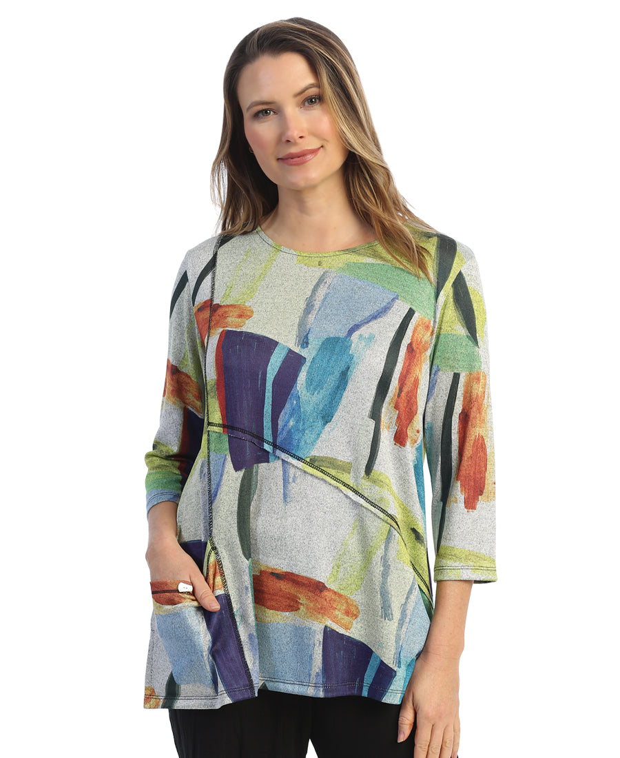 Indulge in the modern elegance of our Palette Fine Knit Contrast Seam Tunic Top. The abstract pattern and asymmetric seaming add a touch of sophistication to this 3/4 sleeve top. A buttoned pocket and scoop neck add functionality and style all in one. Elevate your wardrobe today!