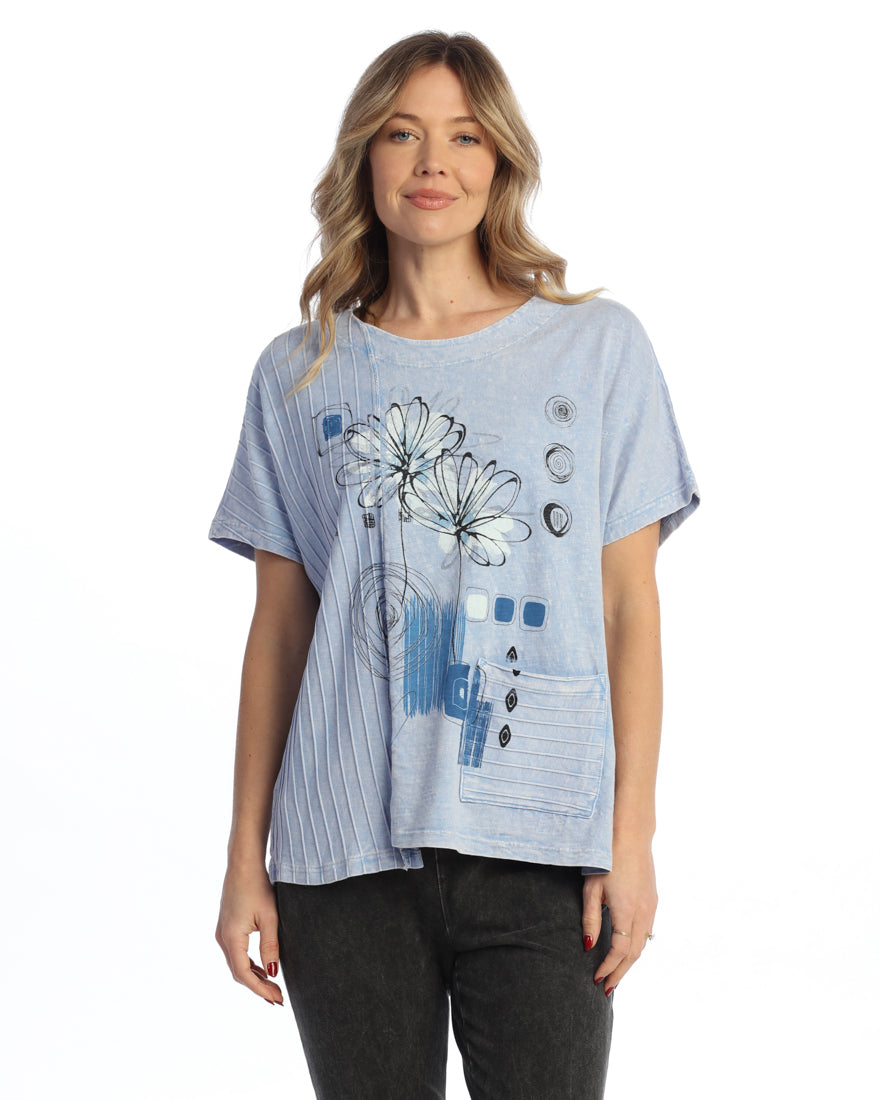 Sky Blue Flower Mineral Washed Cotton top with Rib Accents