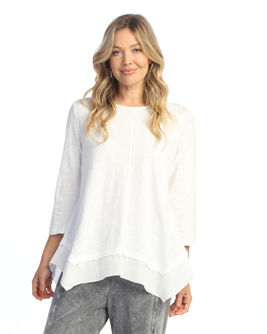 Elevate your wardrobe with our white cotton top featuring a unique Merrill edging and a linen handkerchief hemline. The perfect blend of style and comfort, this 3/4 sleeve top will add a touch of sophistication to any outfit. Make a statement and stand out from the crowd with this one-of-a-kind piece.