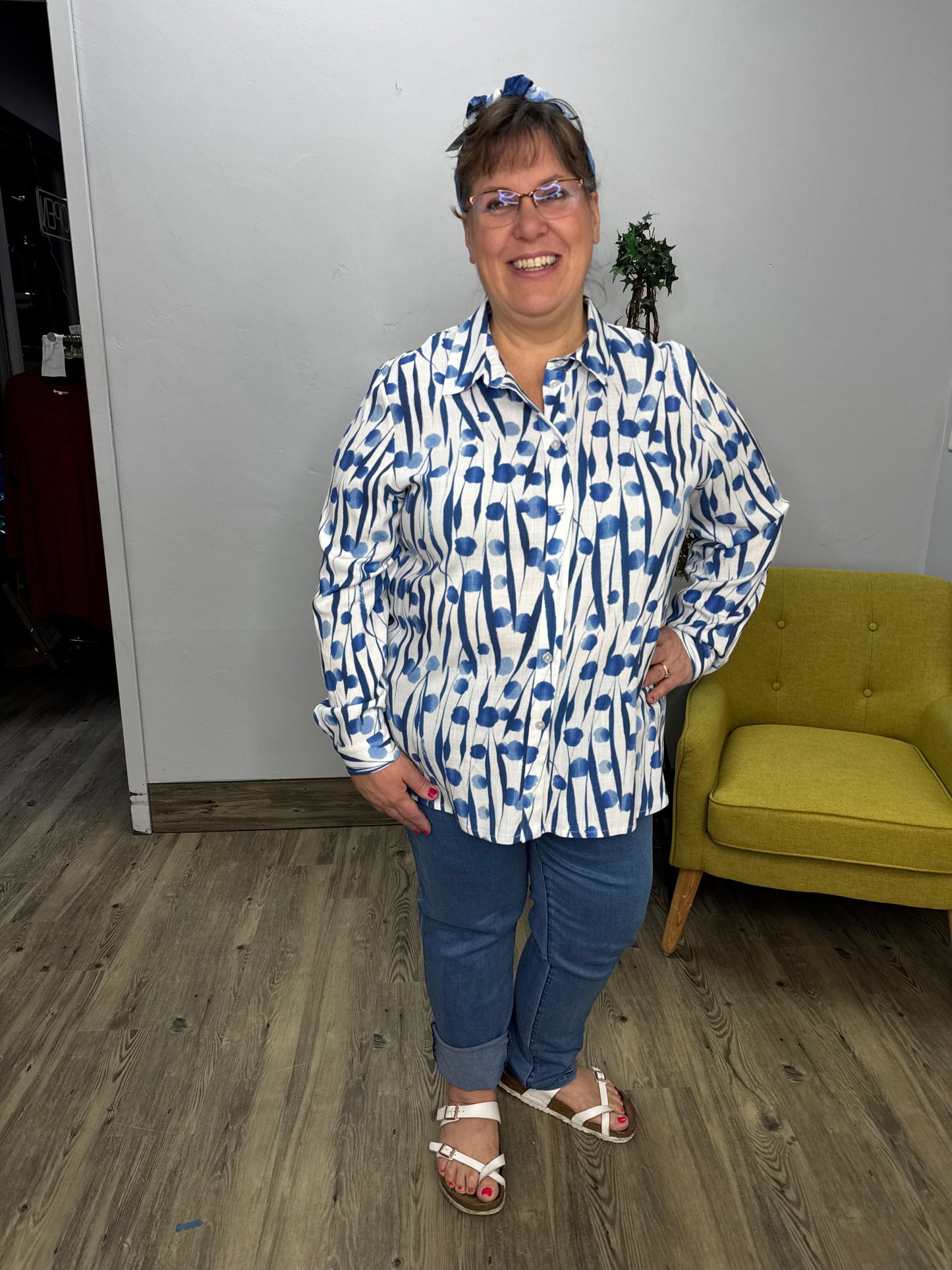 Blue Dots Pattern Long Sleeve Button Down Collared Top