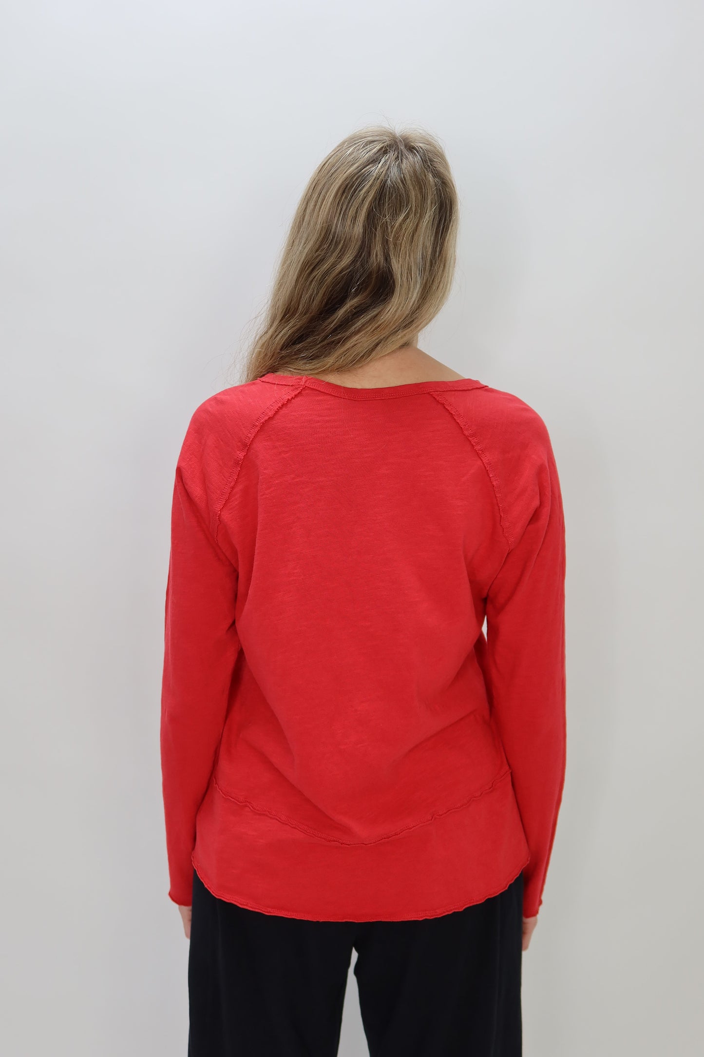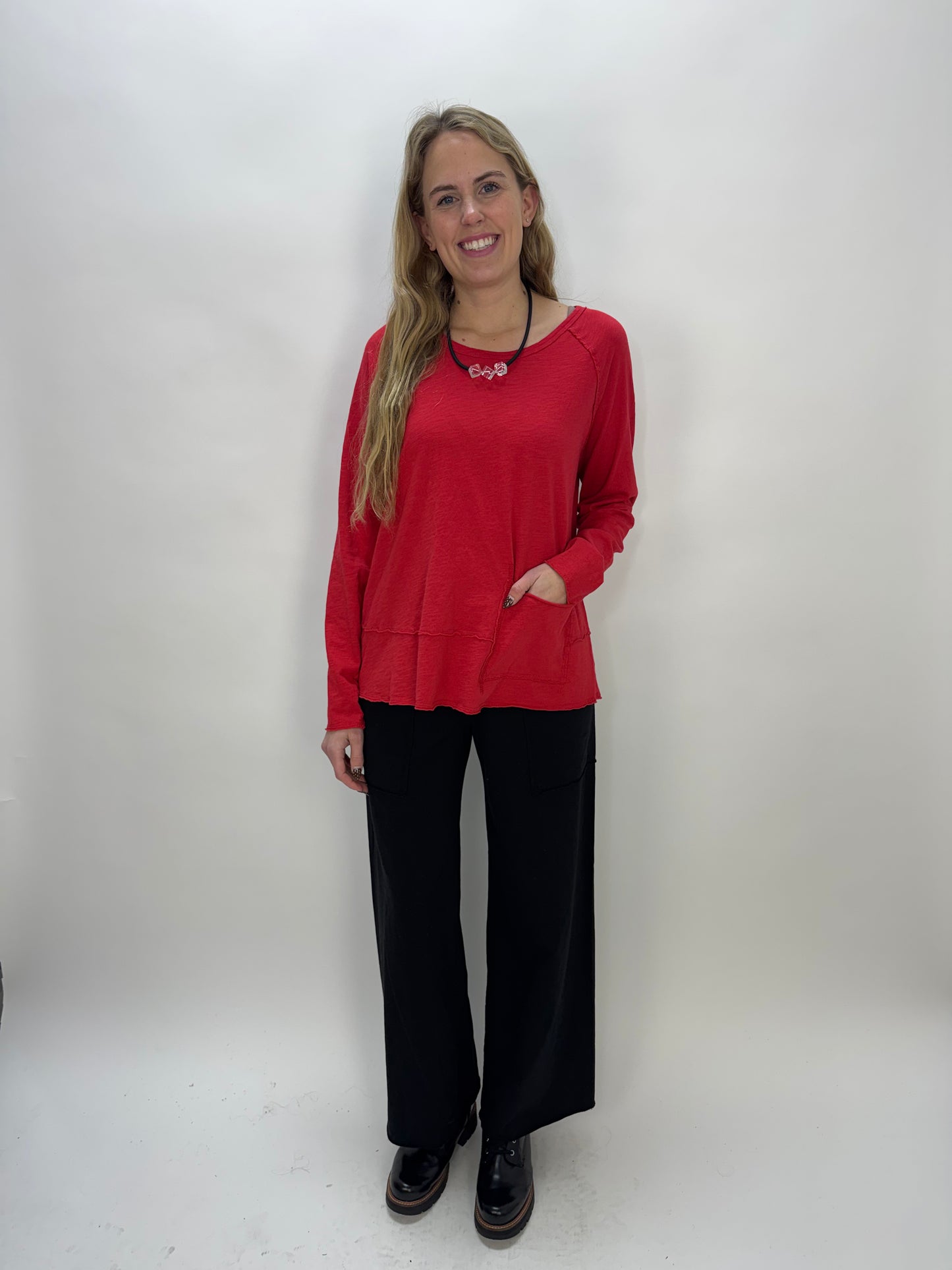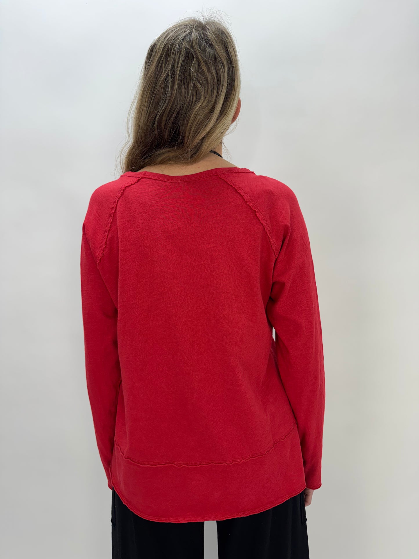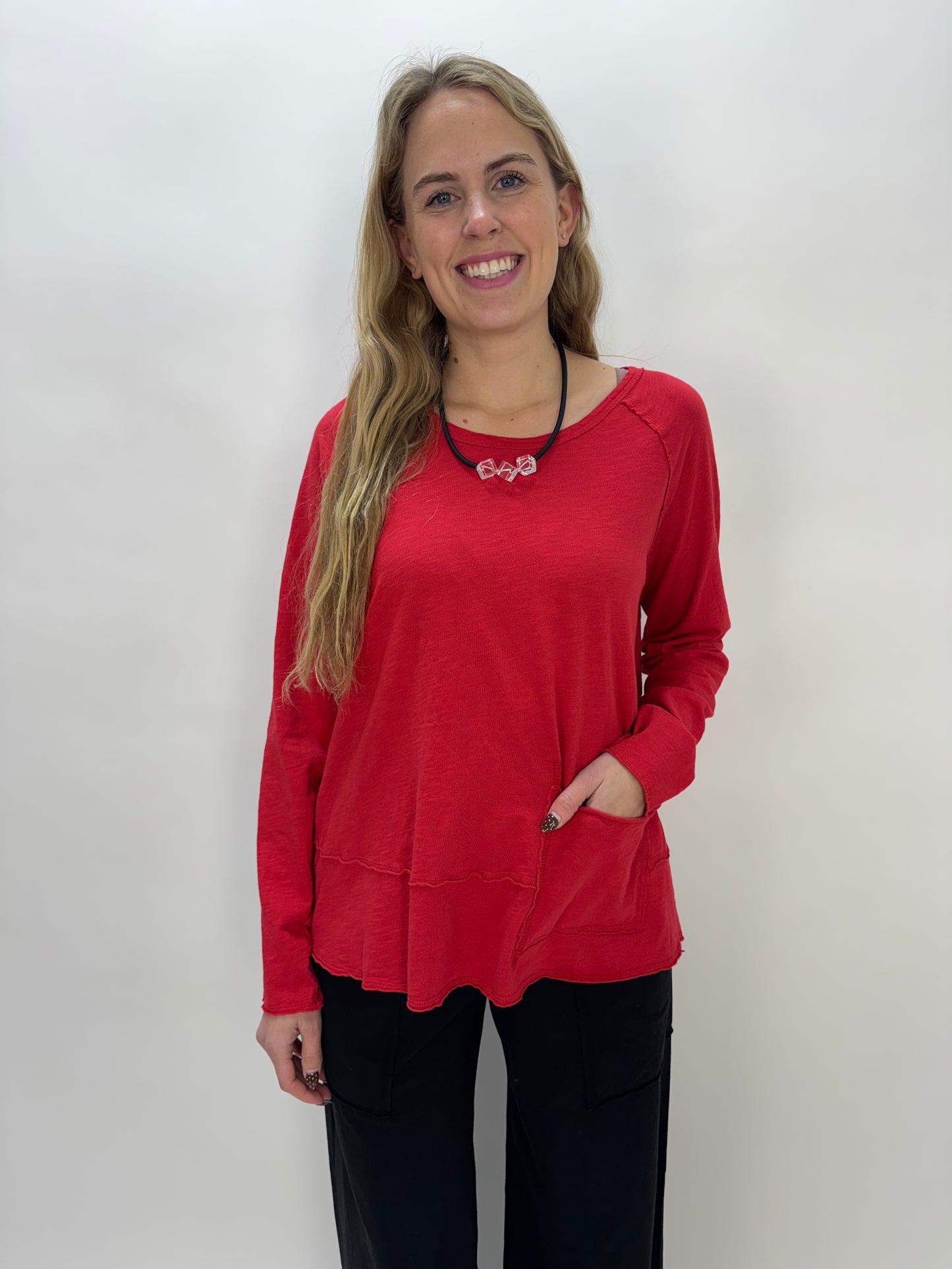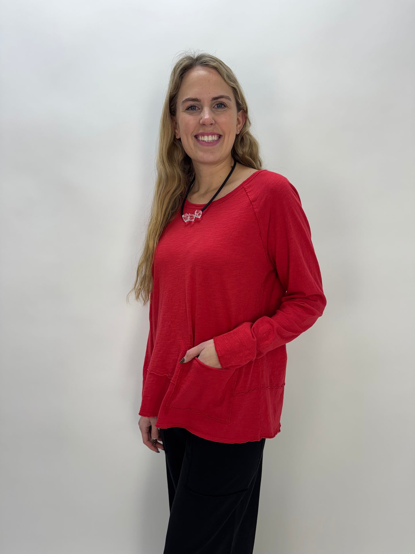 Red Cotton Slub Long Sleeve Top with Pocket