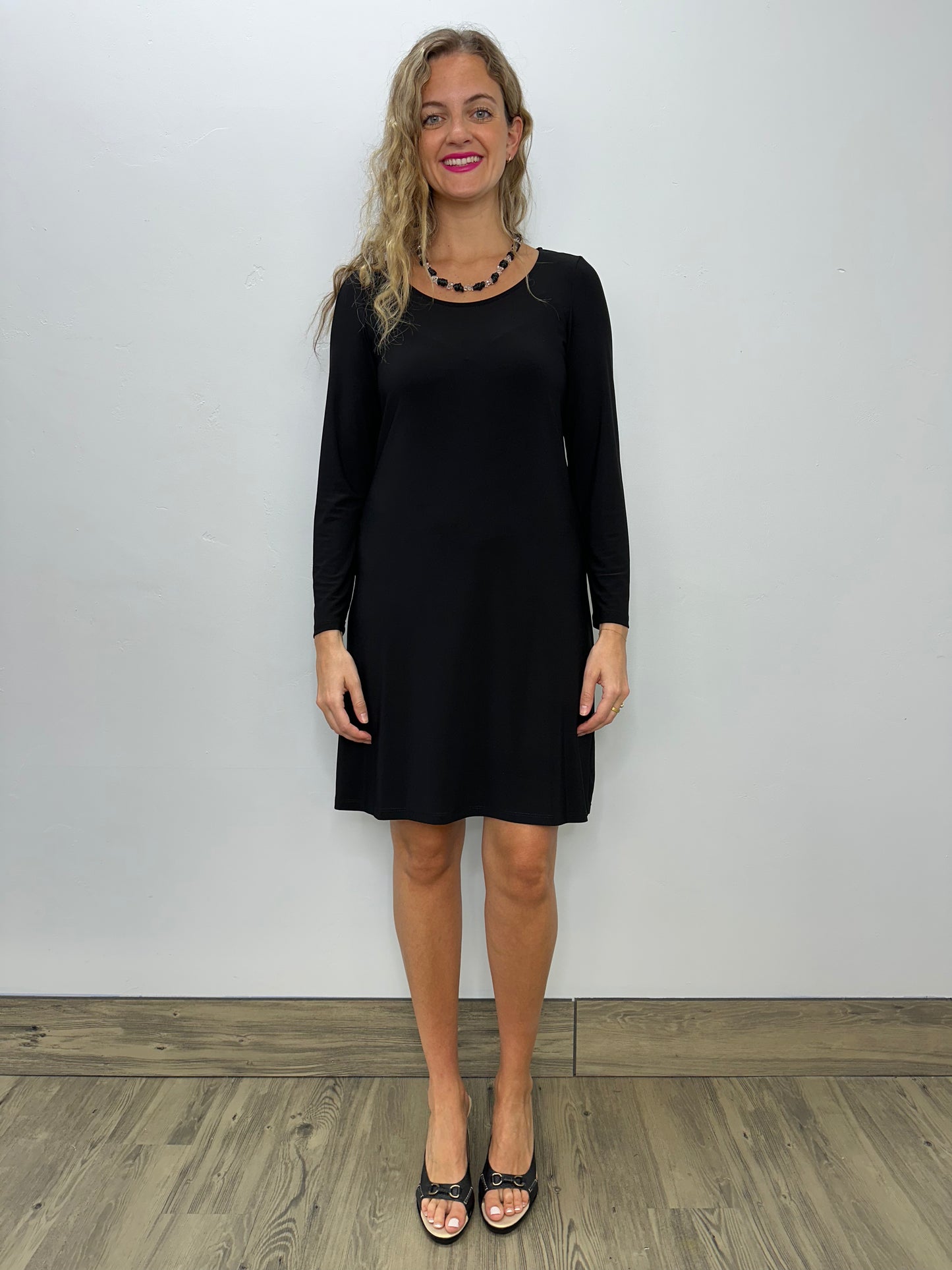 Effortlessly chic and versatile, our black long sleeve scoop neck dress is the ultimate wardrobe staple. With a knee length cut and timeless design, it offers a simple yet elegant look that can be dressed up or down for any occasion. Elevate your style with this must-have piece!