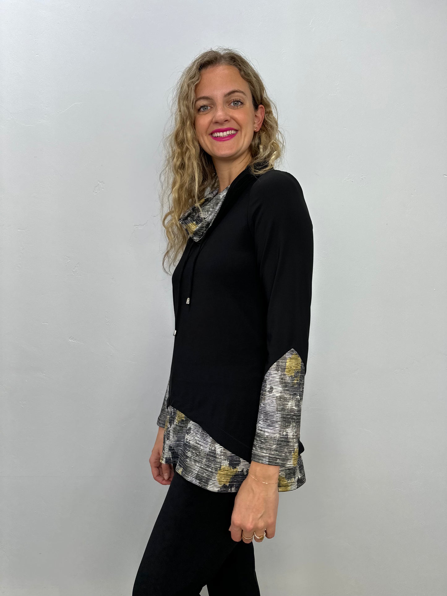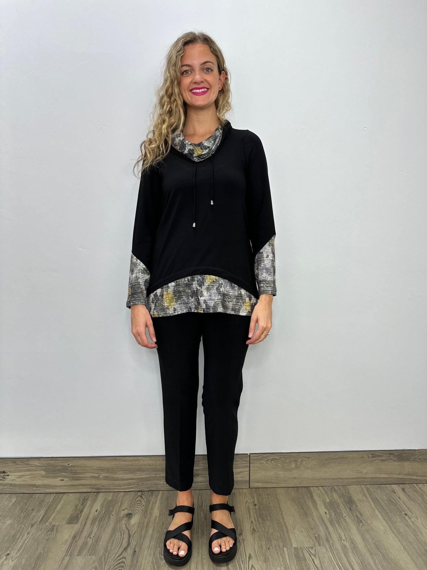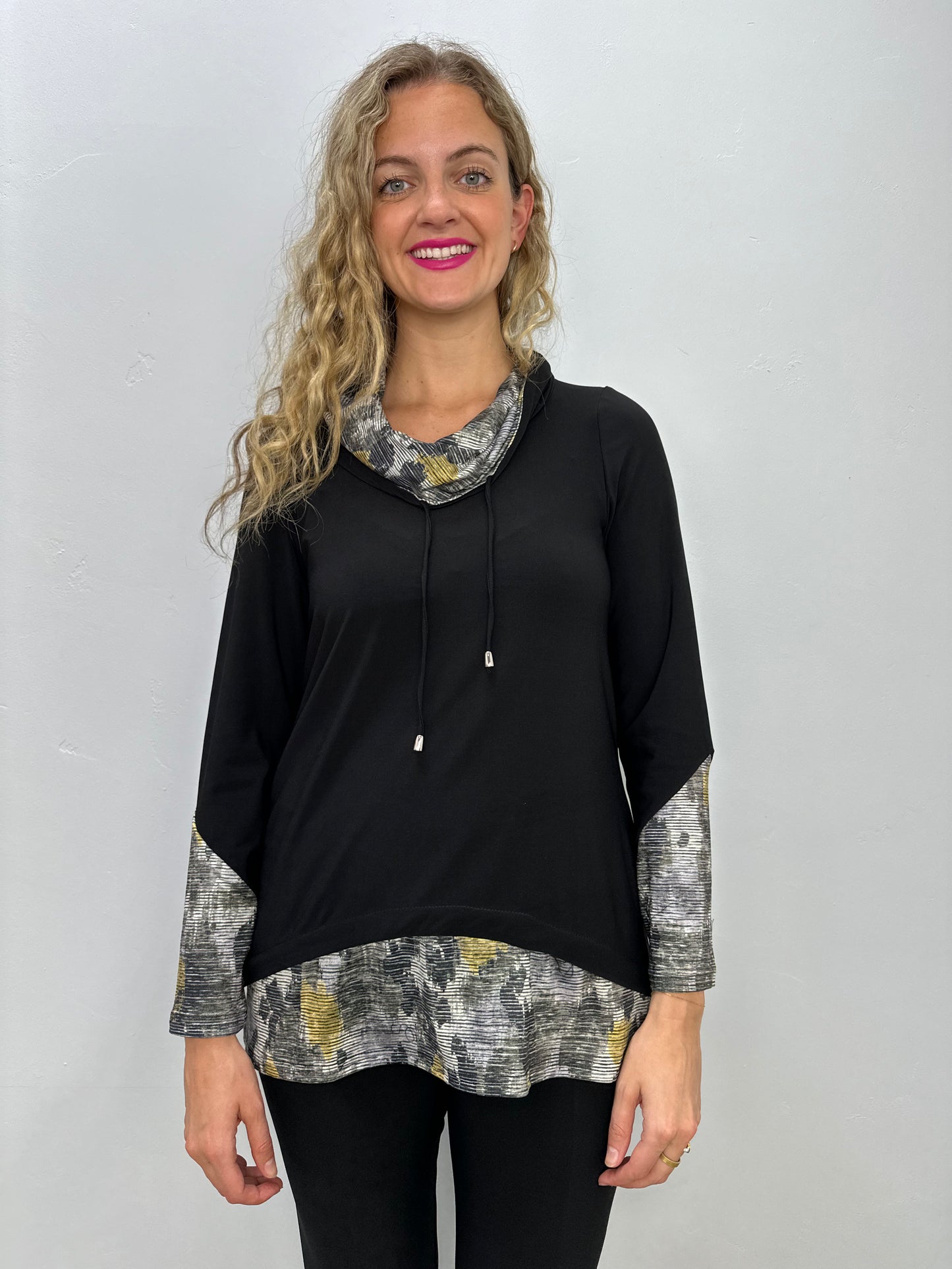 Regular price $71.40This ultra-cozy top features a stylish cowl neck and draw string for a trendy tunic look. The cute sleeves add a touch of charm, making it the perfect addition to your wardrobe. Look and feel great in this black pattern ITY top!
