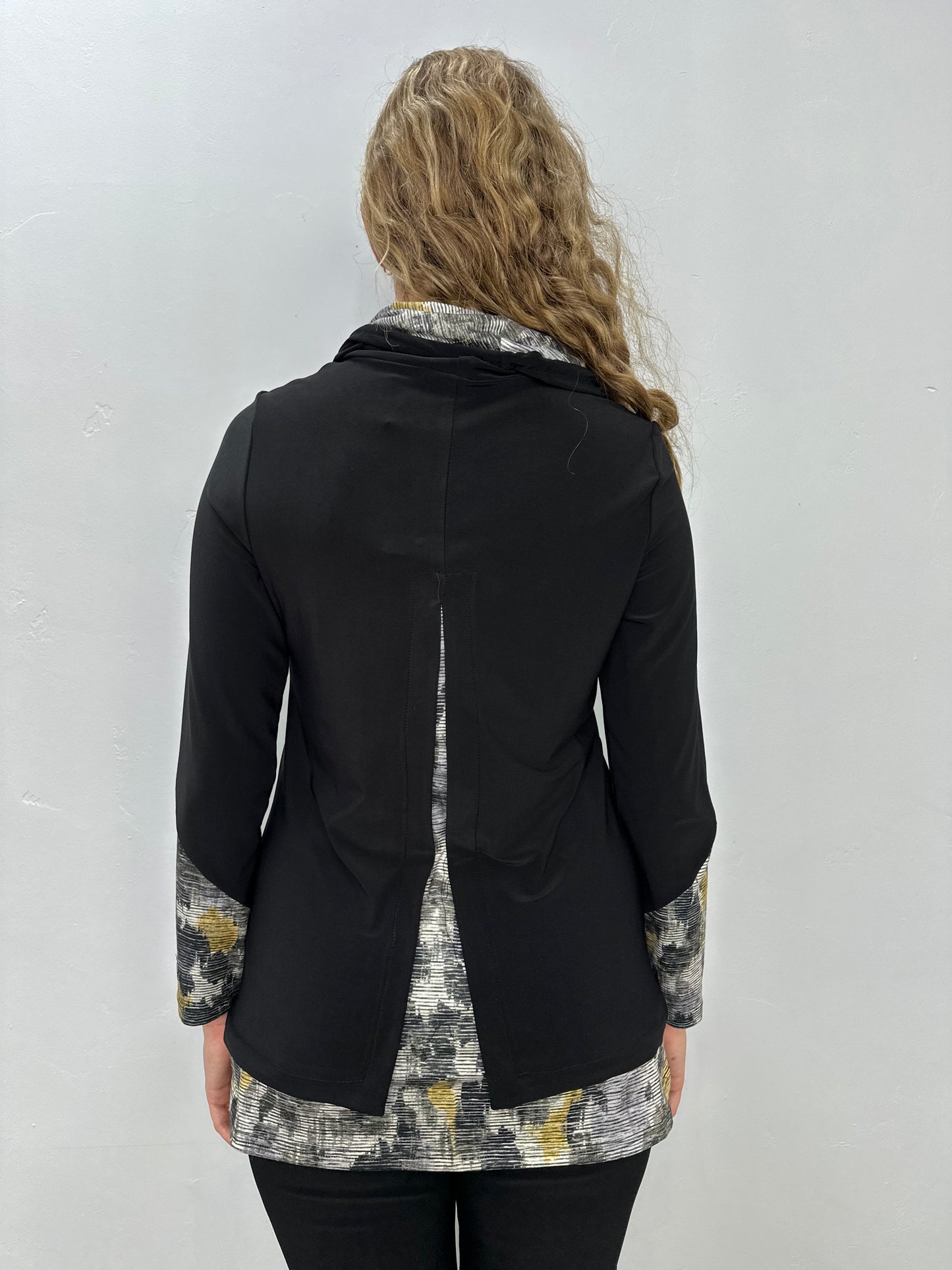 Black Pattern ITY Long Sleeve Draw String Cowl Neck Top