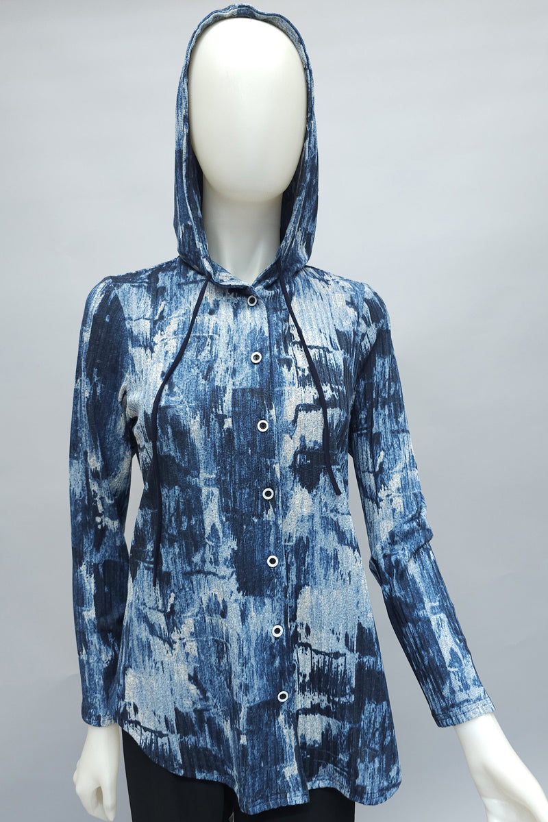 Denim Blue Print Button Down Hooded Top