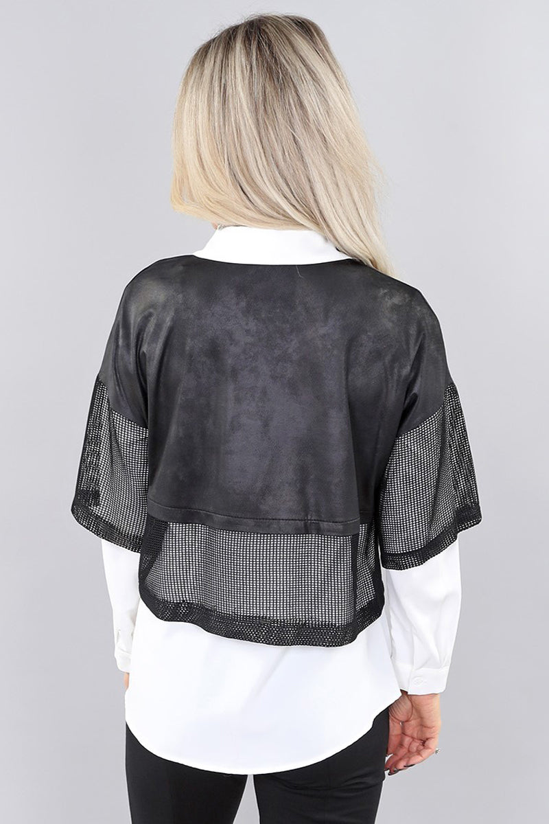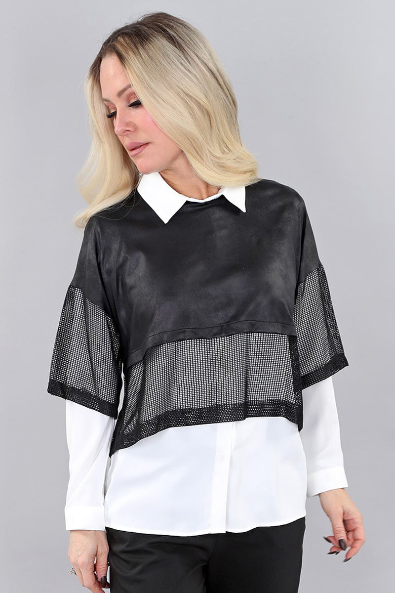 Elevate your wardrobe with this double layered black and ivory collared shirt, designed as two separate pieces for versatile styling. The faux leather top adds a bold, fashionable edge, while the layering creates a chic and unique look. Perfect for making a statement effortlessly, this shirt combines edgy materials with classic design for a standout outfit.