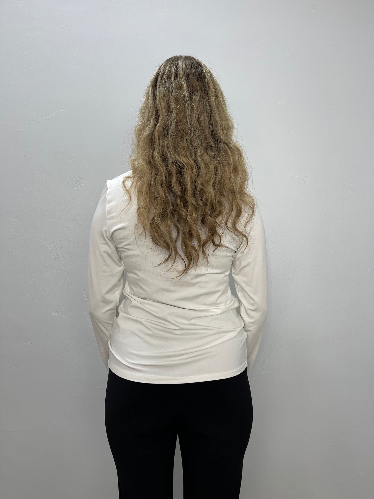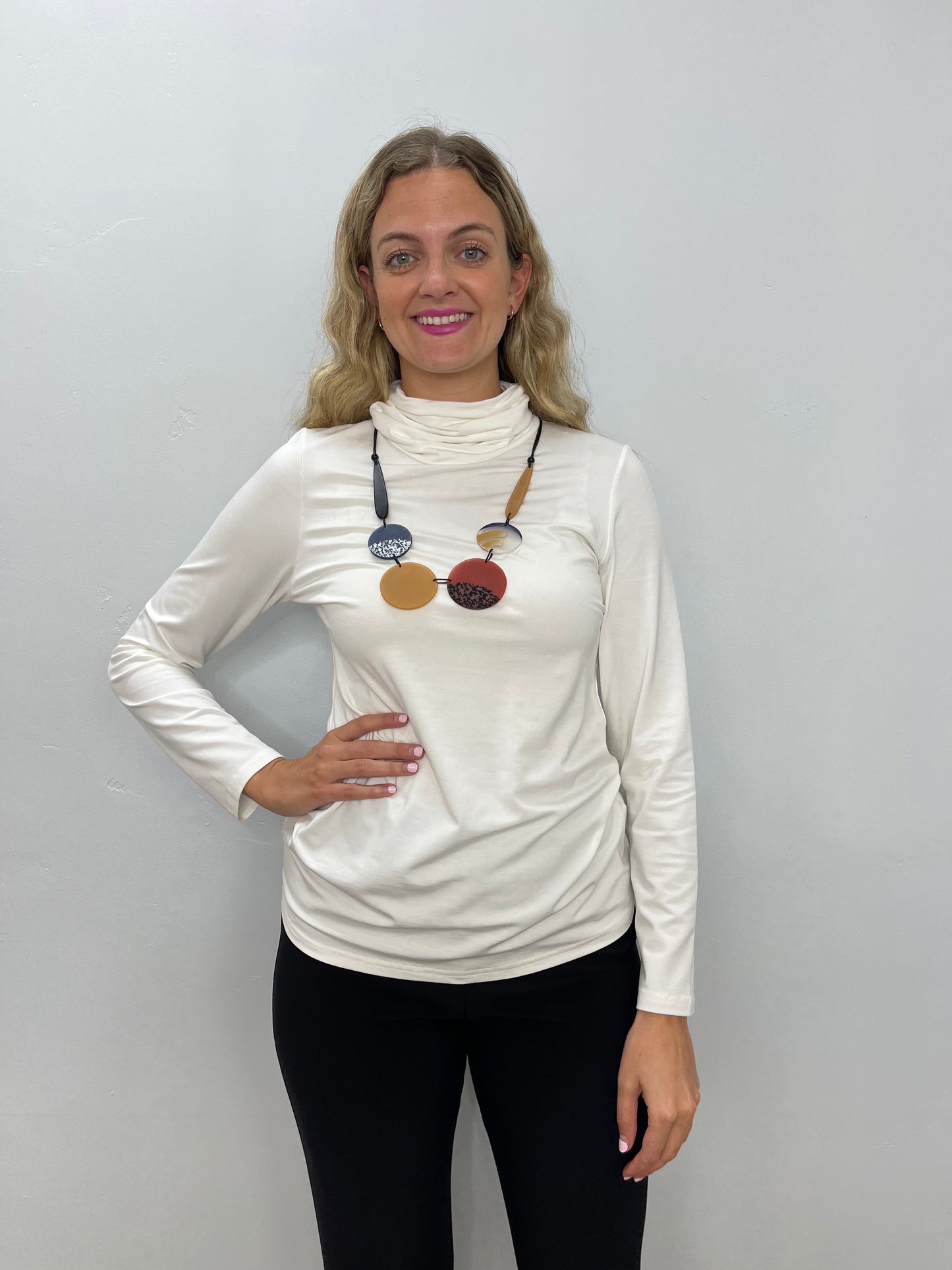Beautiful Ivory long sleeve turtle neck is a very soft bamboo knit. It is perfect to wear along or to layer for a cold winter day underneath a sweater.