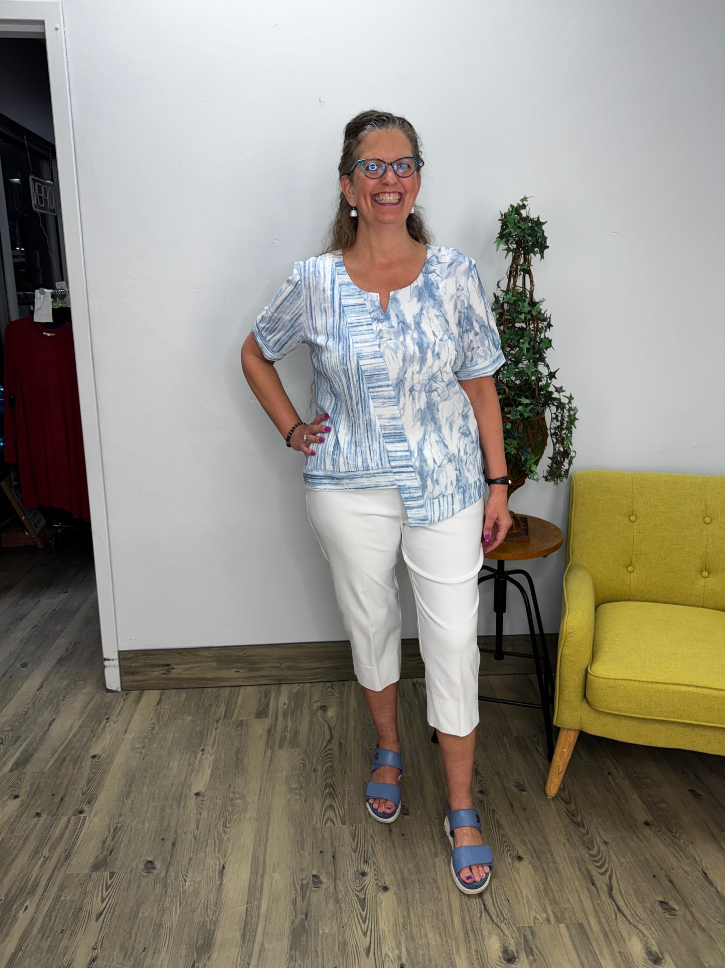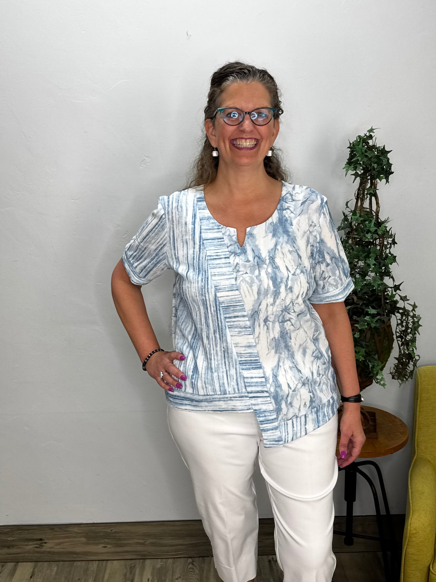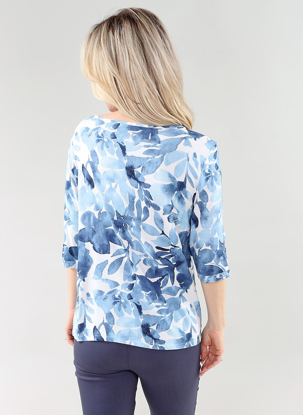 Blue Watercolor Flowers Detail 3/4 Sleeve Top