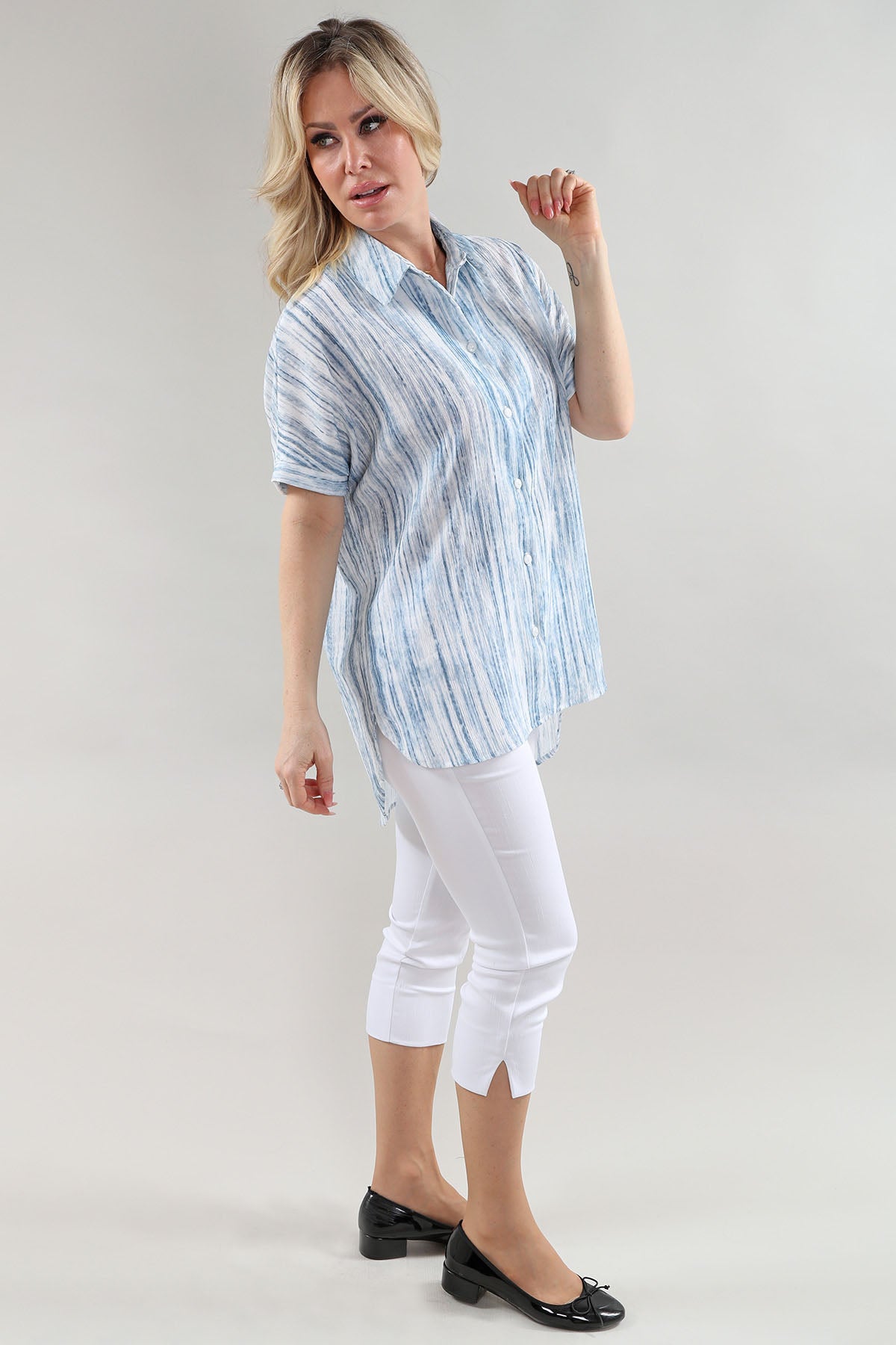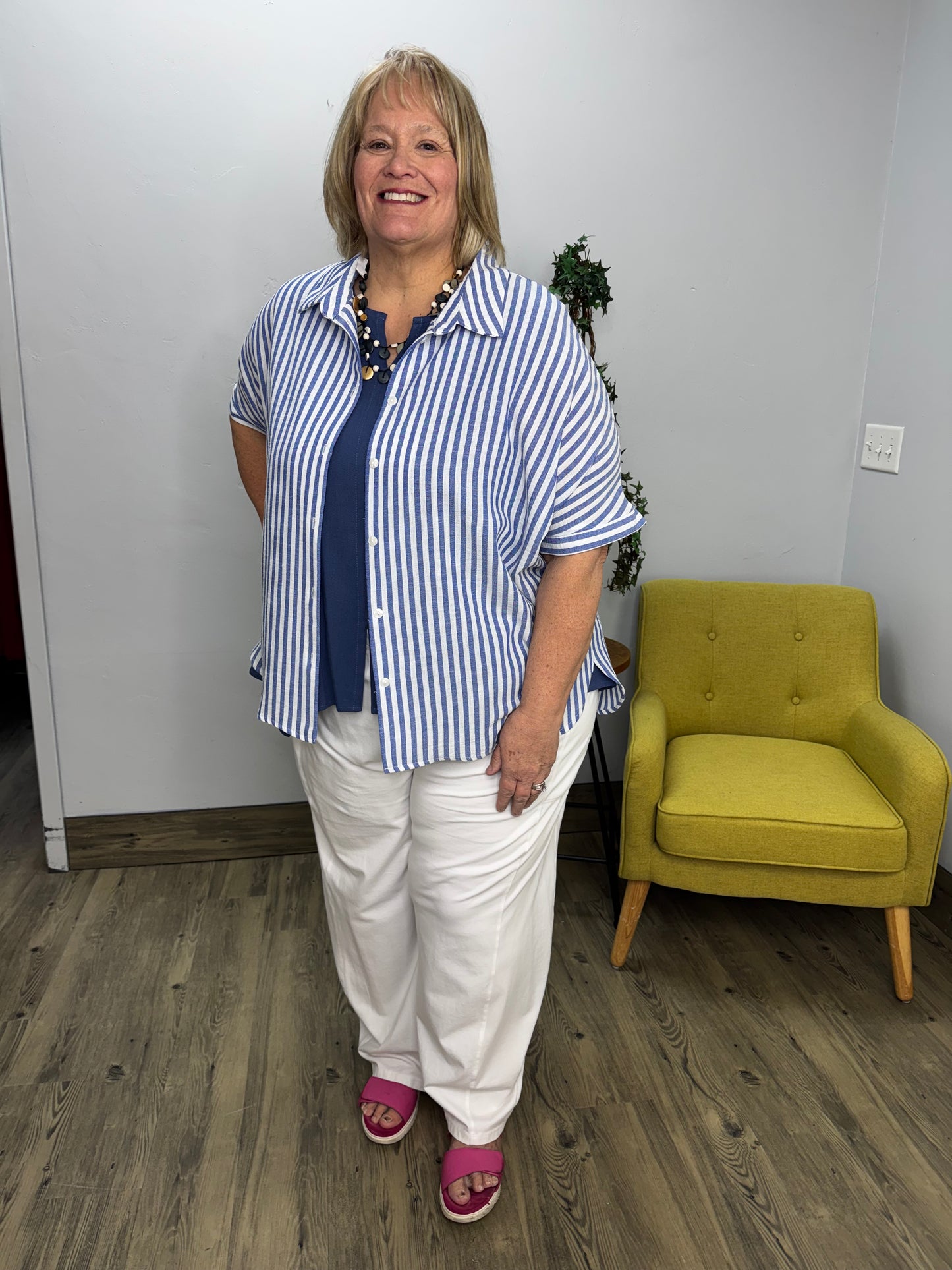 Blue and White Stripe Crepe Short Sleeve Button Down Top