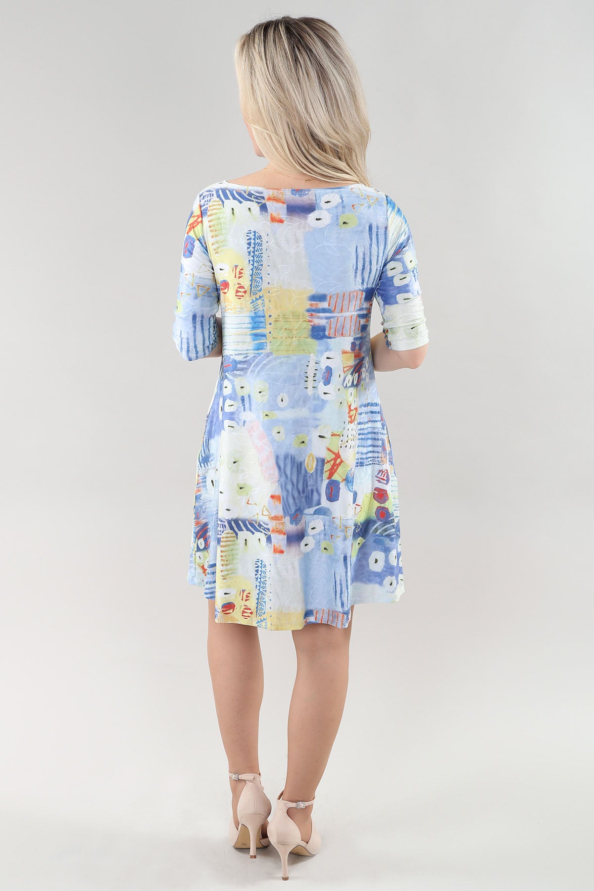 Blue and Orange Pattern Textured Elbow Sleeve Dress