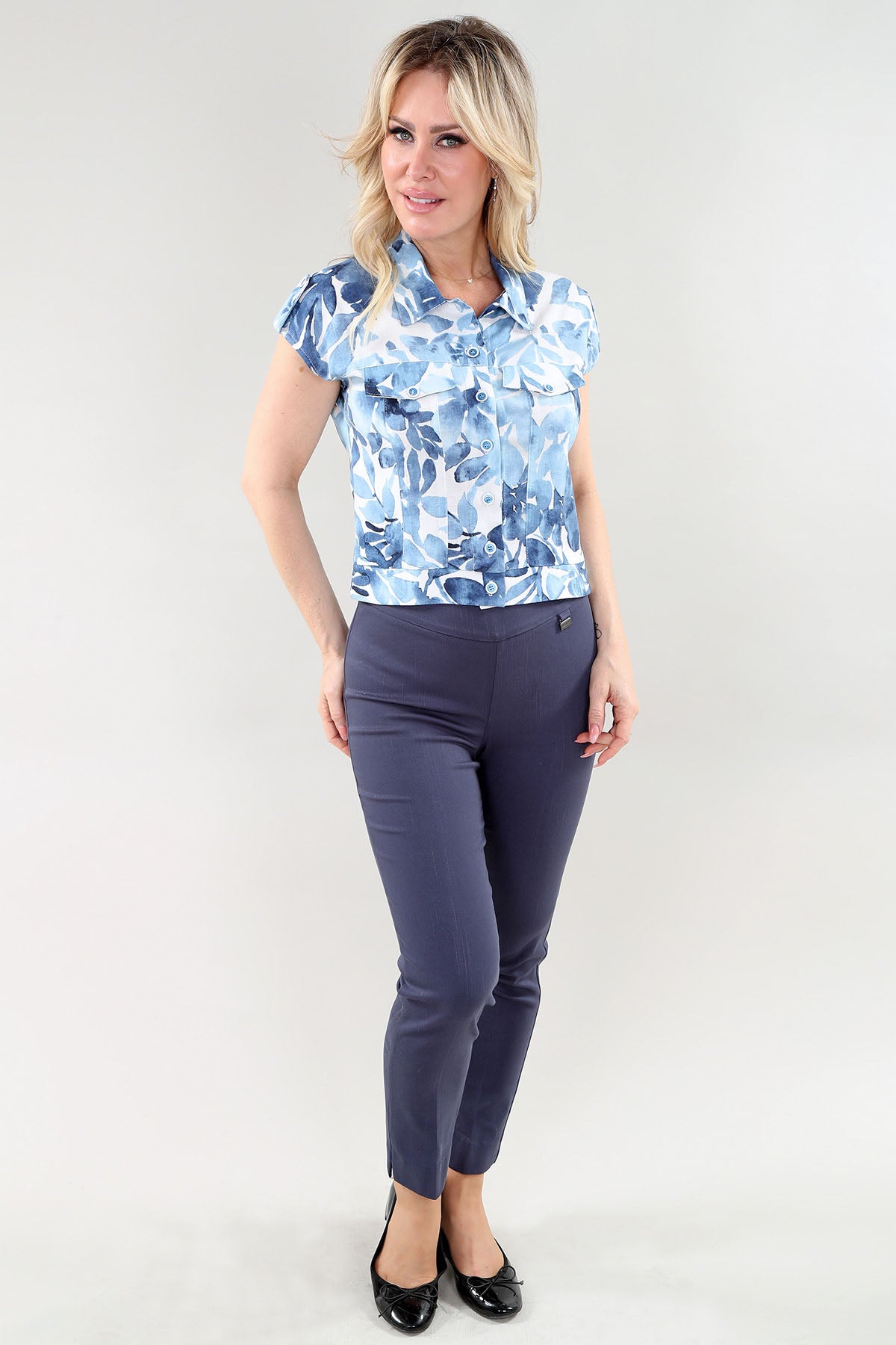 Blue Short Sleeve Button Down Top